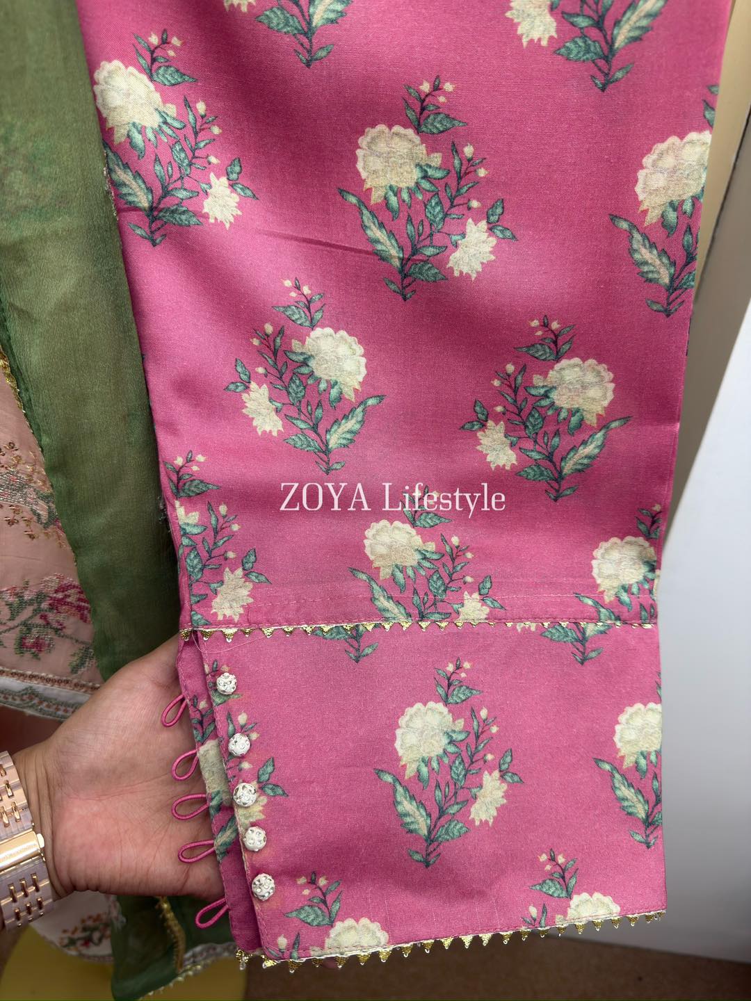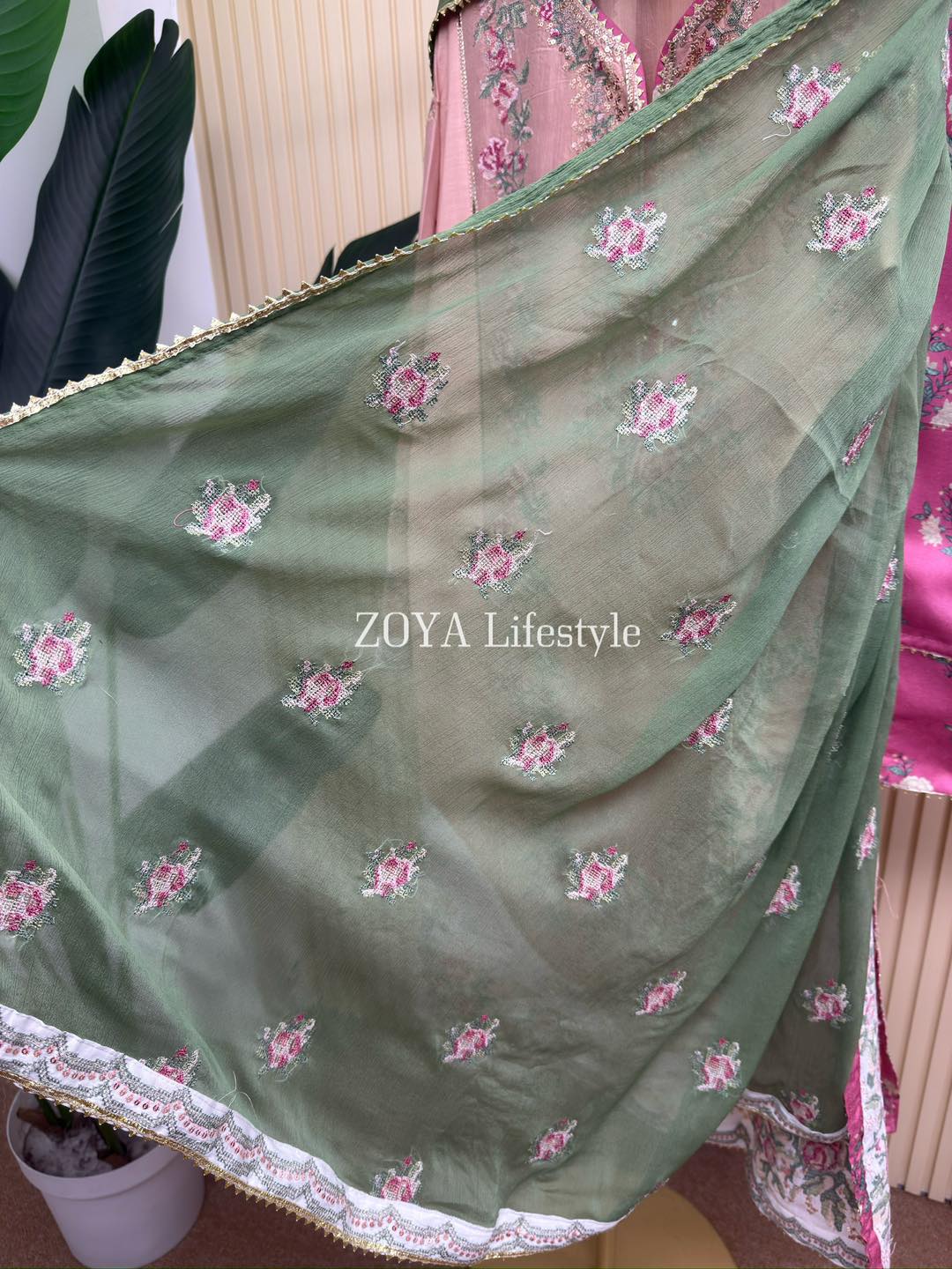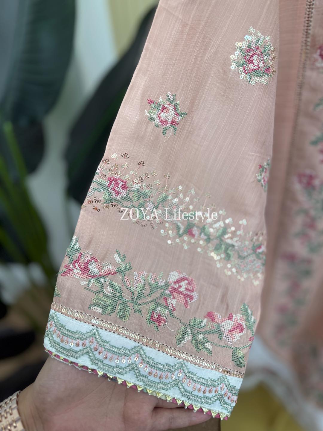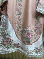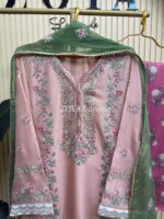 Material: Rayon cotton with cross embroidery and sequins work on all over body front. Rayon Silk cotton printed pant. Chiffon embroidered dupatta with jori lace.