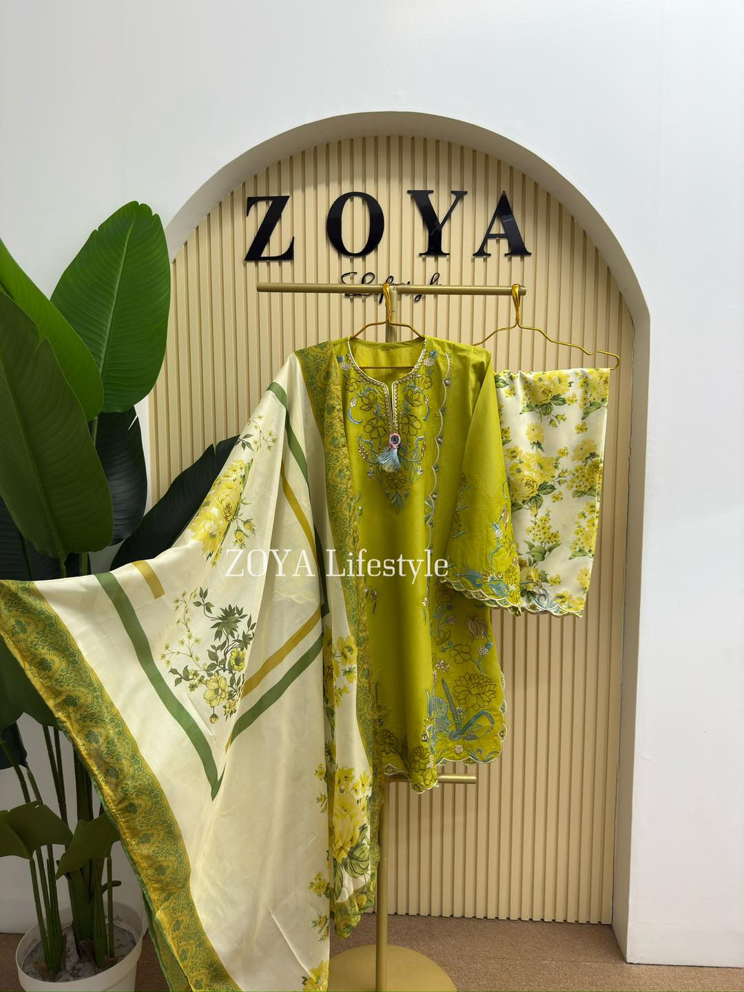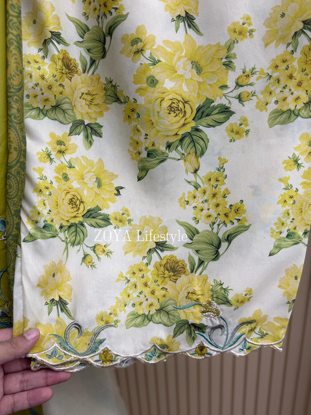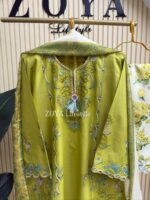 Material: Jaquard Cotton kamiz with embroidery work on full body. Loose Pant Cotton printed with embroidered border. Premium silk printed dupatta.