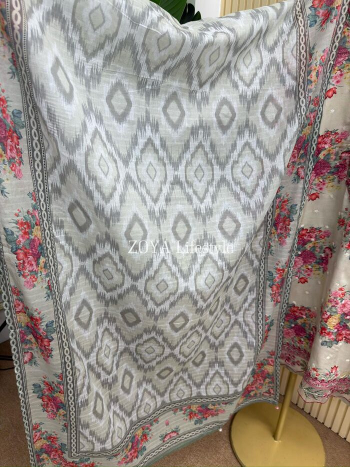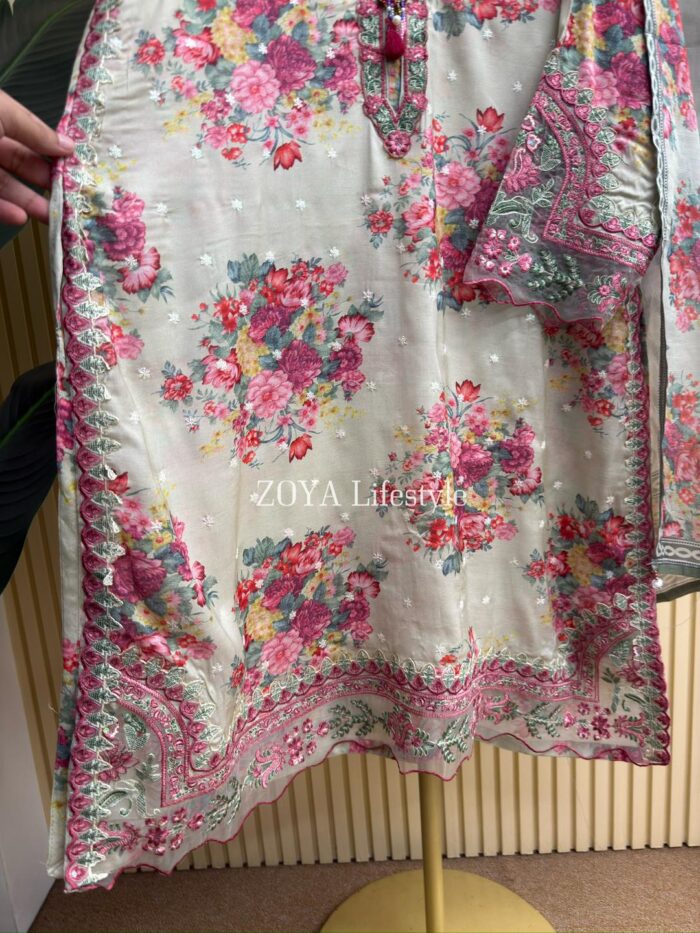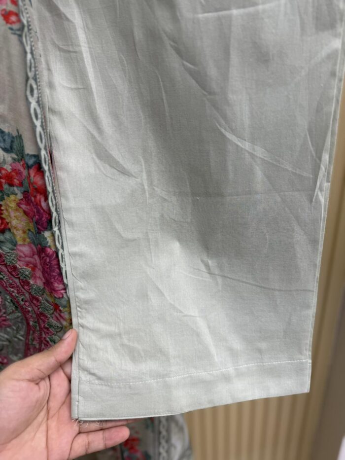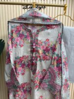Material: Rayon Cotton kamiz with all over embroidery work. Maslin embroidered pannel work on neck, sleeves, front side borders and front side Damaan. Kota cotton printed orna. Pant Cotton.