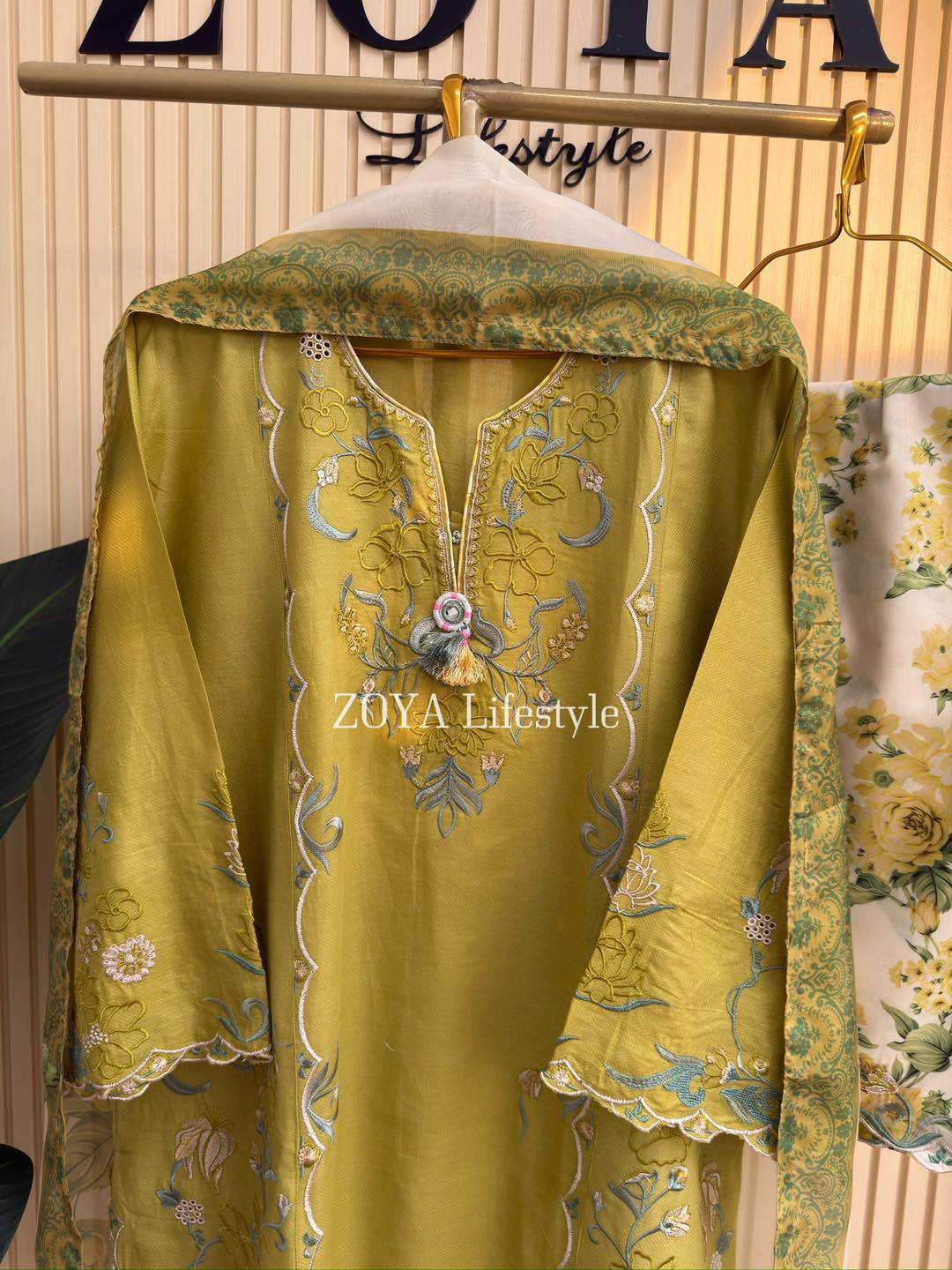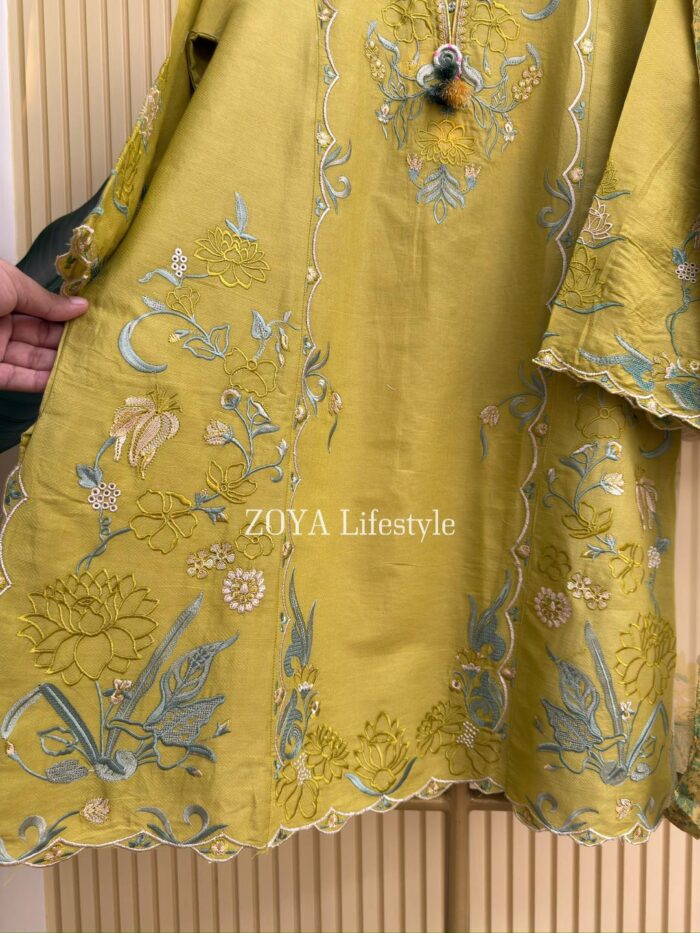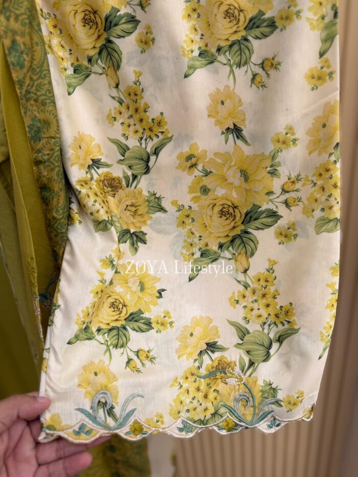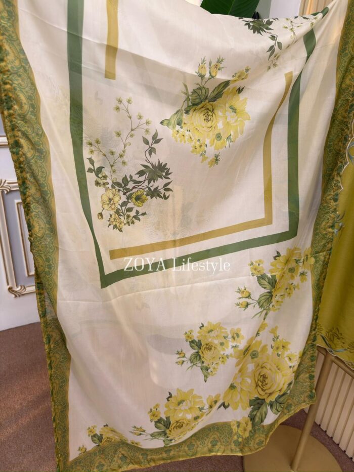 Material: Jaquard Cotton kamiz with embroidery work on full body. Loose Pant Cotton printed with embroidered border. Premium silk printed dupatta.