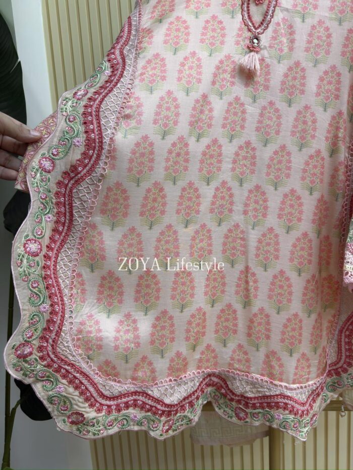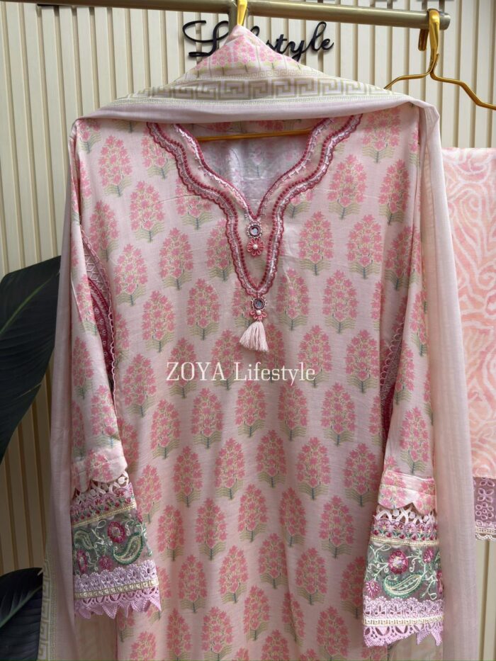 Material: Rayon Cotton kamiz with embroidery work on neck, side border, sleeves and damaan. Loose Pant rayon Cotton printed with embroidered border. Kota cotton printed dupatta.