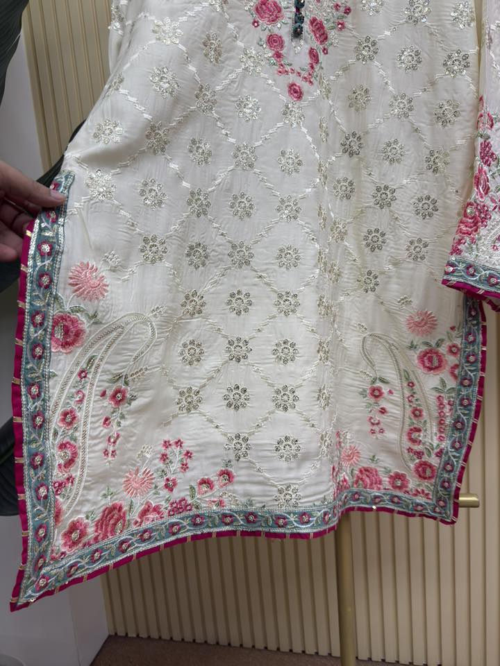 Material: Premium rayon with heavy embroidery and sequins work on all over body front. Inner attached. Rayon Cotton pant with embroidery & sequins work.