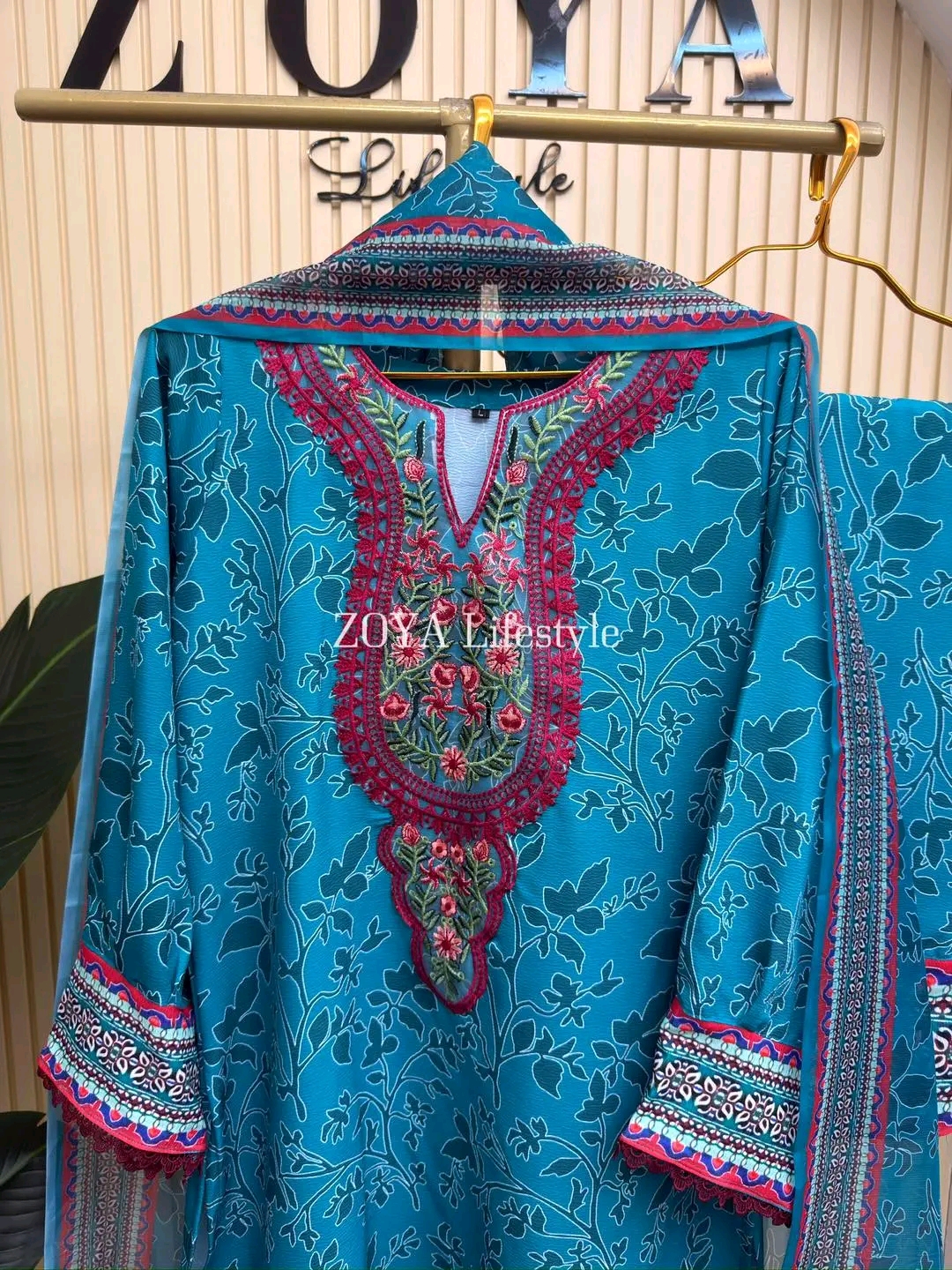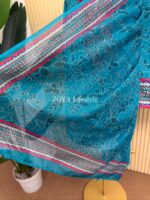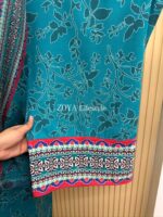 Material: Printed crepe Georgette with embroidery work on neck. Lace border on sleeves and damaan. Pant printed crepe Georgette. Orna georgette printed.
