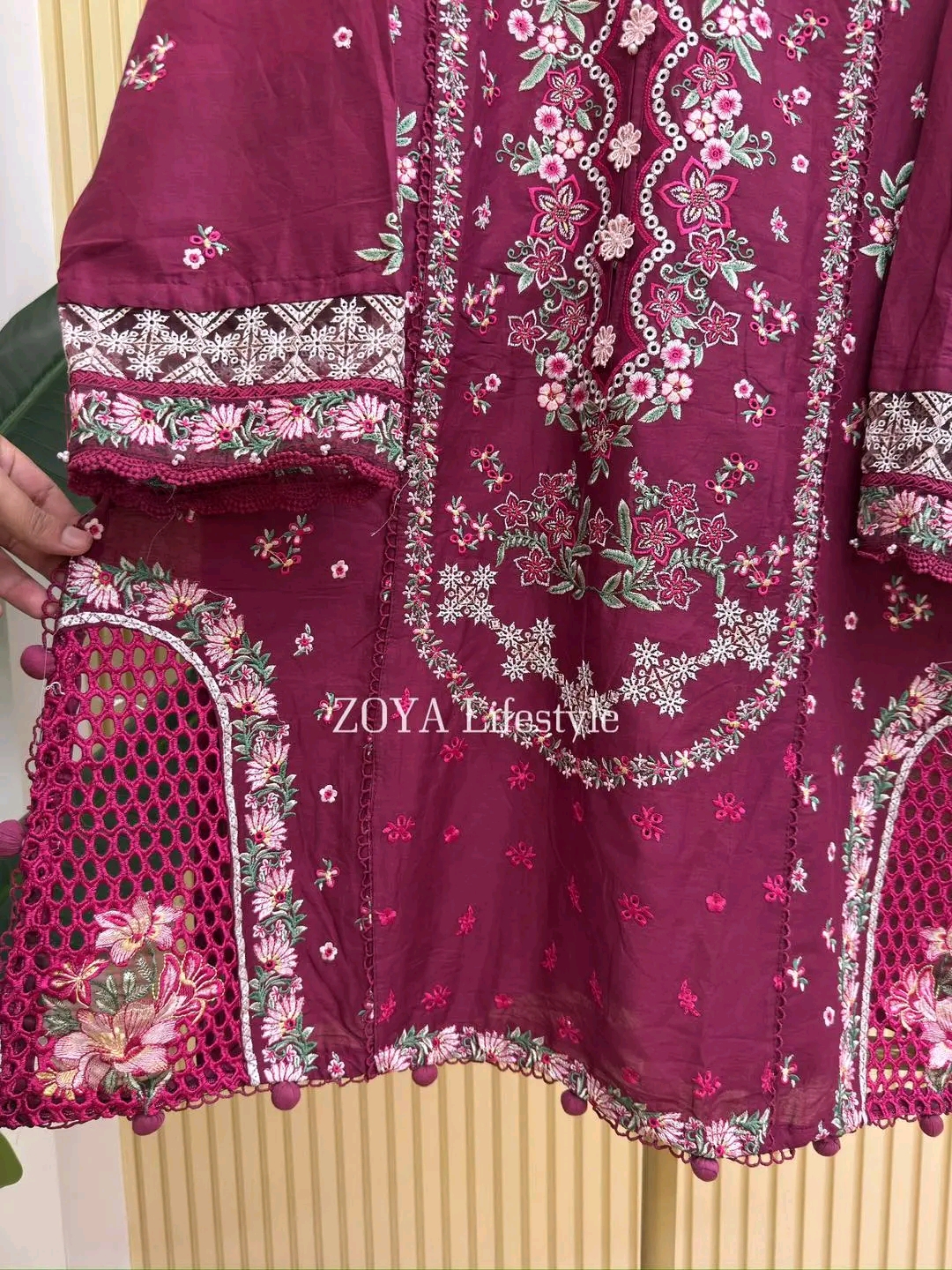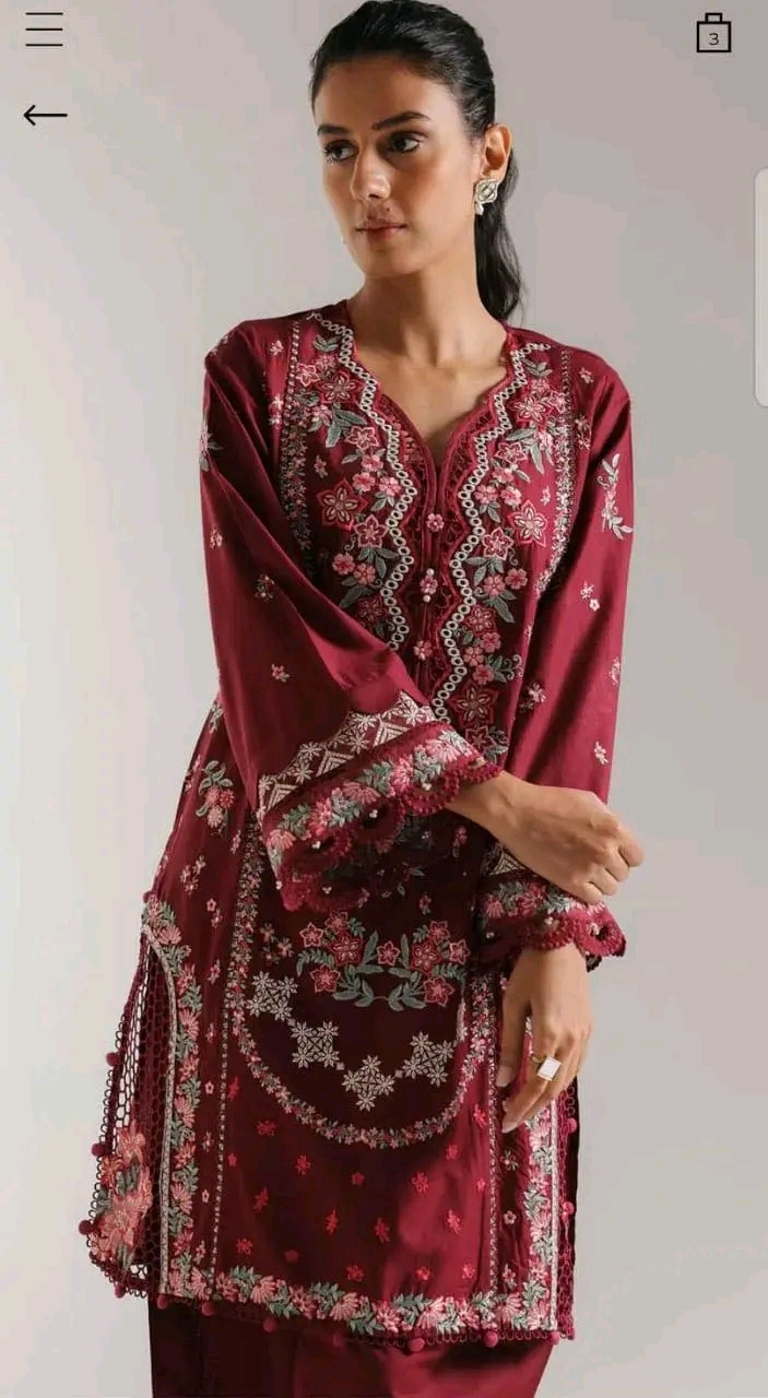 Material: Cotton kamiz with all over heavy embroidery work. Pant Cotton with embroidery work.