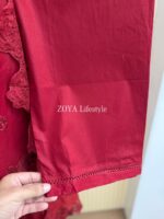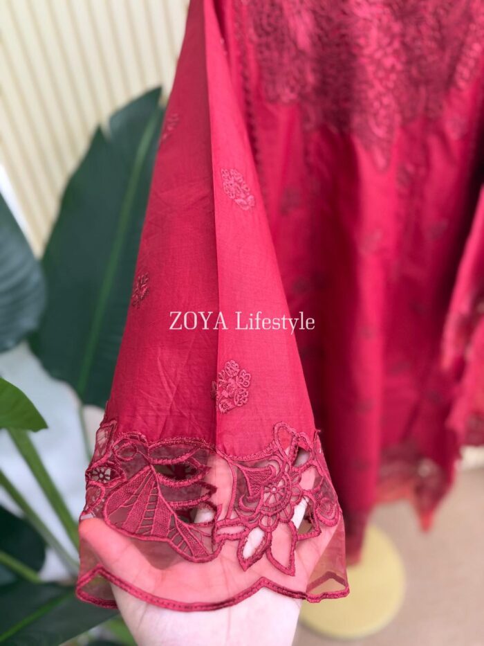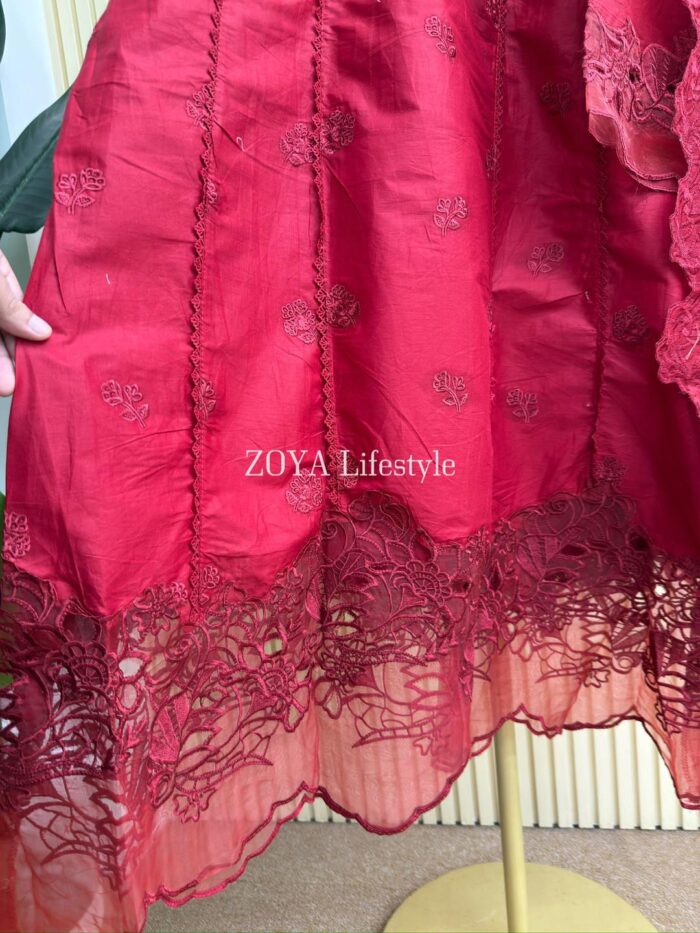 Material: Cotton with embroidery work on neck, sleeves, front-back damaan. Kota Cotton heavy embroidered orna. Pant cotton printed with lace border.