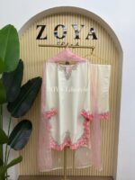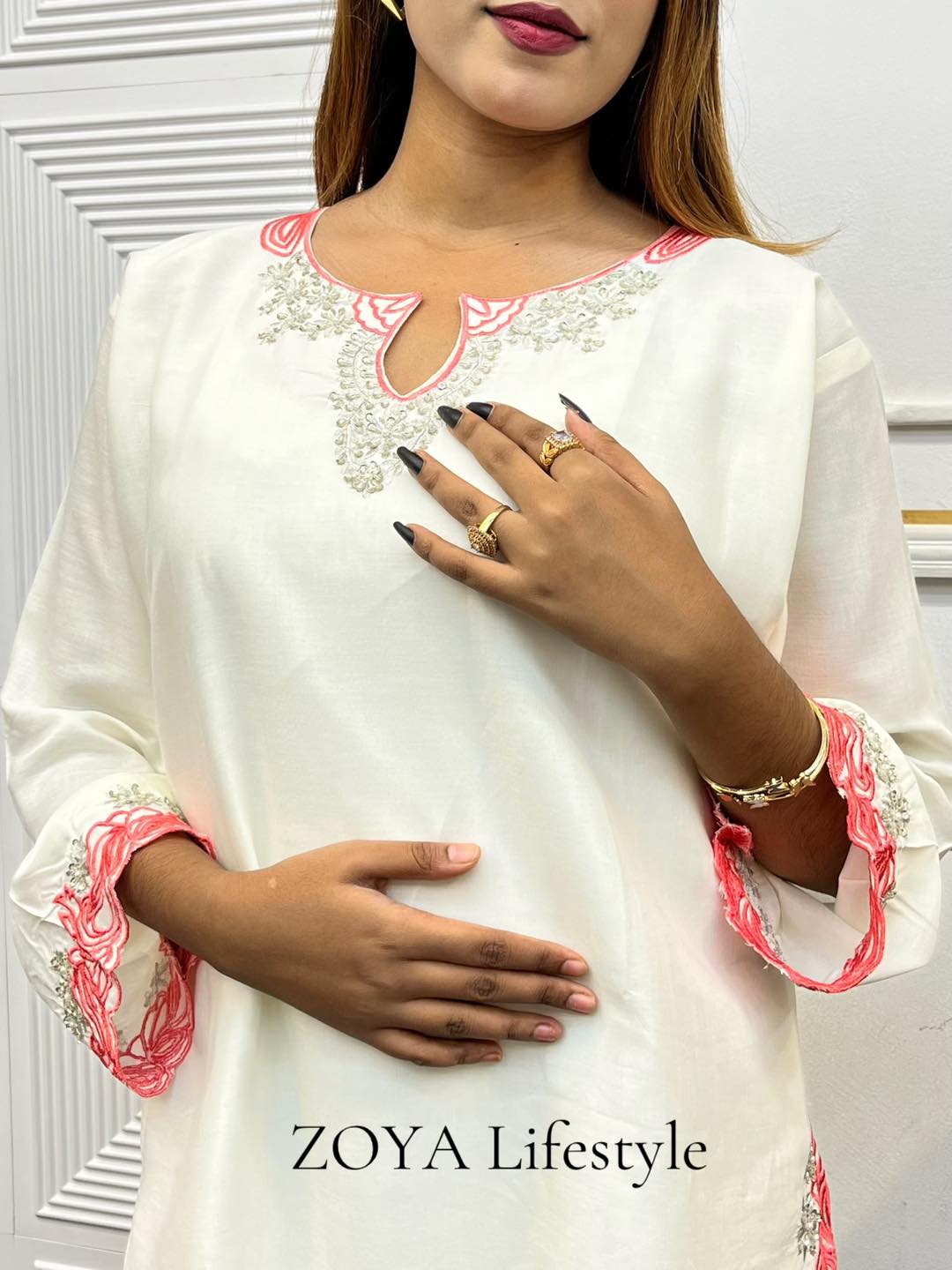 Material: Rayon Silk Cotton with embroidery and karchupi work on neck, sleeves, side borders and damaan. Maslin Orgenza orna with embroidery work. Rayon silk Cotton pant with embroidery work.