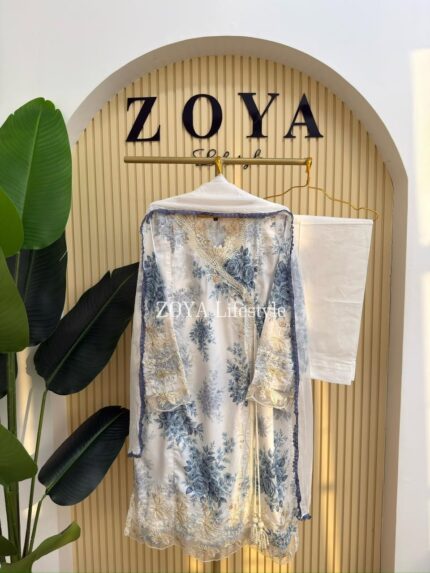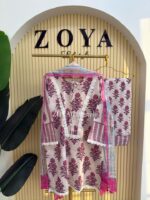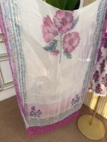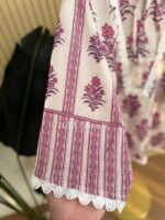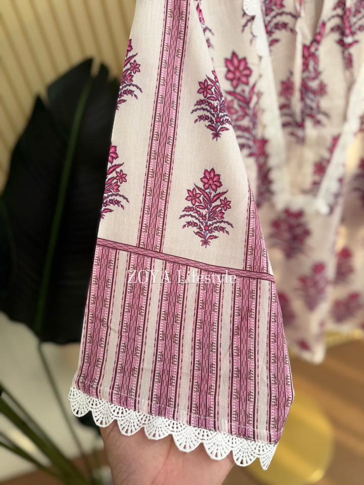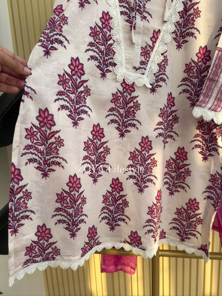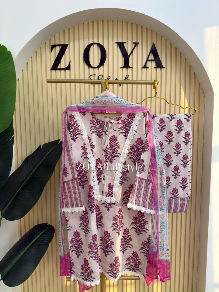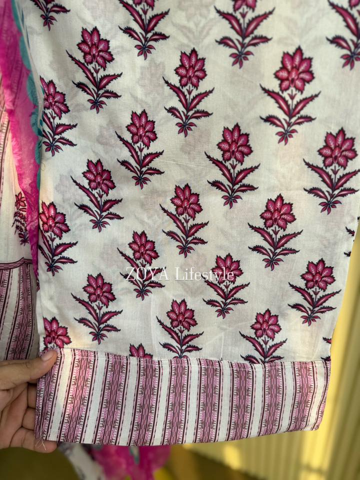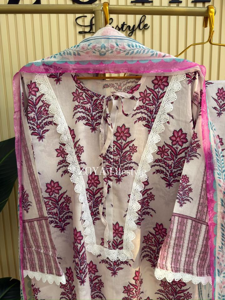 Material: Cotton printed kamiz. Lace work on neck, sleeves and damaan. Farshi pant Cotton. Chiffon printed dupatta