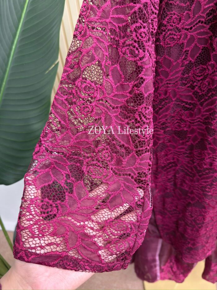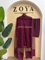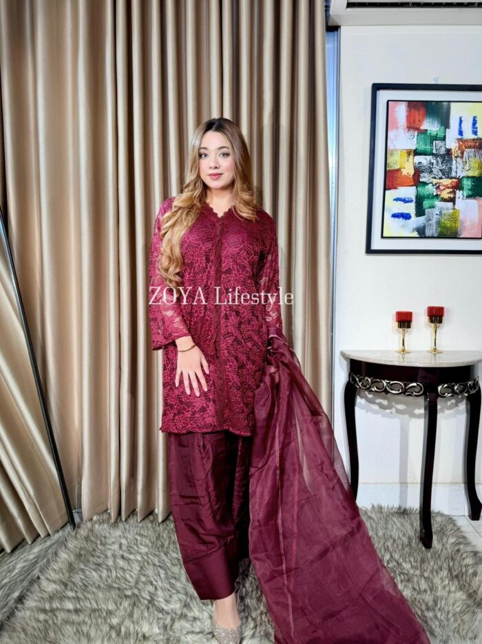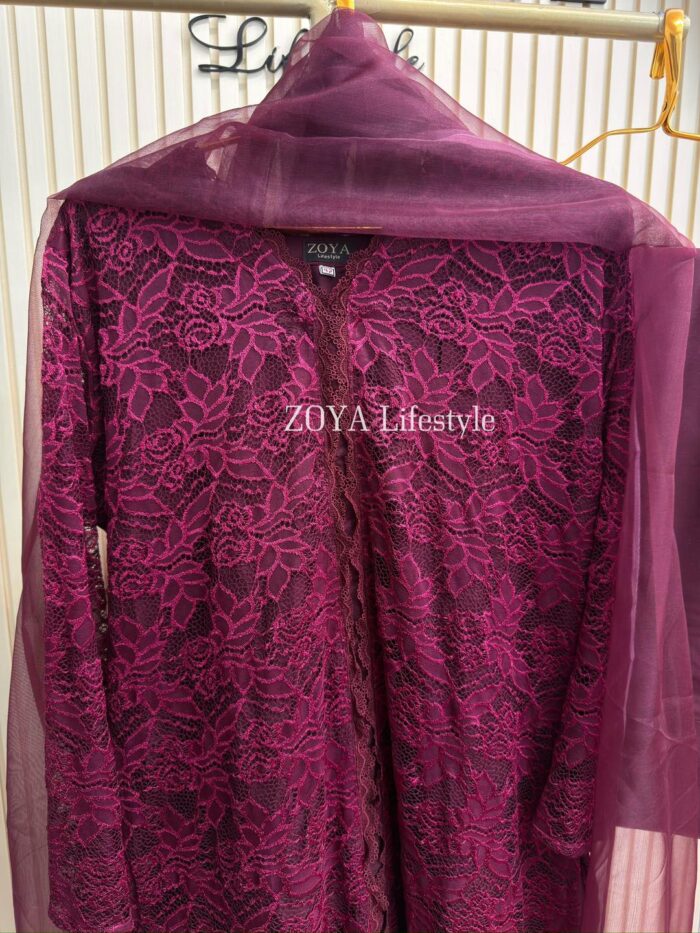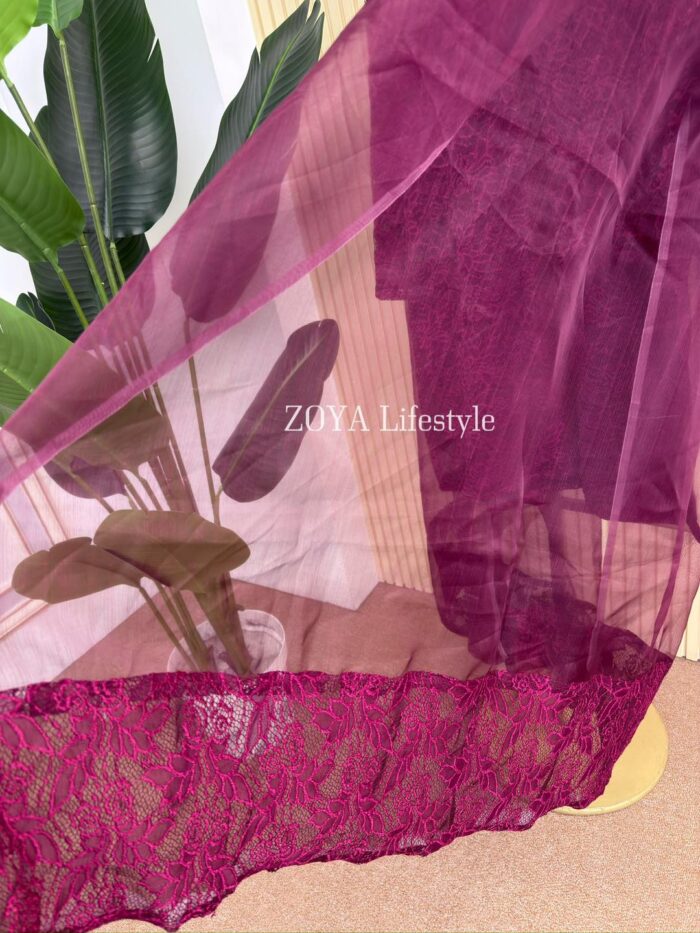 Material: Net Fabric kamiz with lace work on neck to bottom. Full body front and back Rayon silk cotton inner attached. Maslin orna with net fabric panel border, Farshi pant Rayon Silk Cotton.