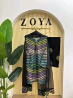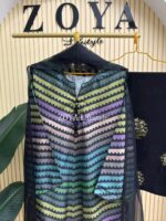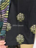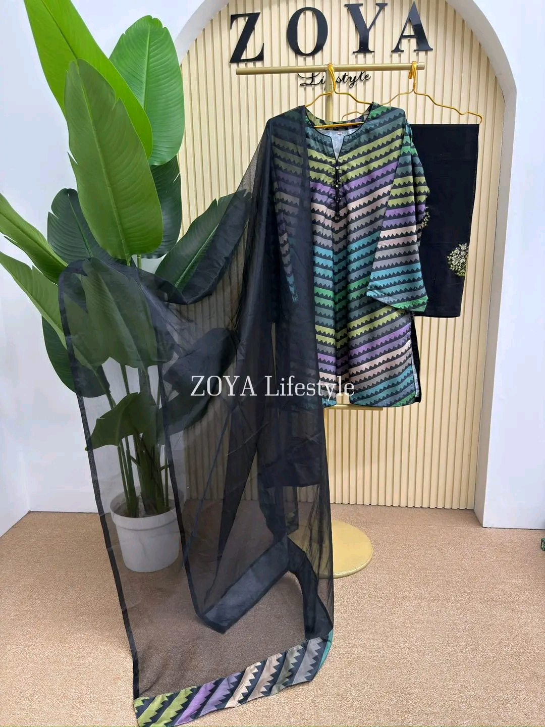 Material: Rayon Cotton printed kamiz with beads work on neck. Cod piping work on neck, sleeves and damaan. Semi Farshi pant Cotton with embroidery work. Maslin dupatta with border.