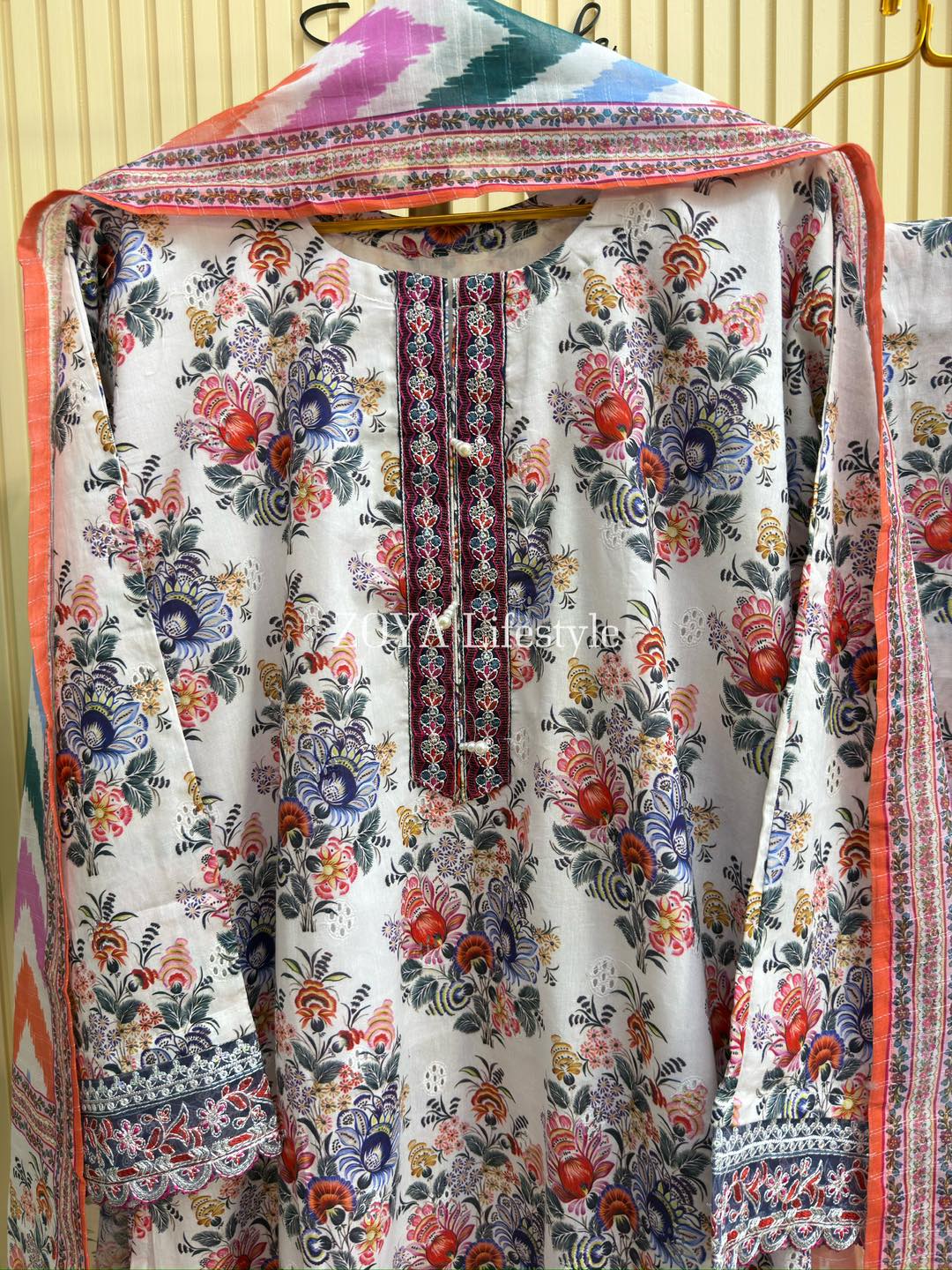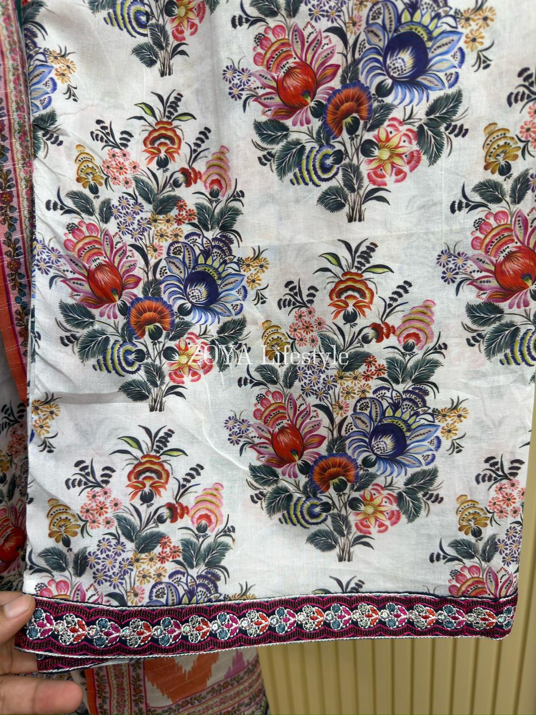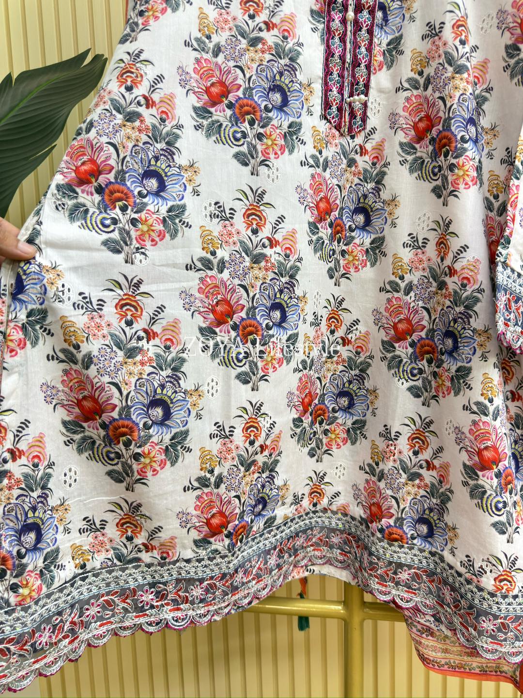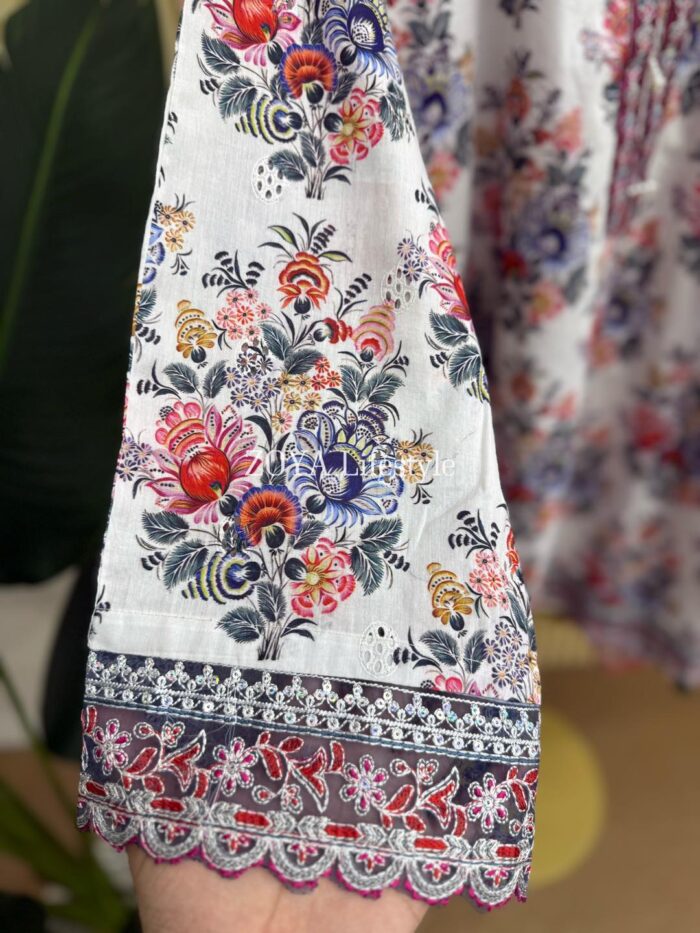 Material: Chikankari cotton kamiz with embroidered pannel on neck, sleeves and damaan. Front-Back half inner attatched. Kota cotton printed dupatta and cotton loose pant with embroidered border.