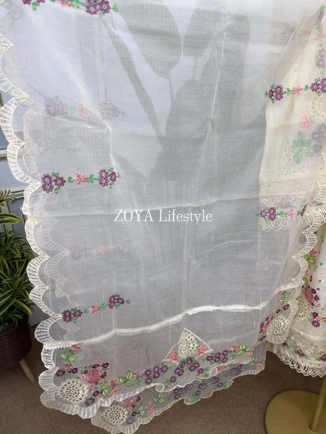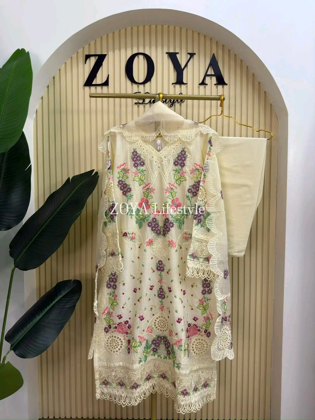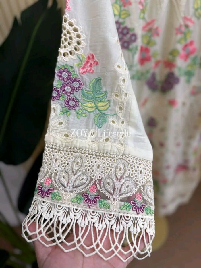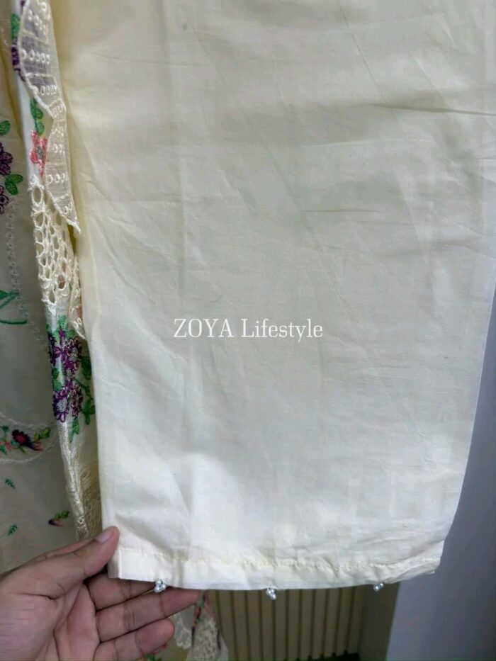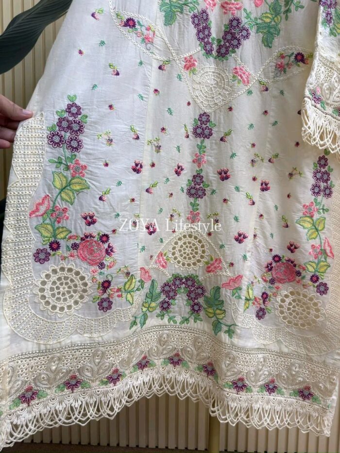 Material: Cotton with chikankari embroidered design on neck to bottom. You need to wear inner. Kota embroidered orna. Pant cotton with pearl design.