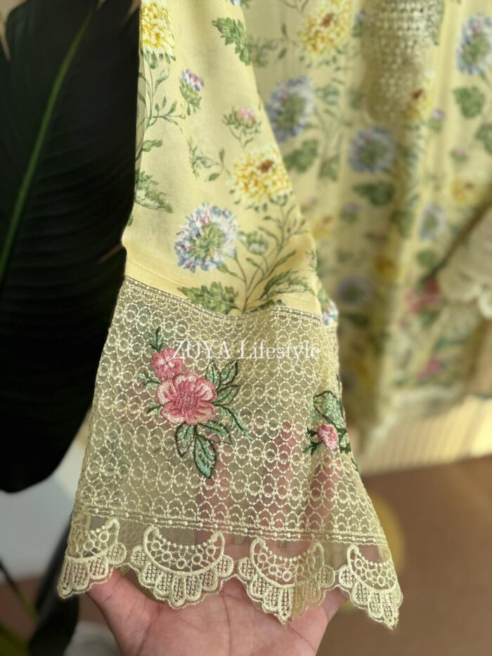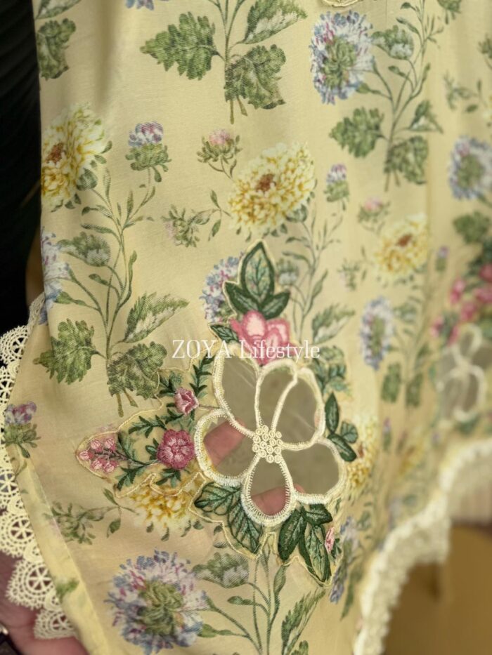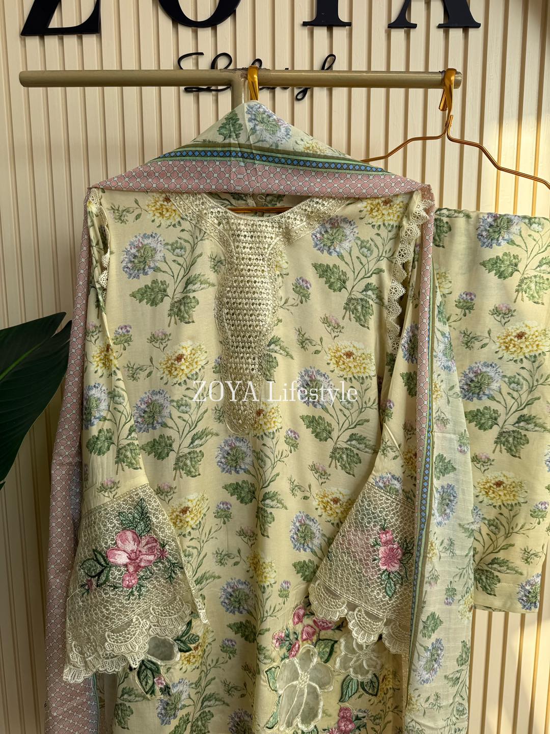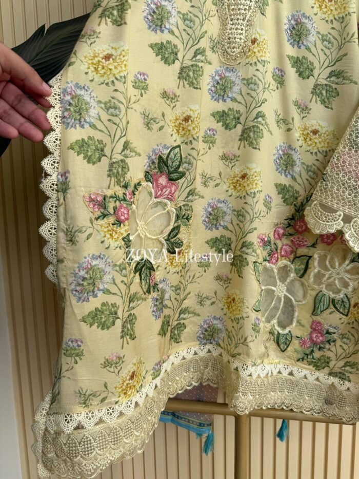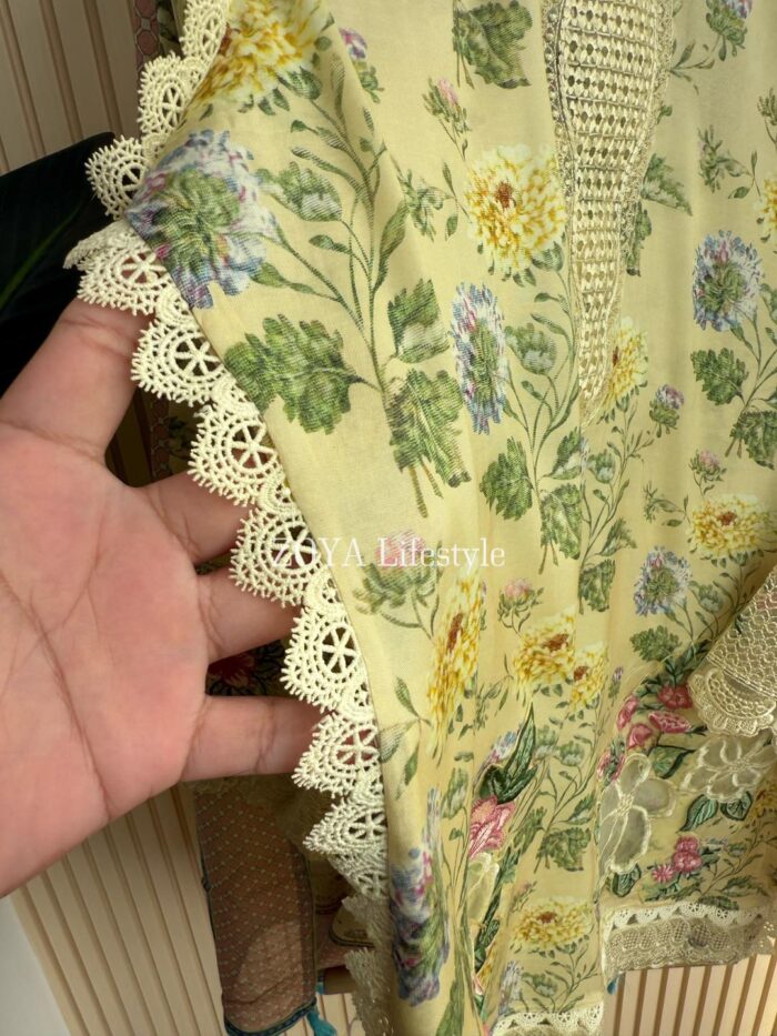 Material: Rayon silk Cotton fabric with embroidered work on neck, sleevees & daamaan.Lace designs on shoulder, side border and damaan. Kota cotton dupatta. Rayon silk Cotton printed pant.