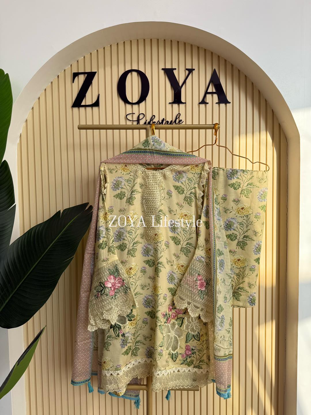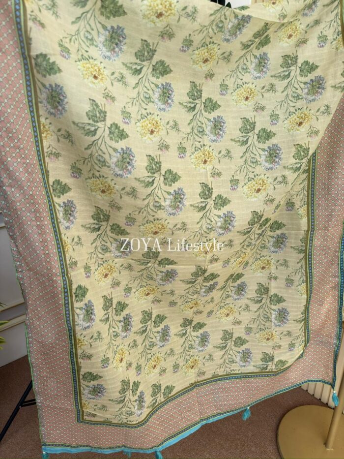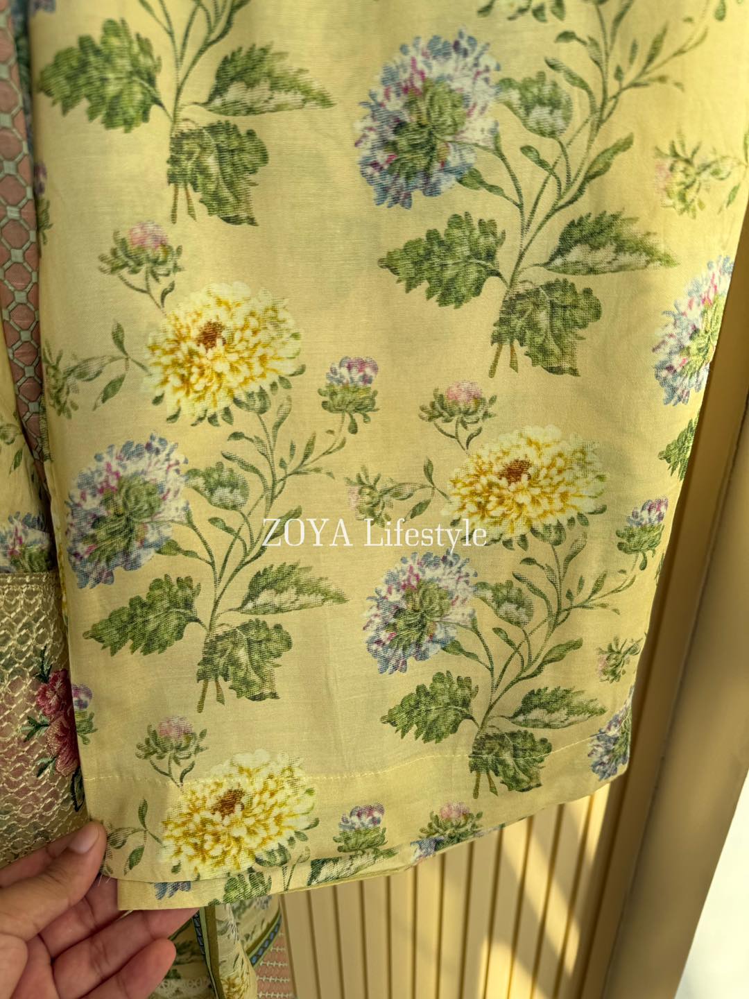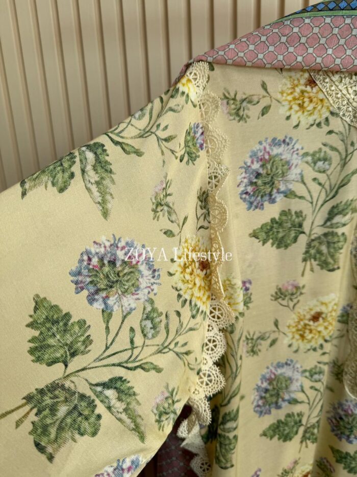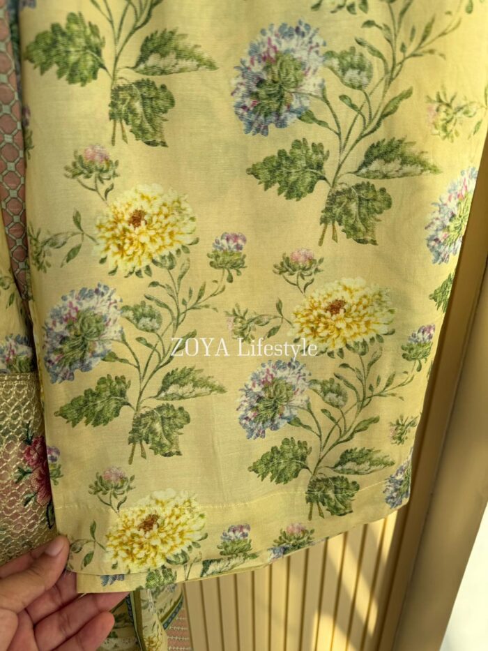 Material: Rayon silk Cotton fabric with embroidered work on neck, sleevees & daamaan.Lace designs on shoulder, side border and damaan. Kota cotton dupatta. Rayon silk Cotton printed pant.