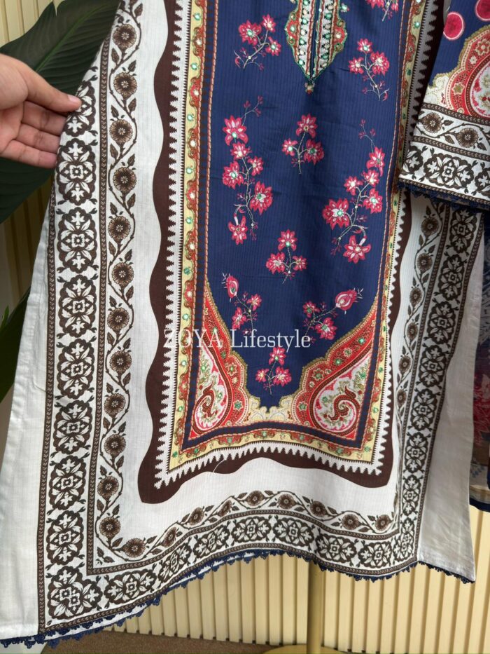 Material: Stripe cotton with mirror work on neck and damaan. Lace work on sleeves, front-back damaan. Kota Cotton printed dupatta and cotton pant.