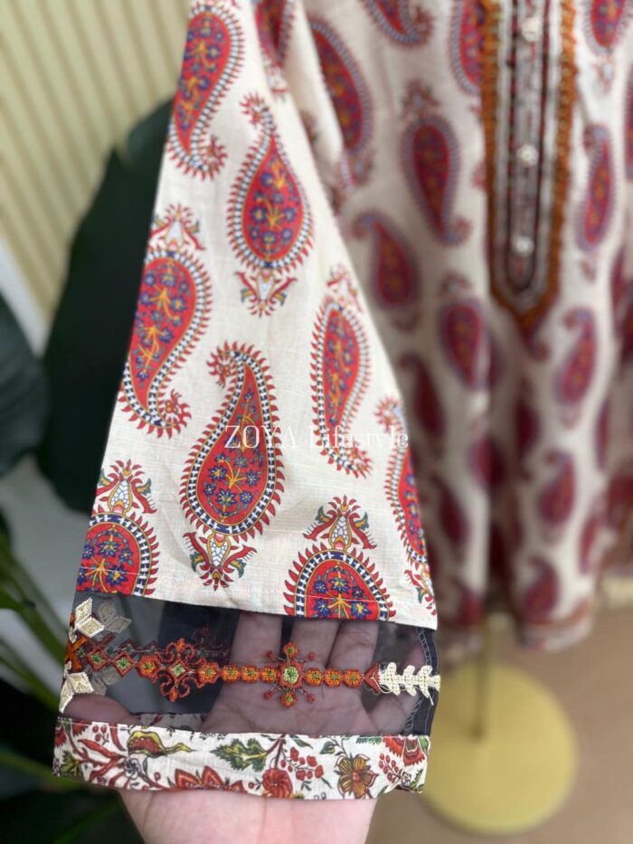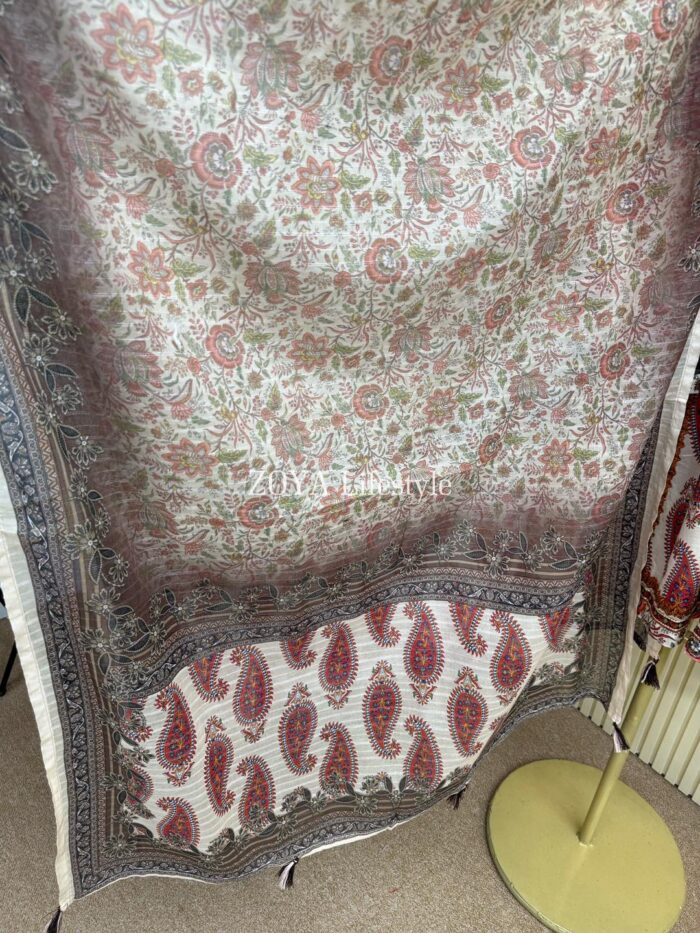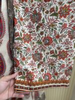 Material: Cotton kamiz with embroidery work on neck, sleeves, front side borders and front side Damaan. Kota cotton orna. Loose Pant Cotton with embroidered work.