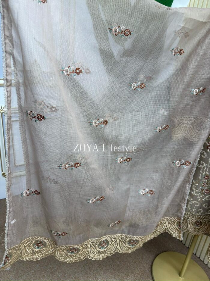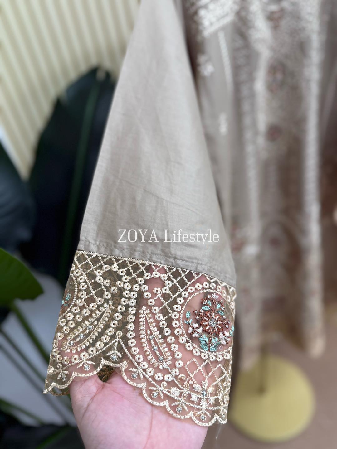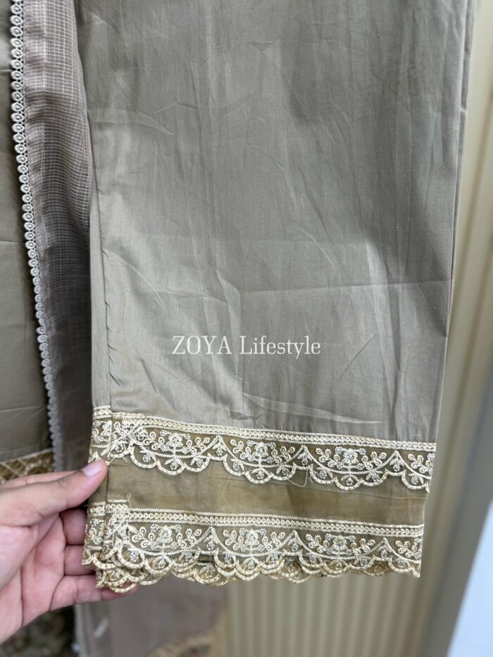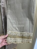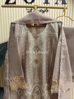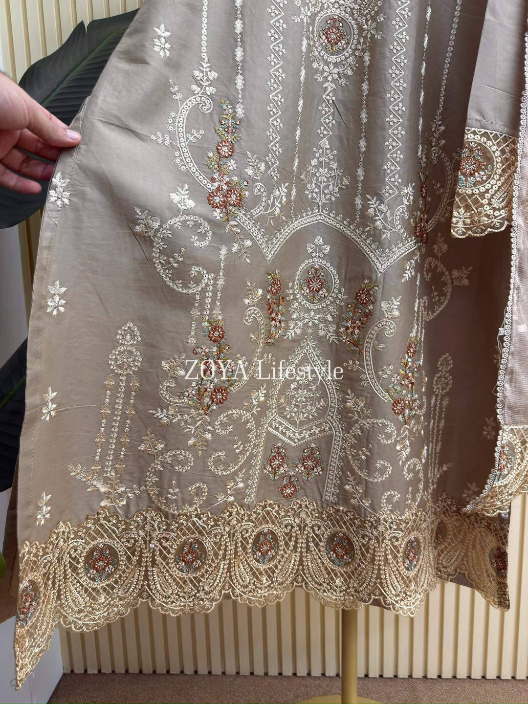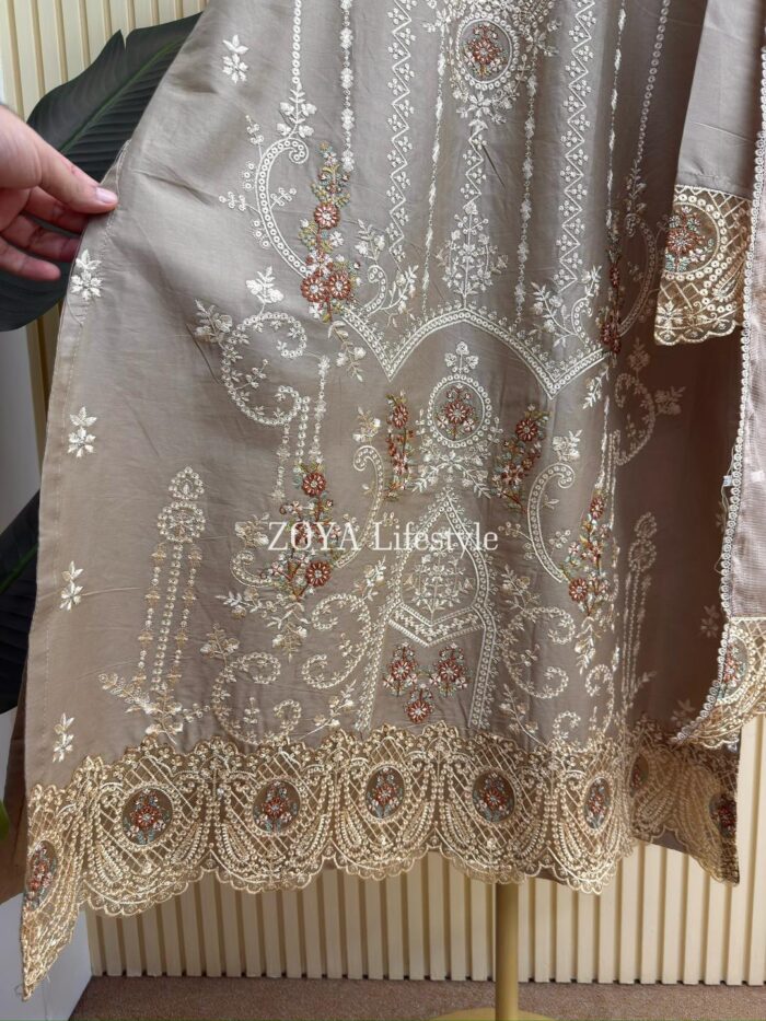 Material: Cotton with jori & embroidery work on full kamiz. Maslin pannel on sleeves and damaan. Net Kota embroidered orna. Cotton pant with embroidered pannel.