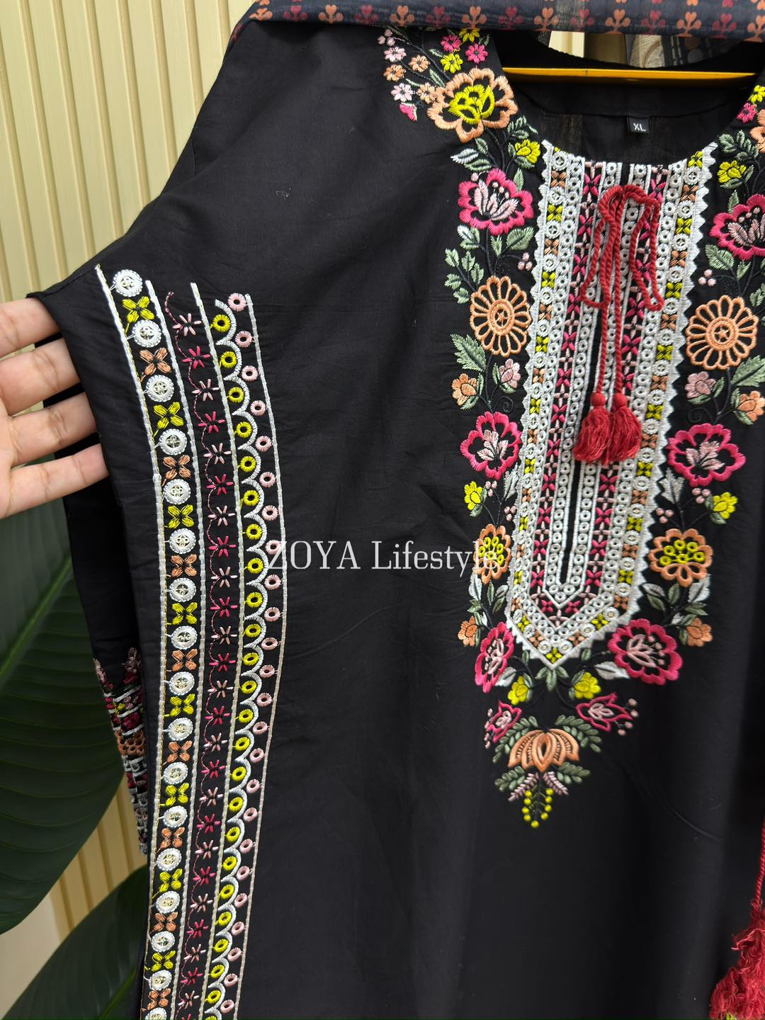 Material: Cotton with embroidery work on neck, sleeves, side border and Damaan. Maisuri silk printed orna. Pant printed silk.