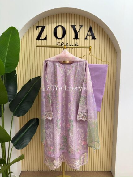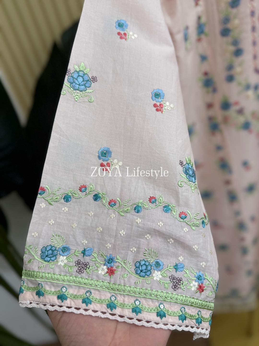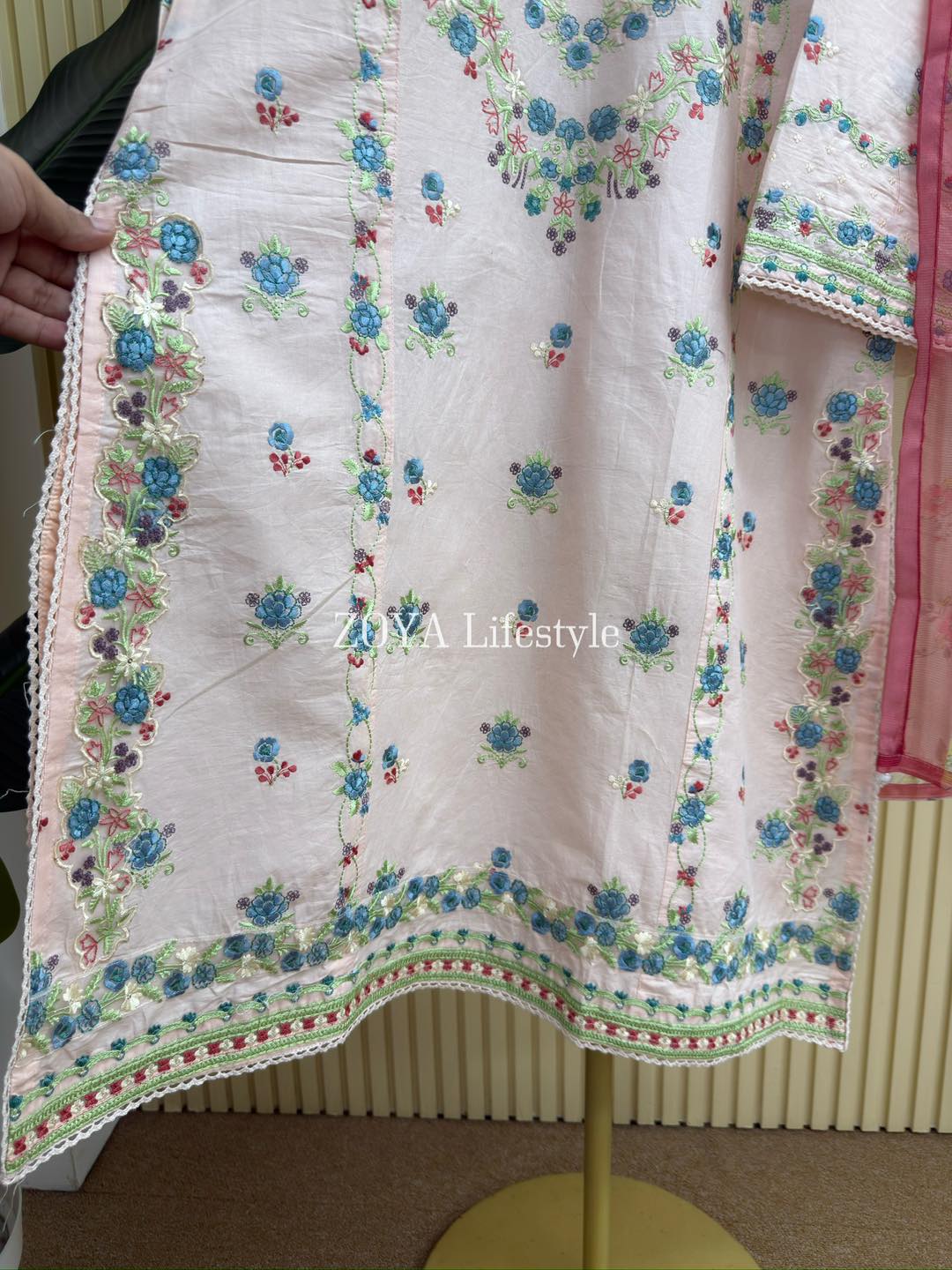 Material: Cotton with embroidery work on full body. Lace border on sleeves, side border and damaan. Kota silk printed orna. Pant cotton with embroidery work.