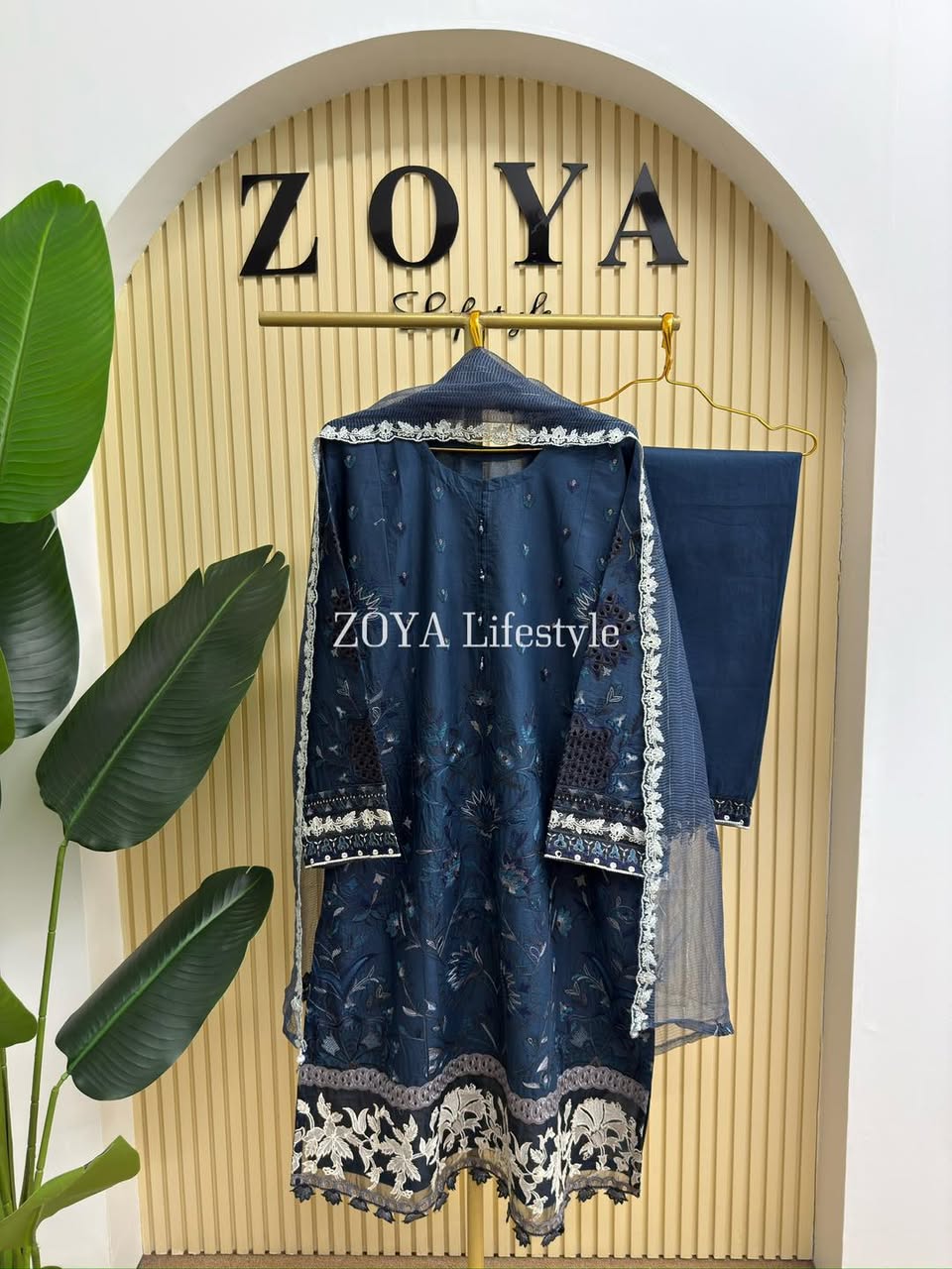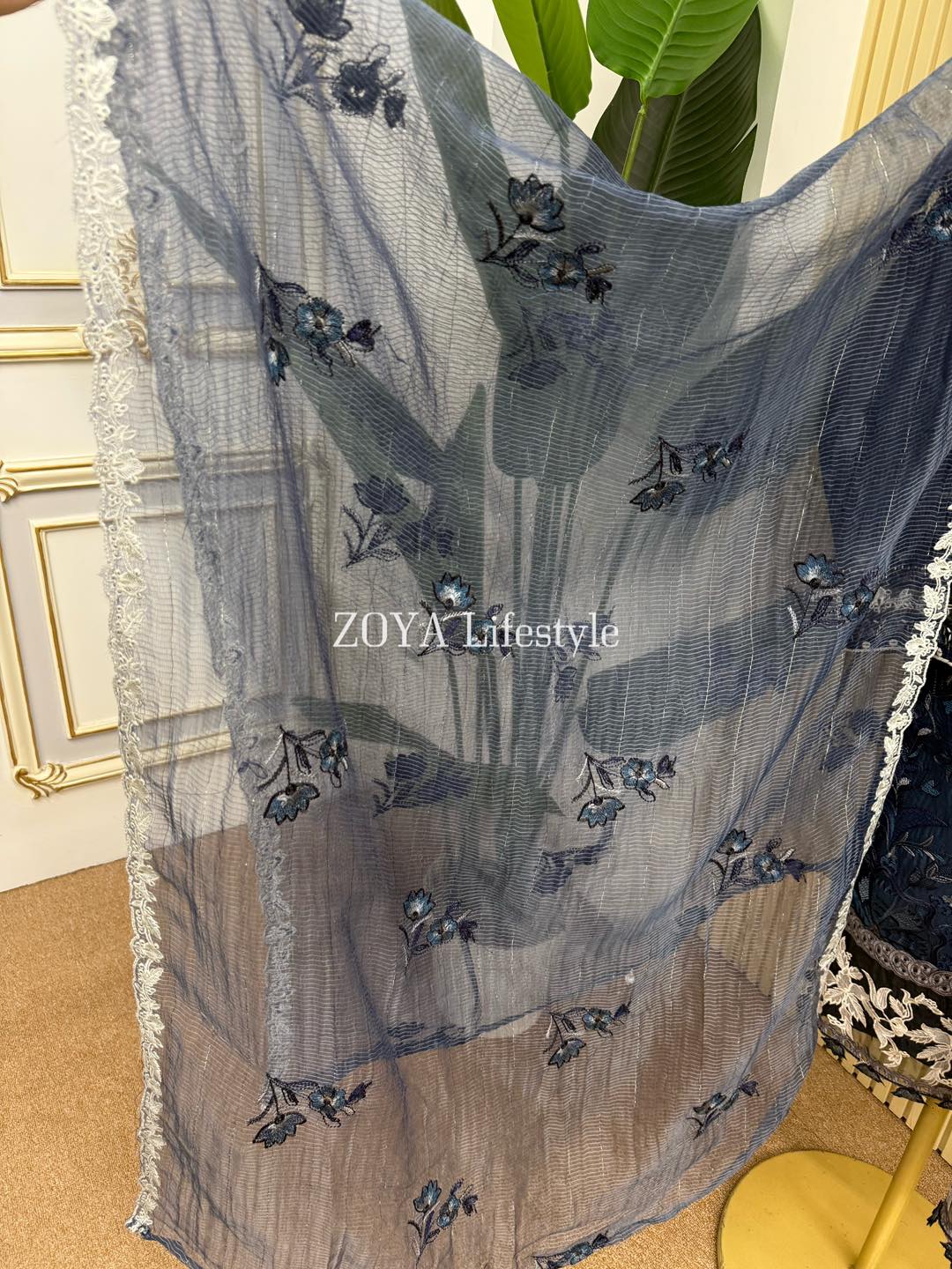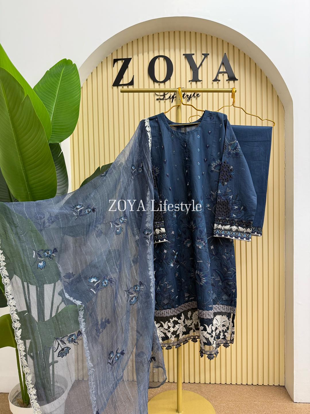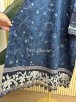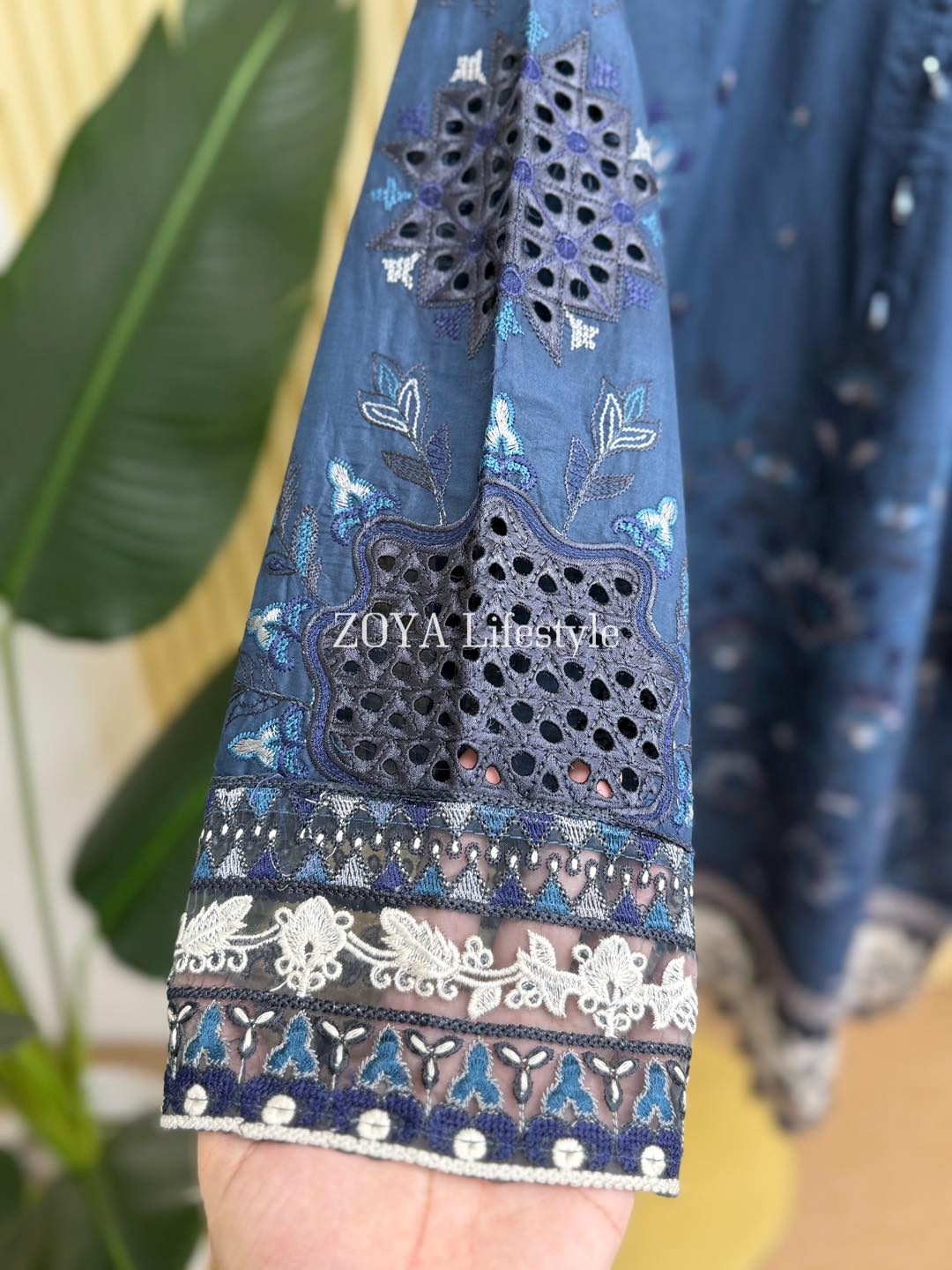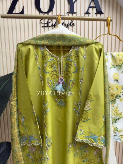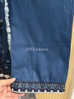 Material: Cotton with embroidery work on whole body. Maslin embroidered pannel on sleeves and Damaan. Net kota embroidered orna. Pant cotton with embroidery border.