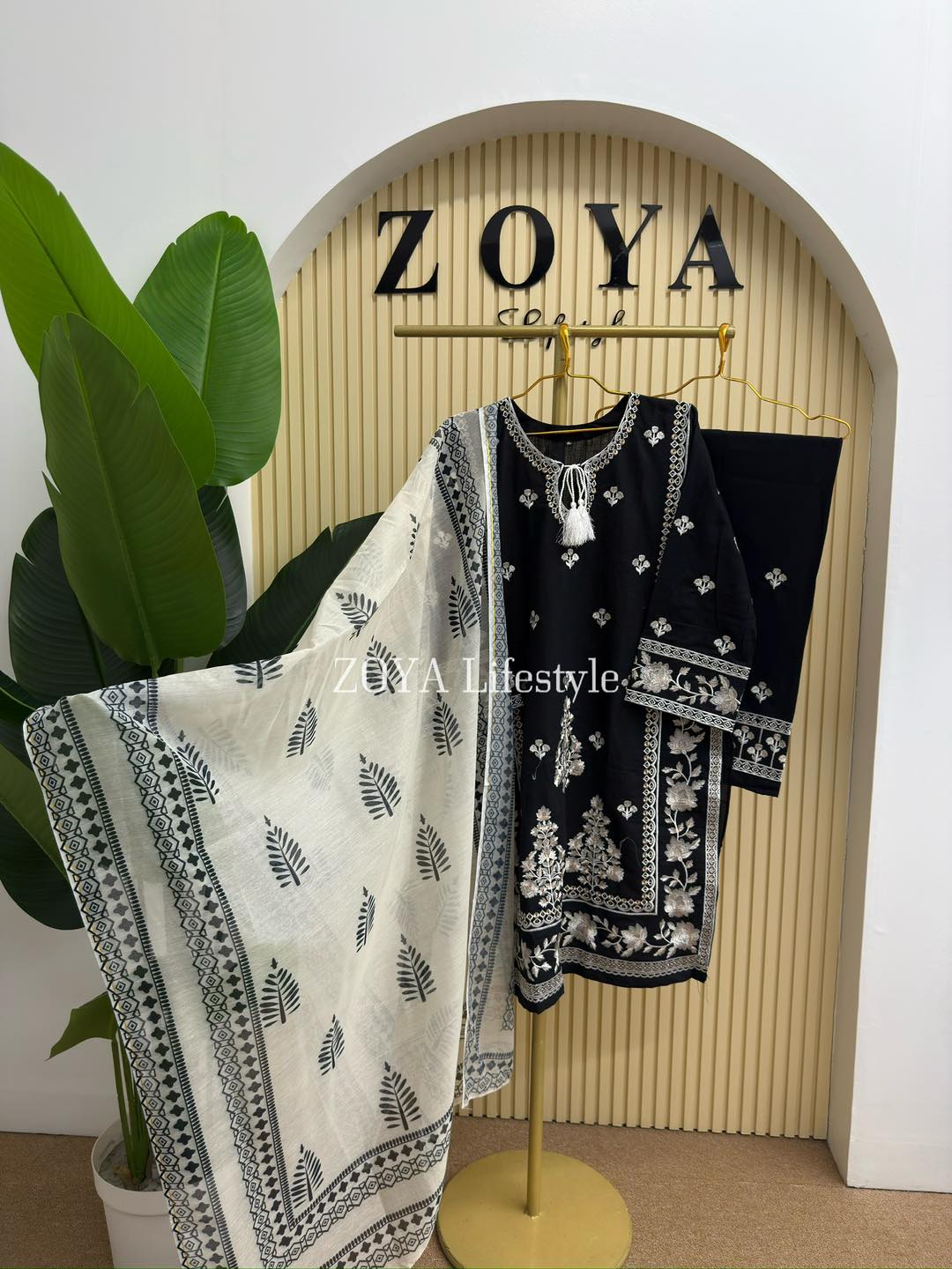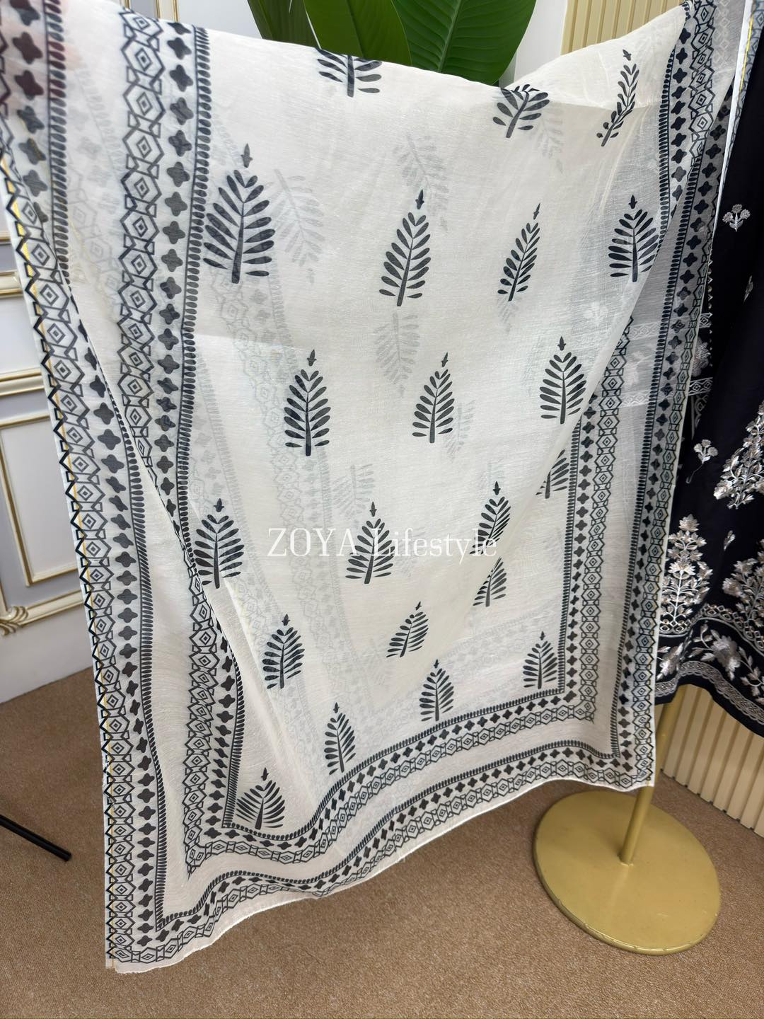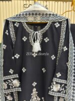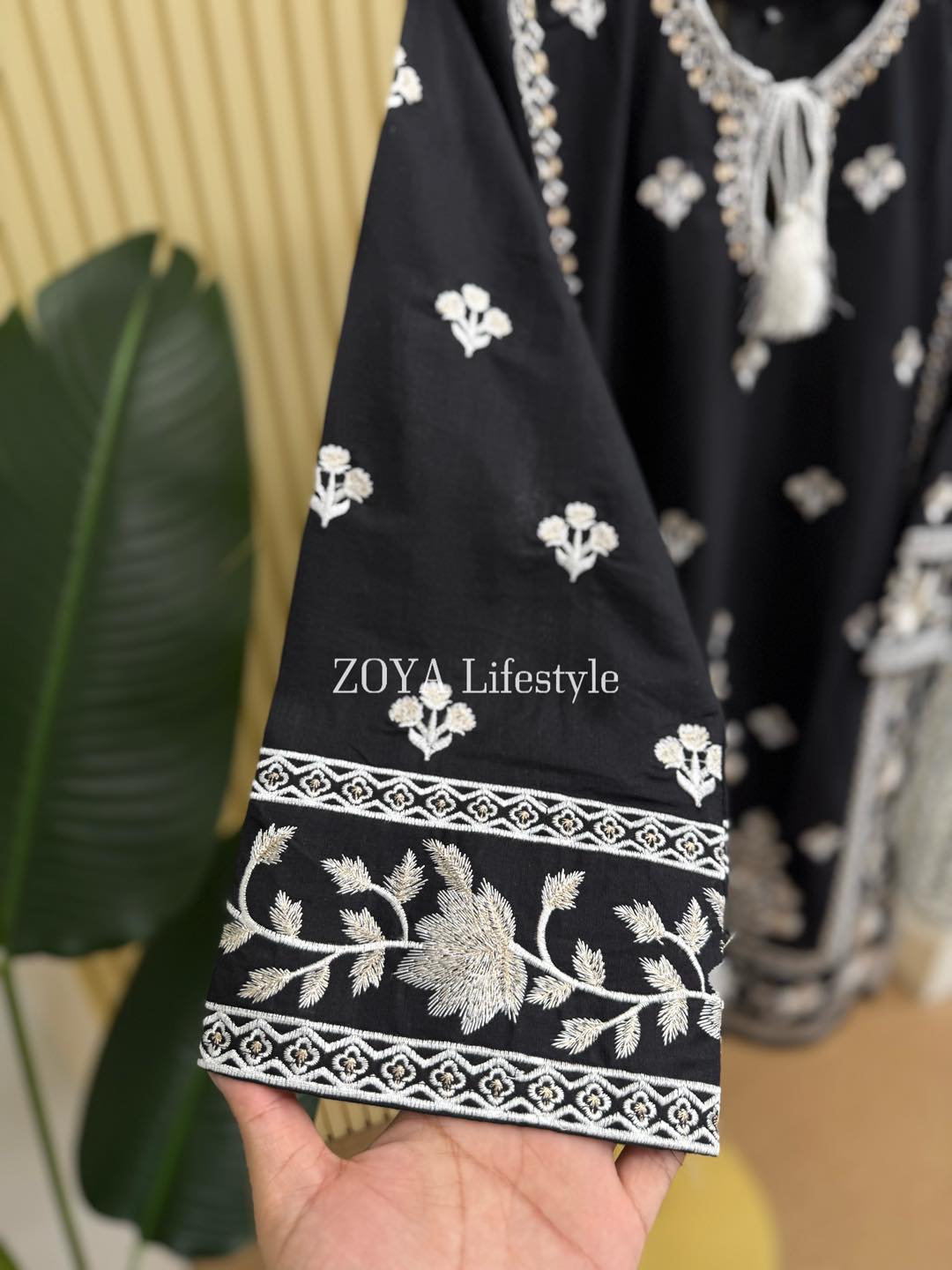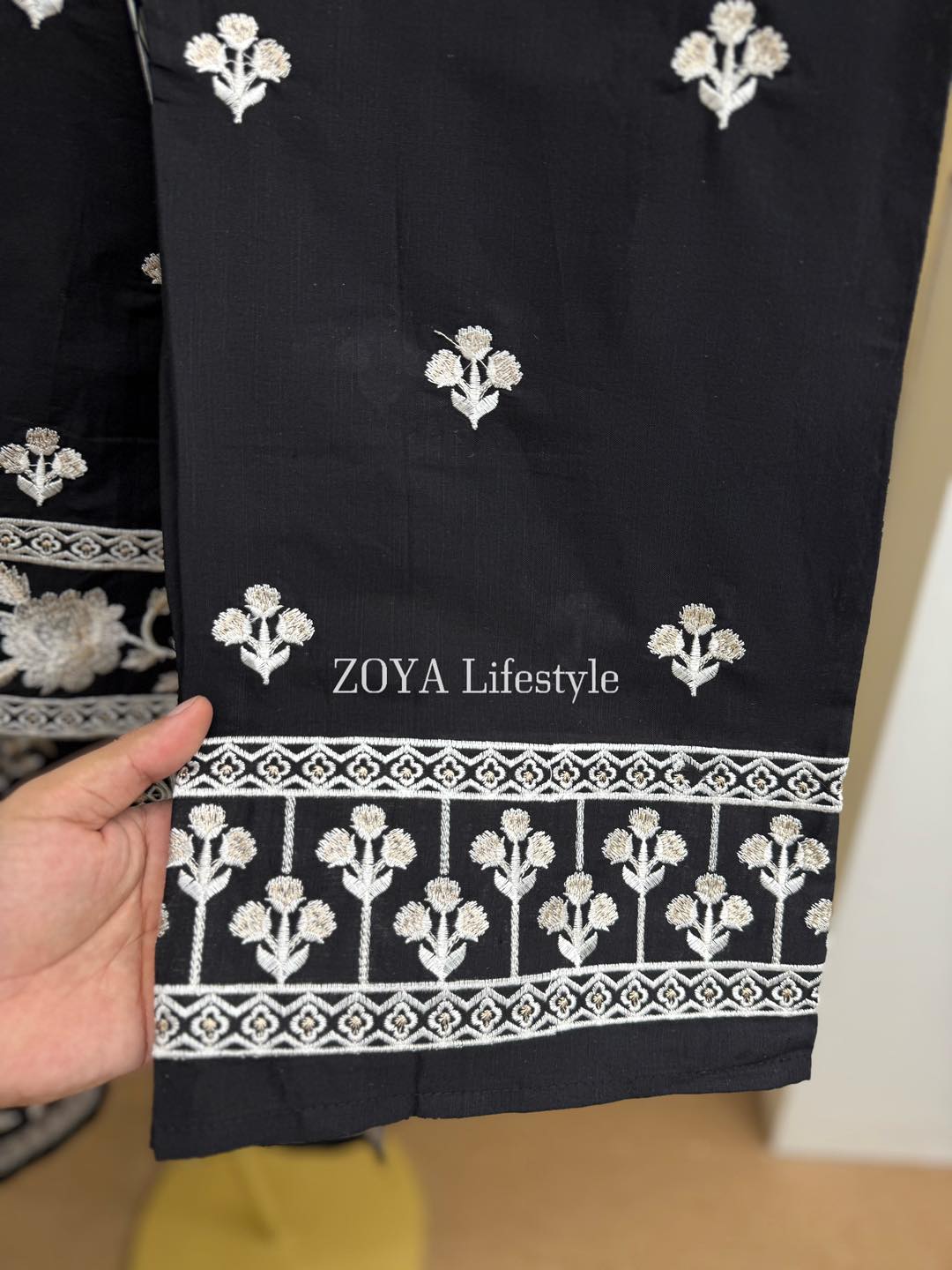 Material: Cotton with embroidery work on neck, sleeves, side border and Damaan. Maisuri silk cotton printed orna. Pant cotton with embroidery.