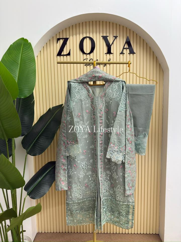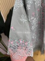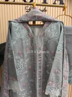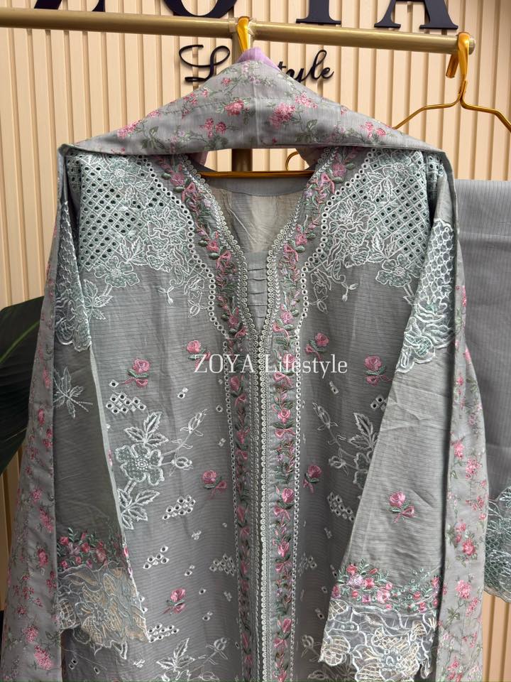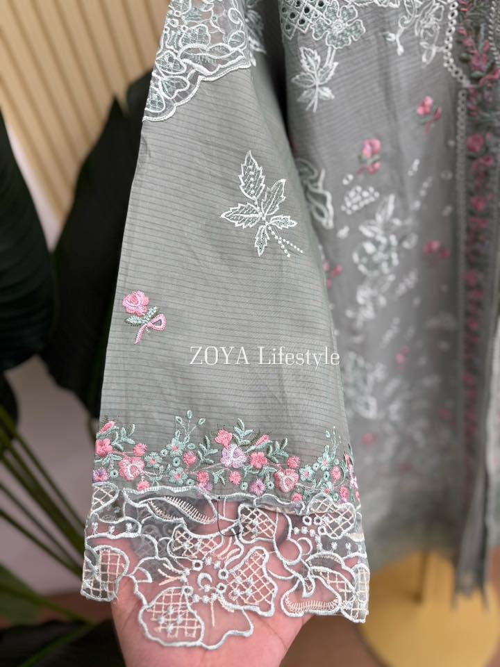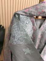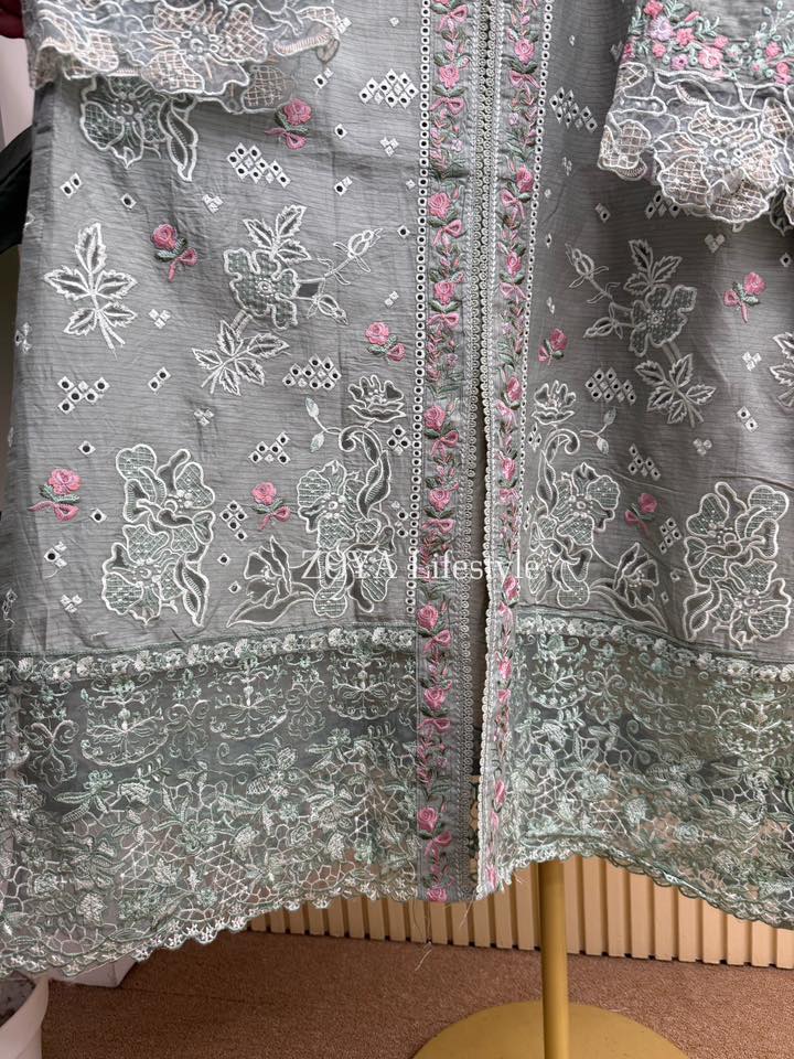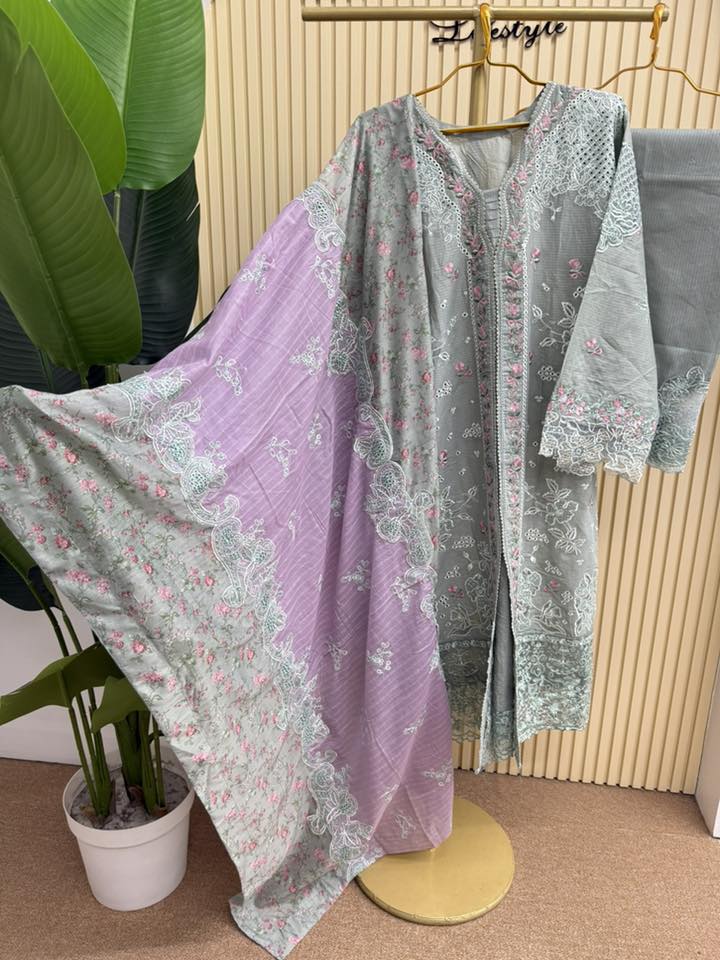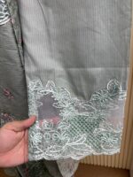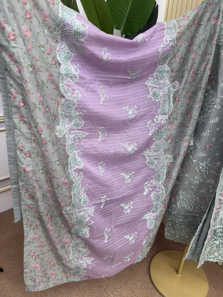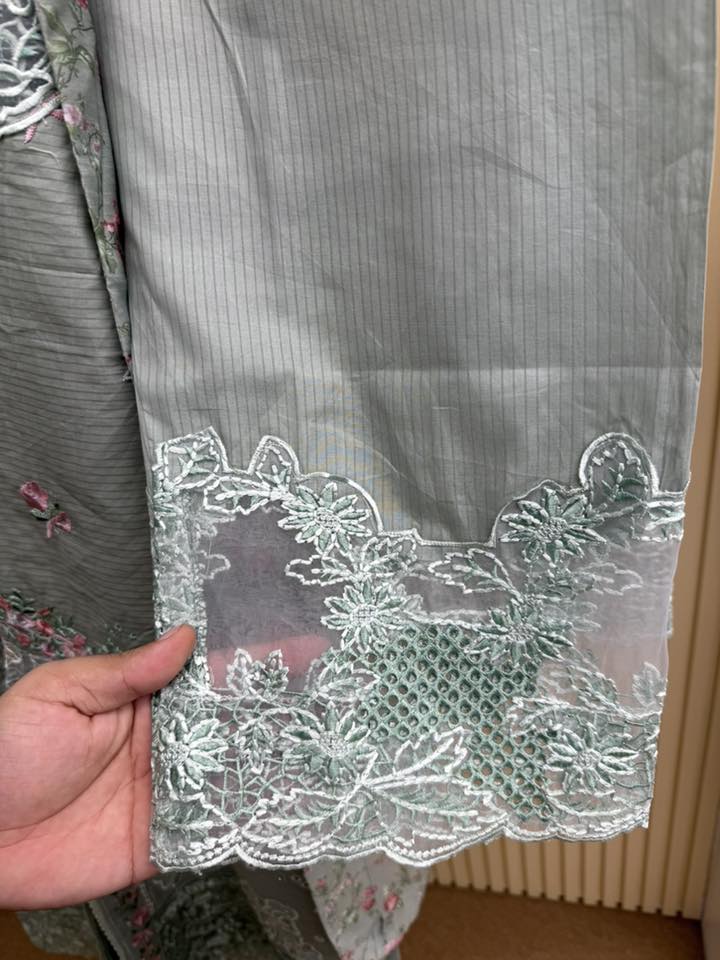 Material: stripe Cotton kamiz with chikankari embroidery work on shoulder chest side.. Maslin embroidered pannel on sleeves & damaan. Kota cotton with embroidered orna. Pant stripe Cotton with maslin embroidery design.