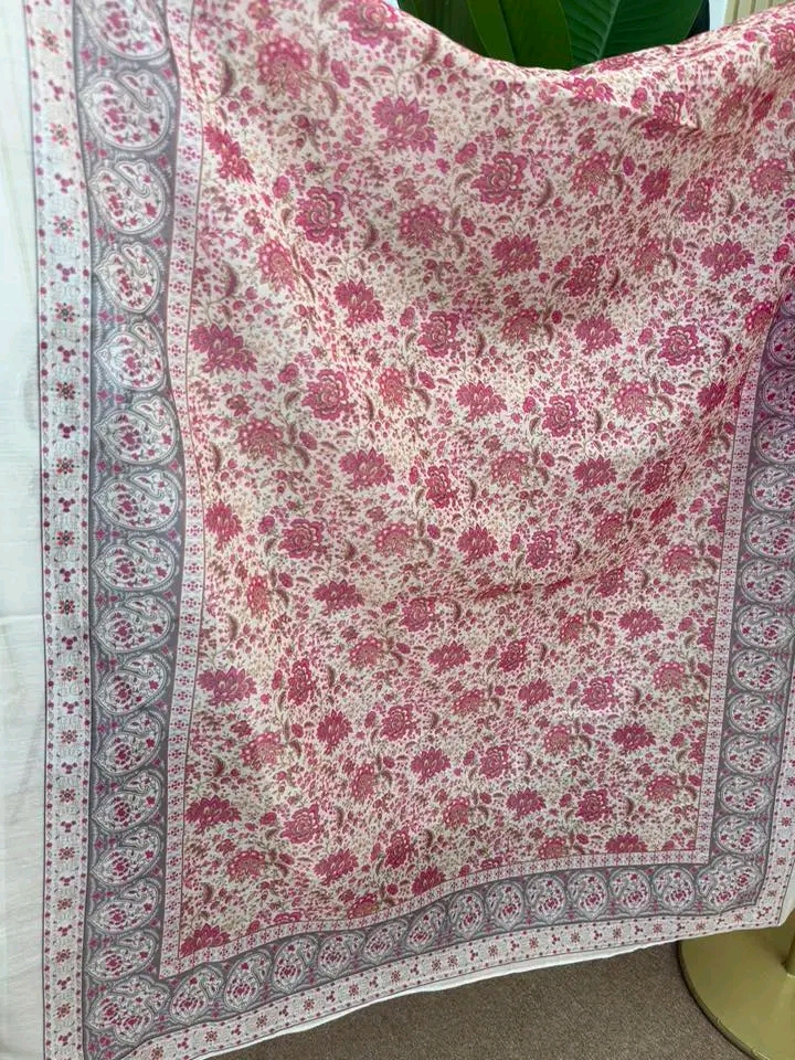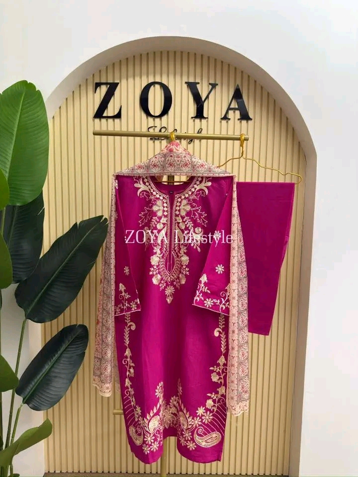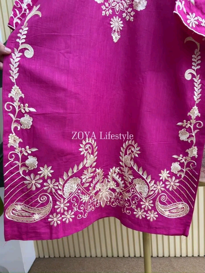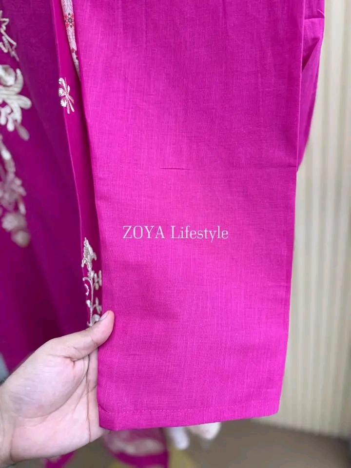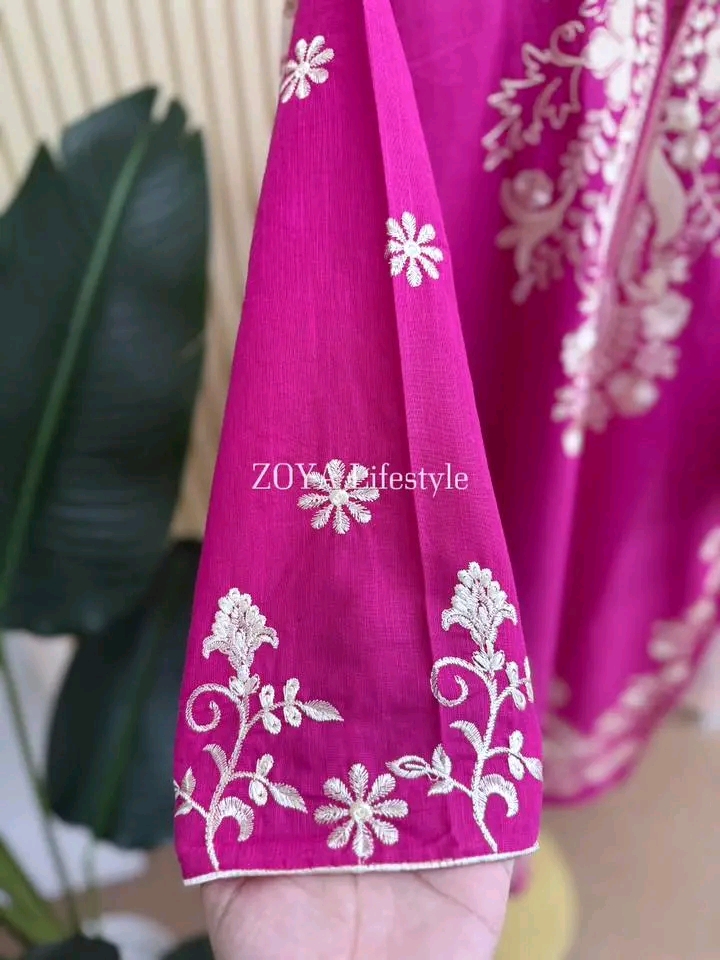 Material: Cotton with embroidery work on front full body, sleeves and Damaan. Maisuri silk cotton printed orna. Cotton Pant.