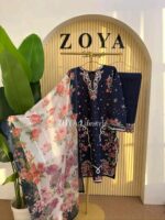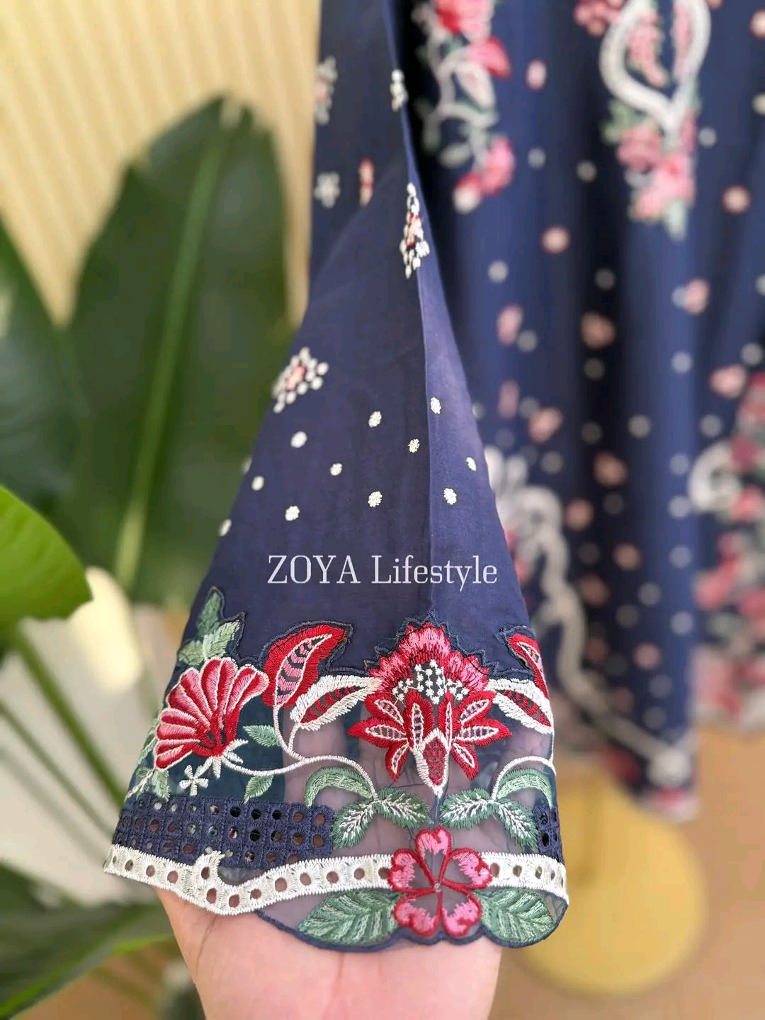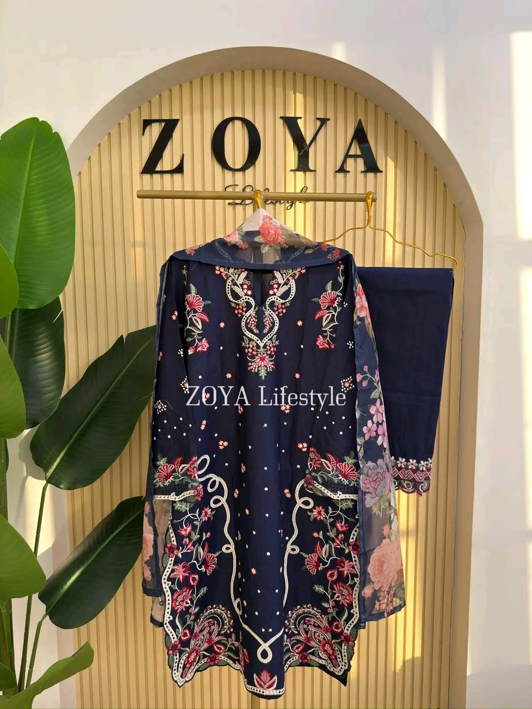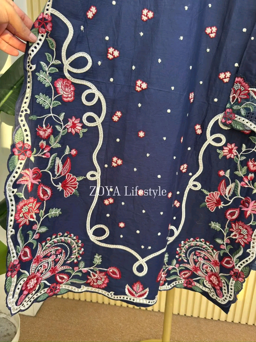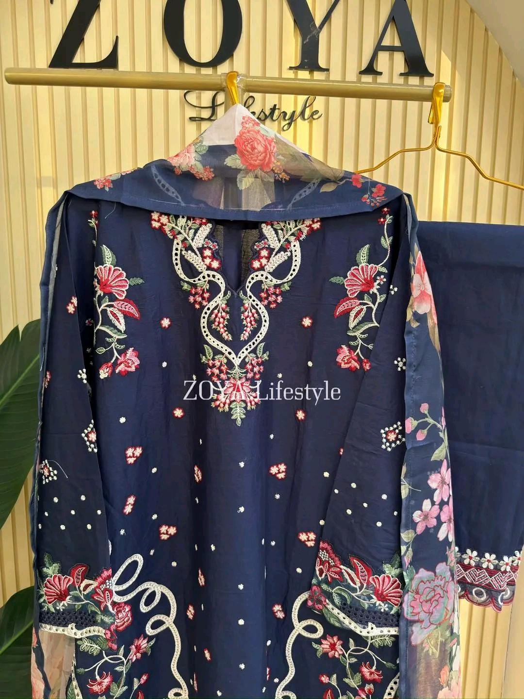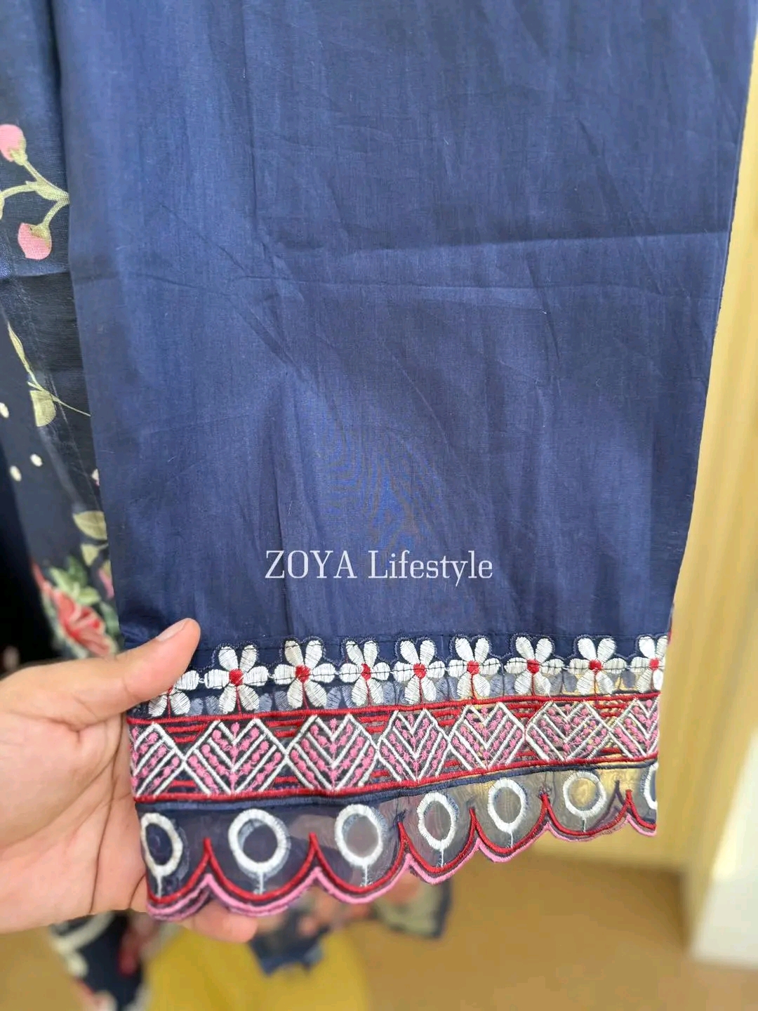 Material: cotton with embroidery work on full body. Cotton pant with embroidery. Silk printed dupatta.