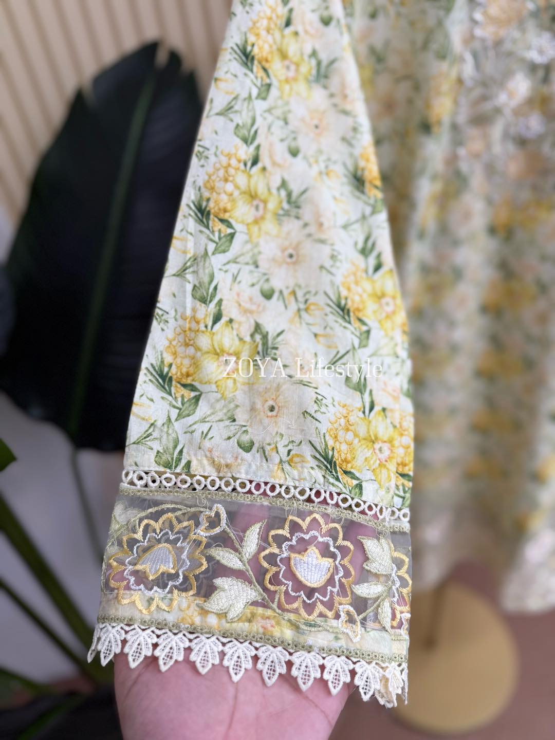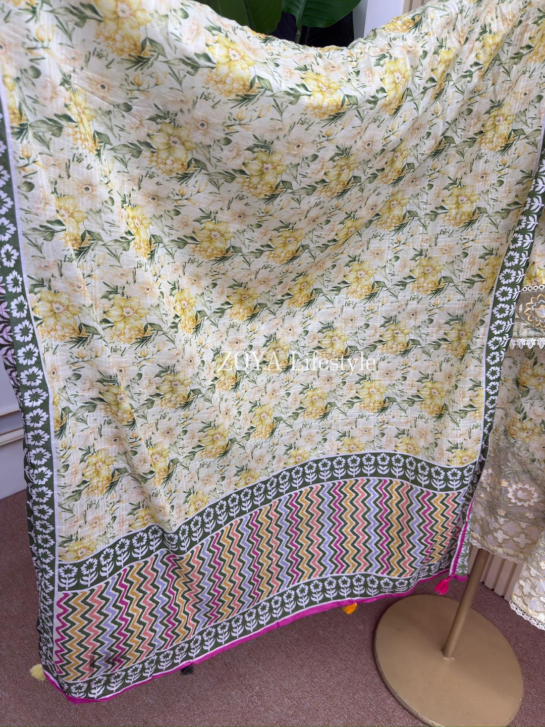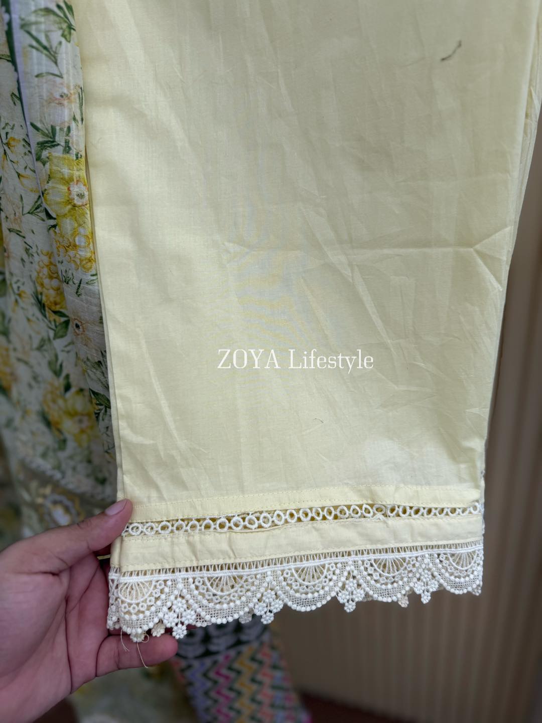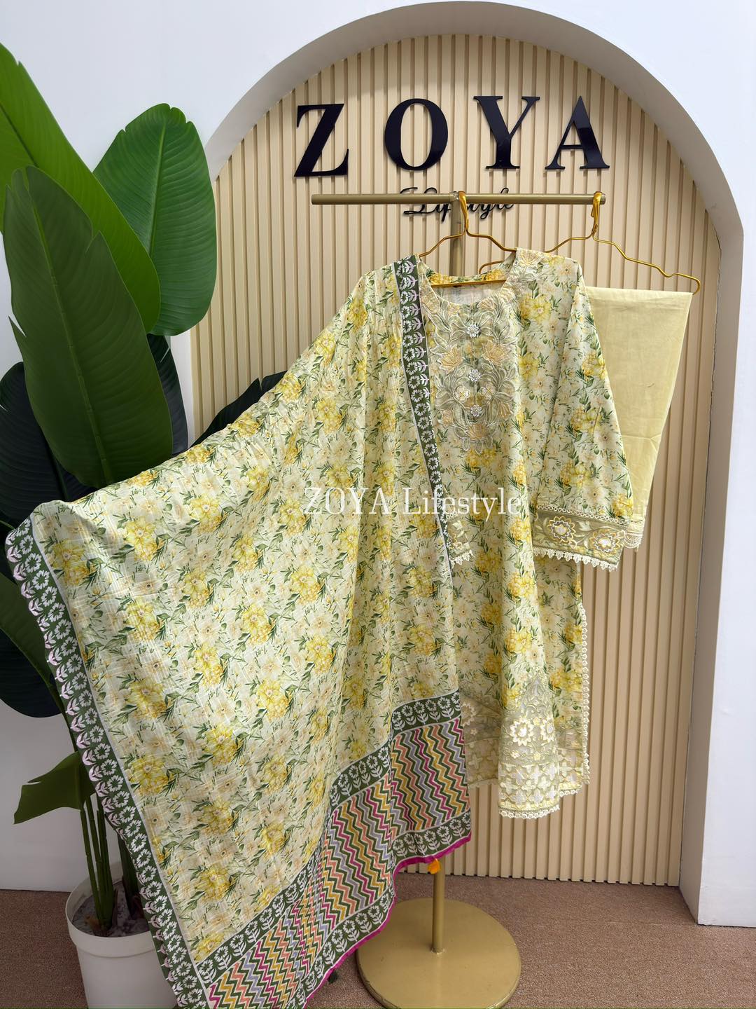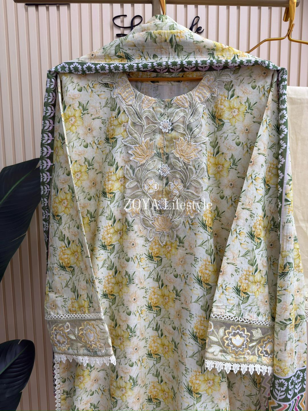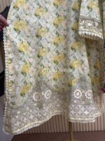 Material: Cotton kamiz with embroidery work on neck, sleeves and damaan. Cotton orna. Cotton pant with embroidery border.