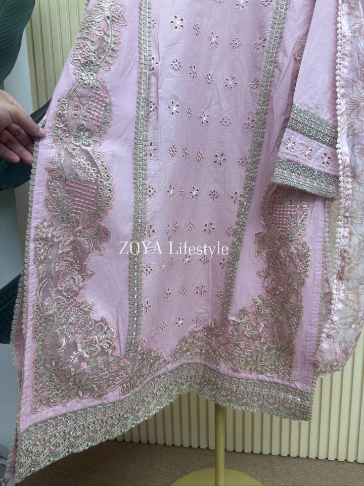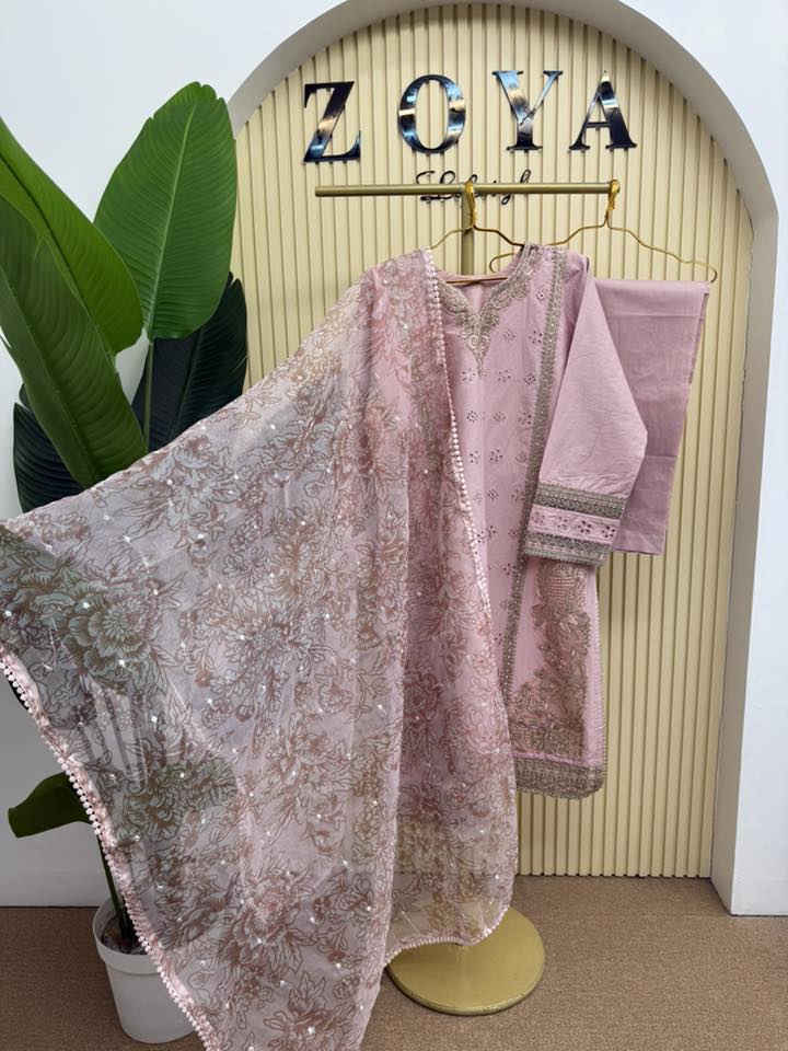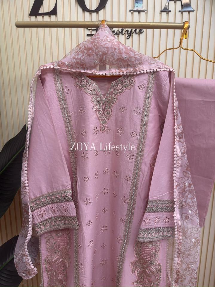 Material: Cotton kamiz with chikankari embroidered work on body and sleeves. Silk Kota embroidered orna. Plain Cotton pant.