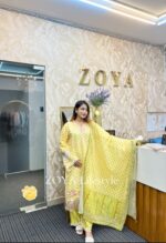 Material: Rayon Cotton kamiz with maslin embroidered work on body, damaan and sleeves . Kota Cotton orna. Rayon Cotton pant with embroidered border.