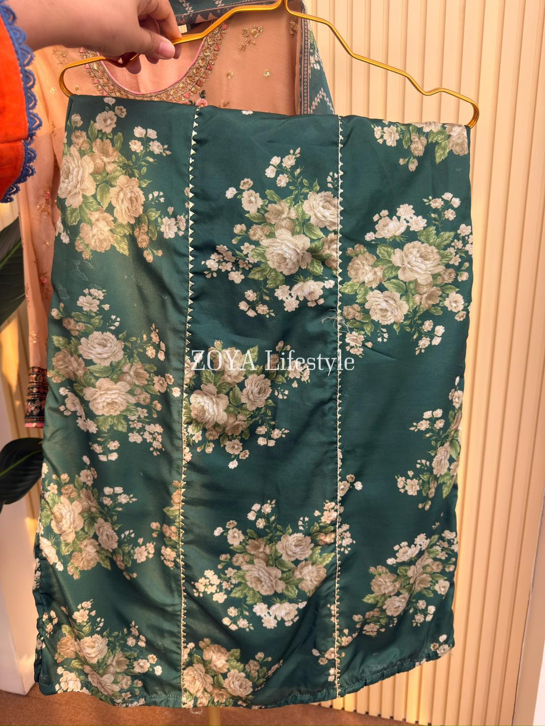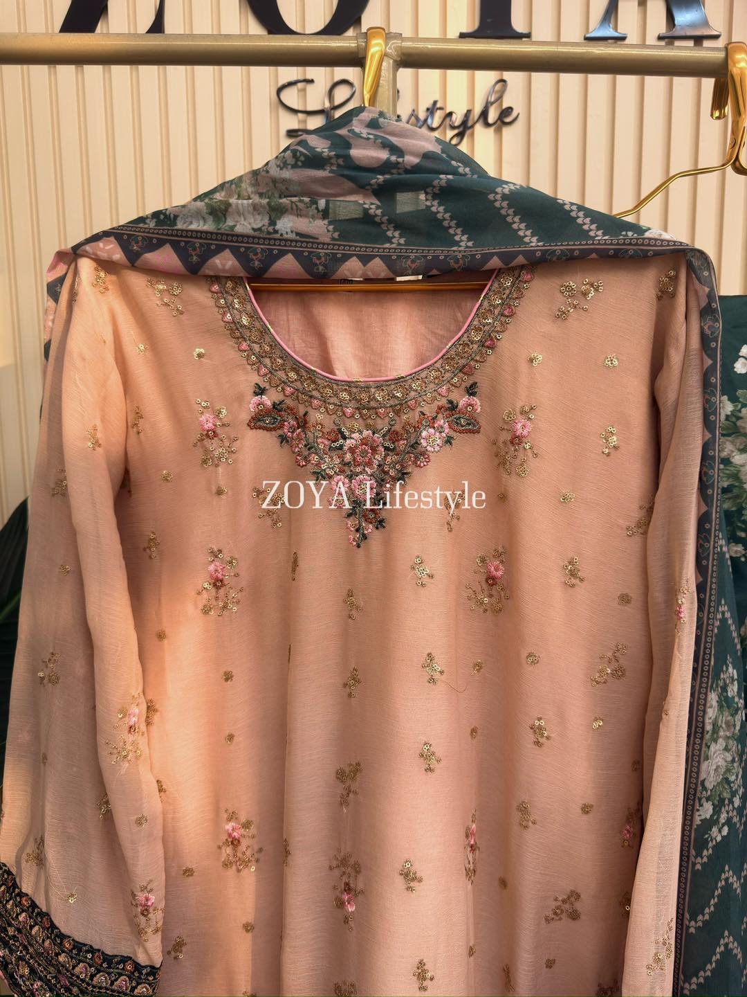 Material: Chiffon with embroidery and sequins work on all over body front. Cotton inner attatched. Silk cotton printed skirt plazzo pant. Silk printed dupatta.