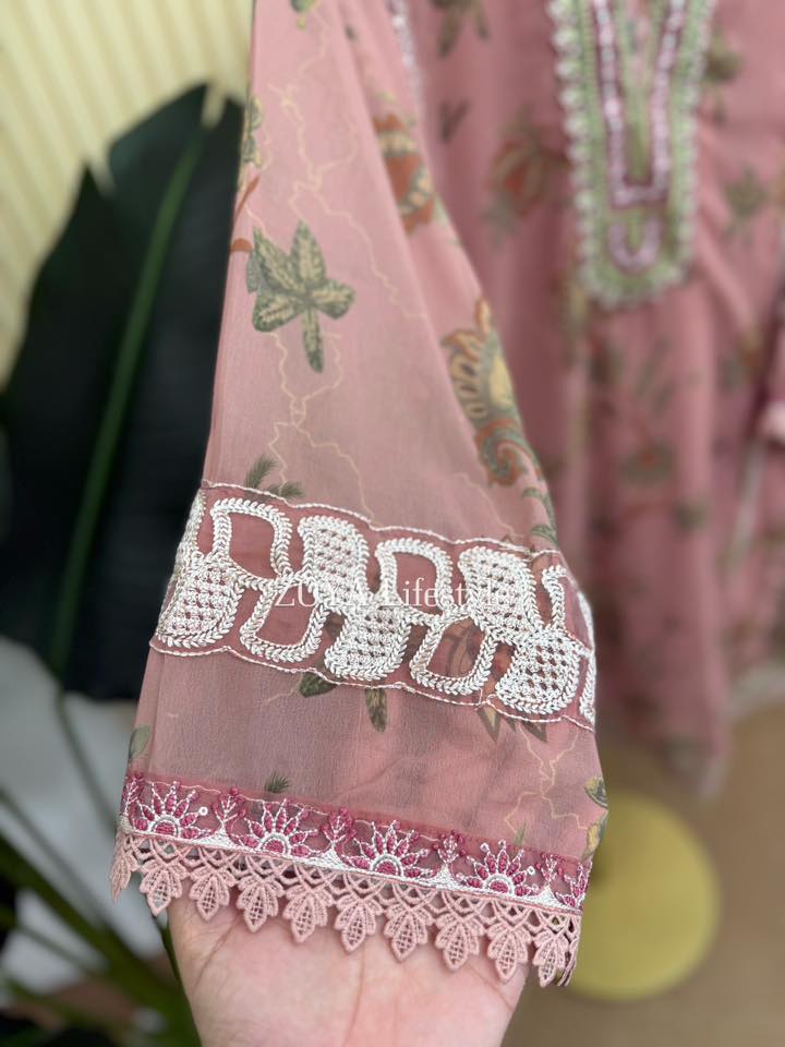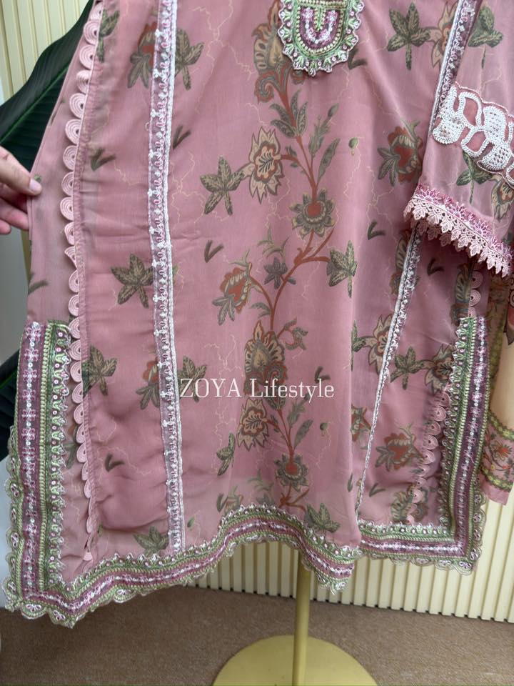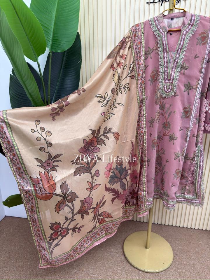 Material: Georgette kamiz with sequins embroidery work on all over body. Separated inner. Printed Maisuri orna. Cotton pant.