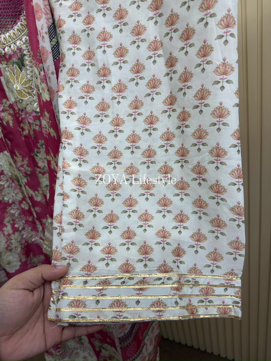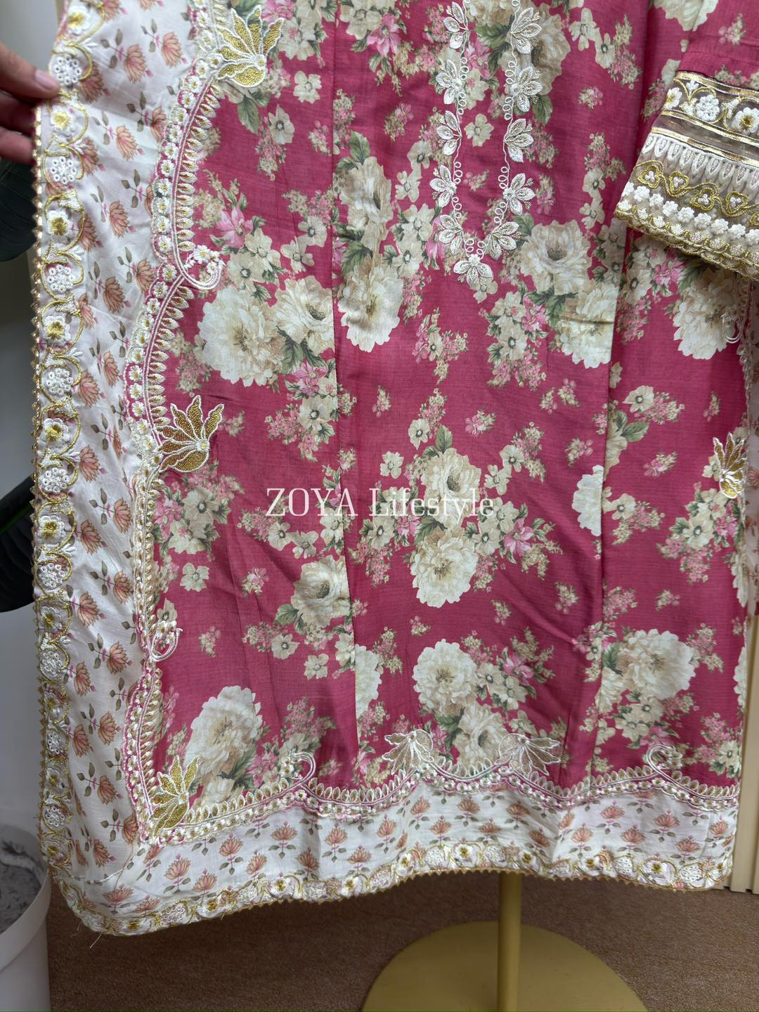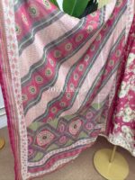 Material: Cotton with embroidery on neck, sleeves, side border and damaan. Cotton printed dupatta. Cotton pant with lace borders.