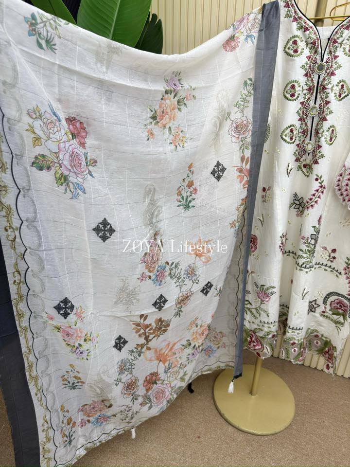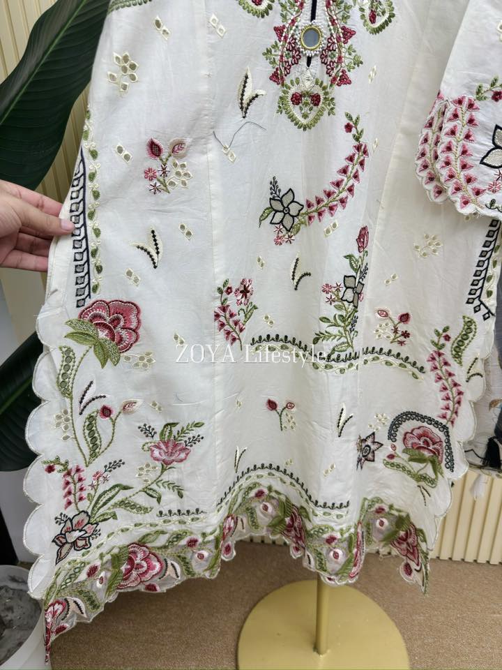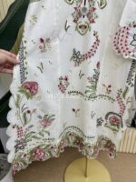 Material: Cotton with embroidery work on full dress. Maisuri Silk Orna . Cotton pant with embroidered border.