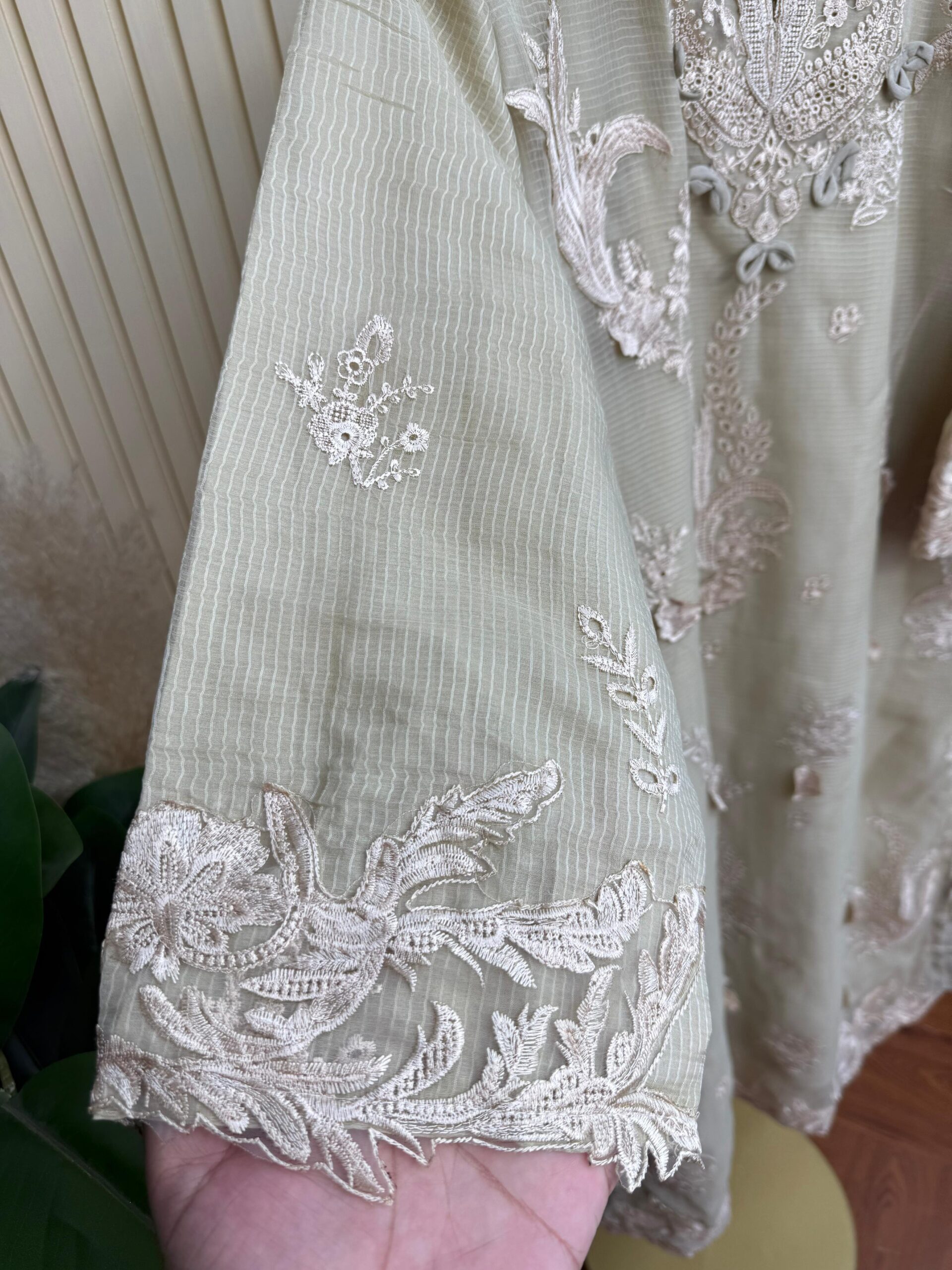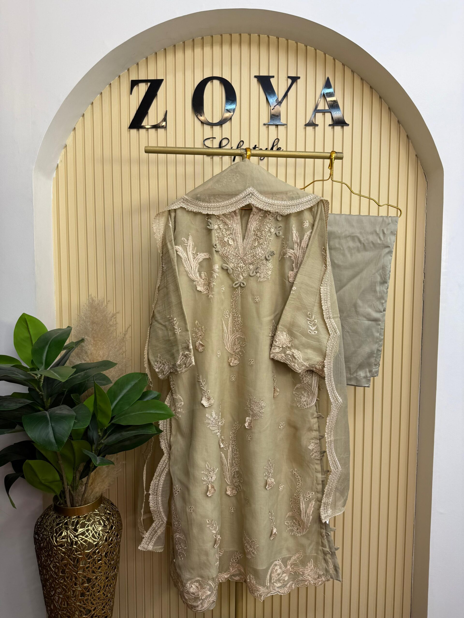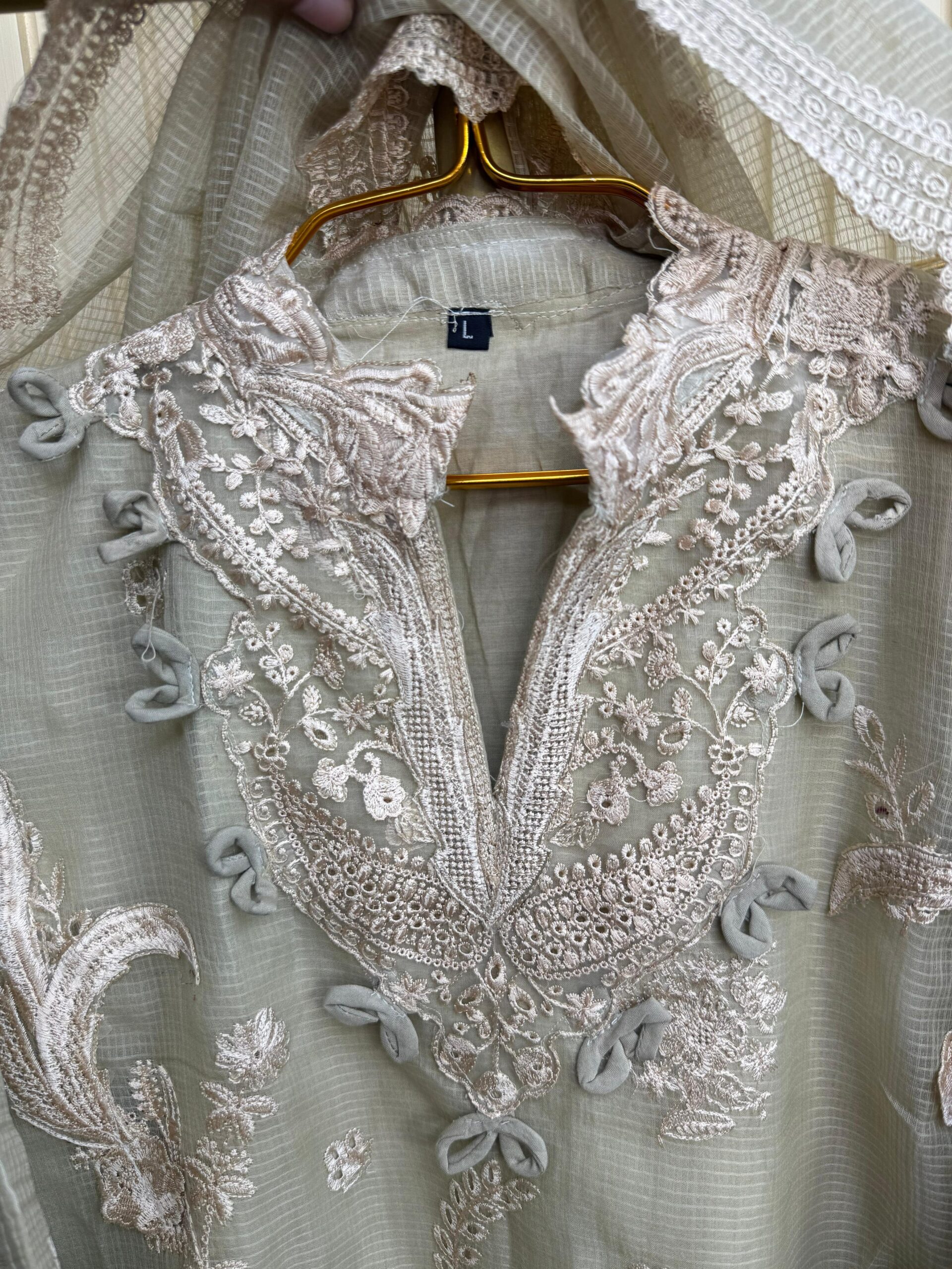 Material: Net kota cotton with heavy embroidery work. 3D flower work on whole body. Whole dress inner attached. cotton pant. Net kota embroidered dupatta.
