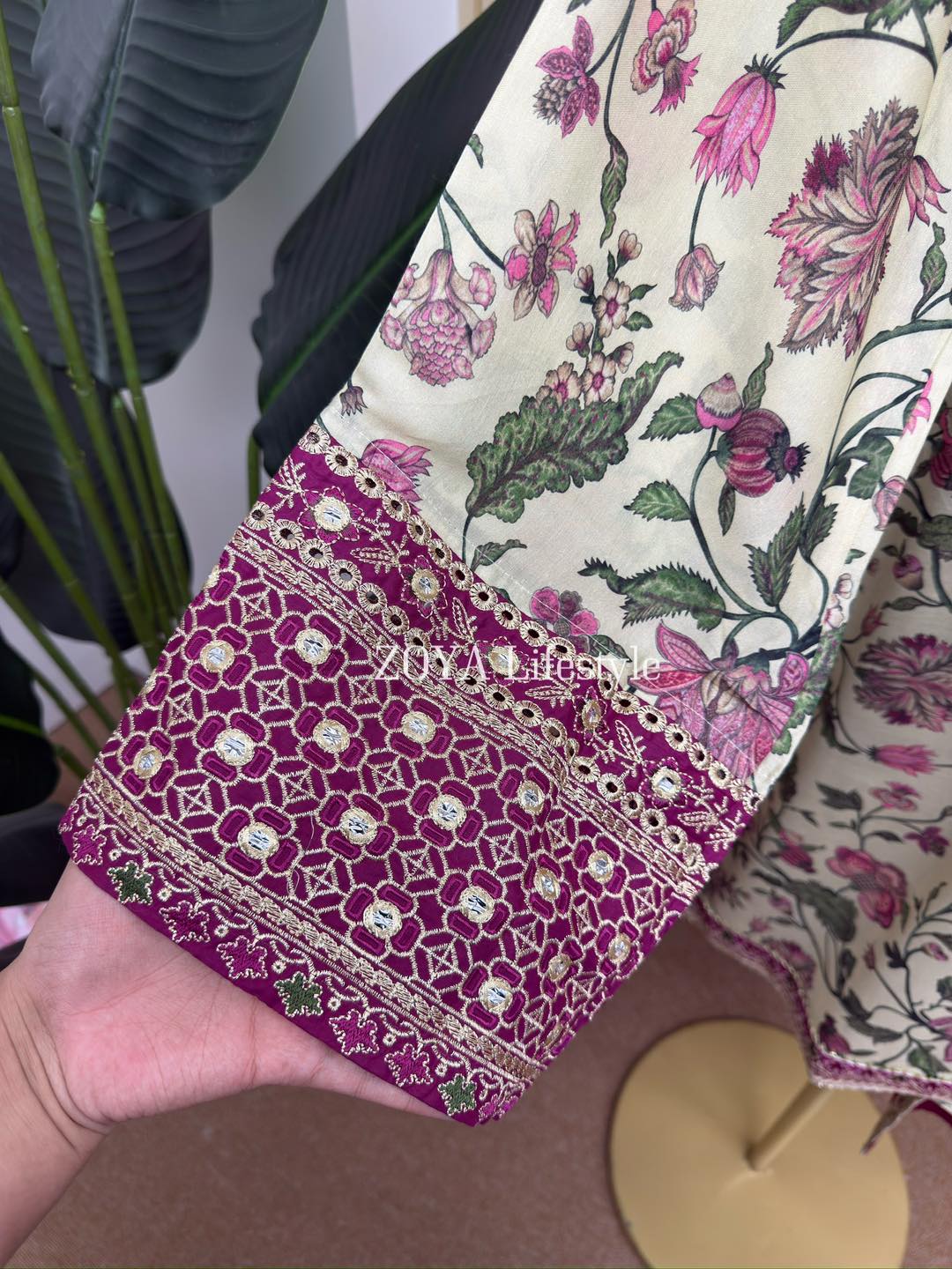 Material: Rayon silk Cotton kamiz with embroidery & foil mirror work on full front part. Pant Rayon silk Cotton with embroidery work. Silk dupatta with embroidery and screenprint.