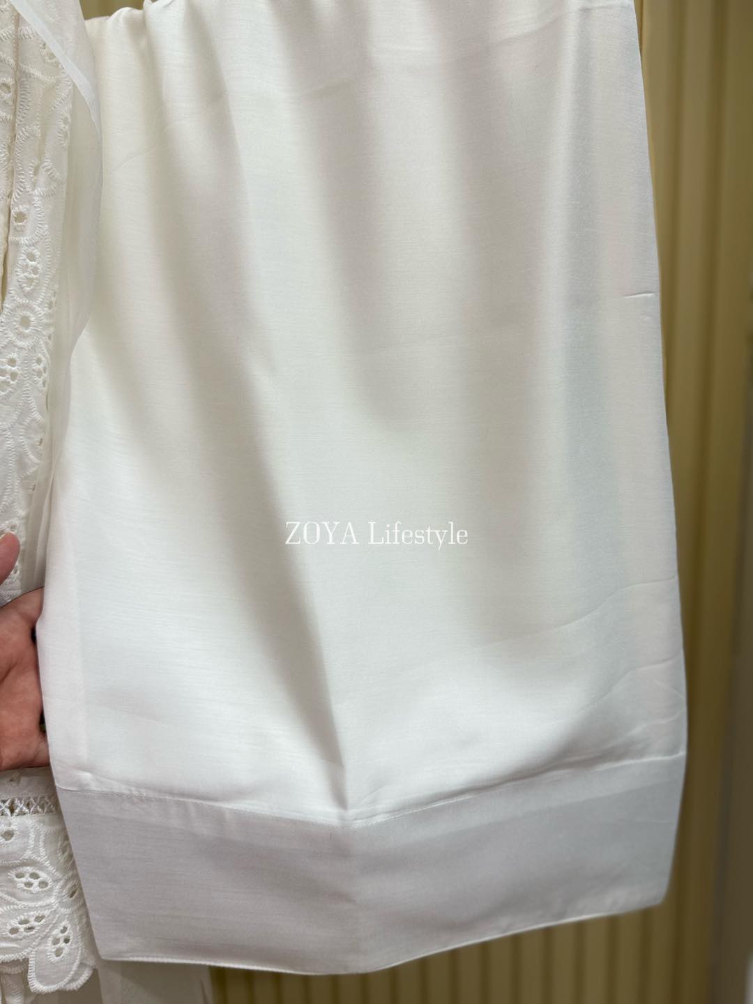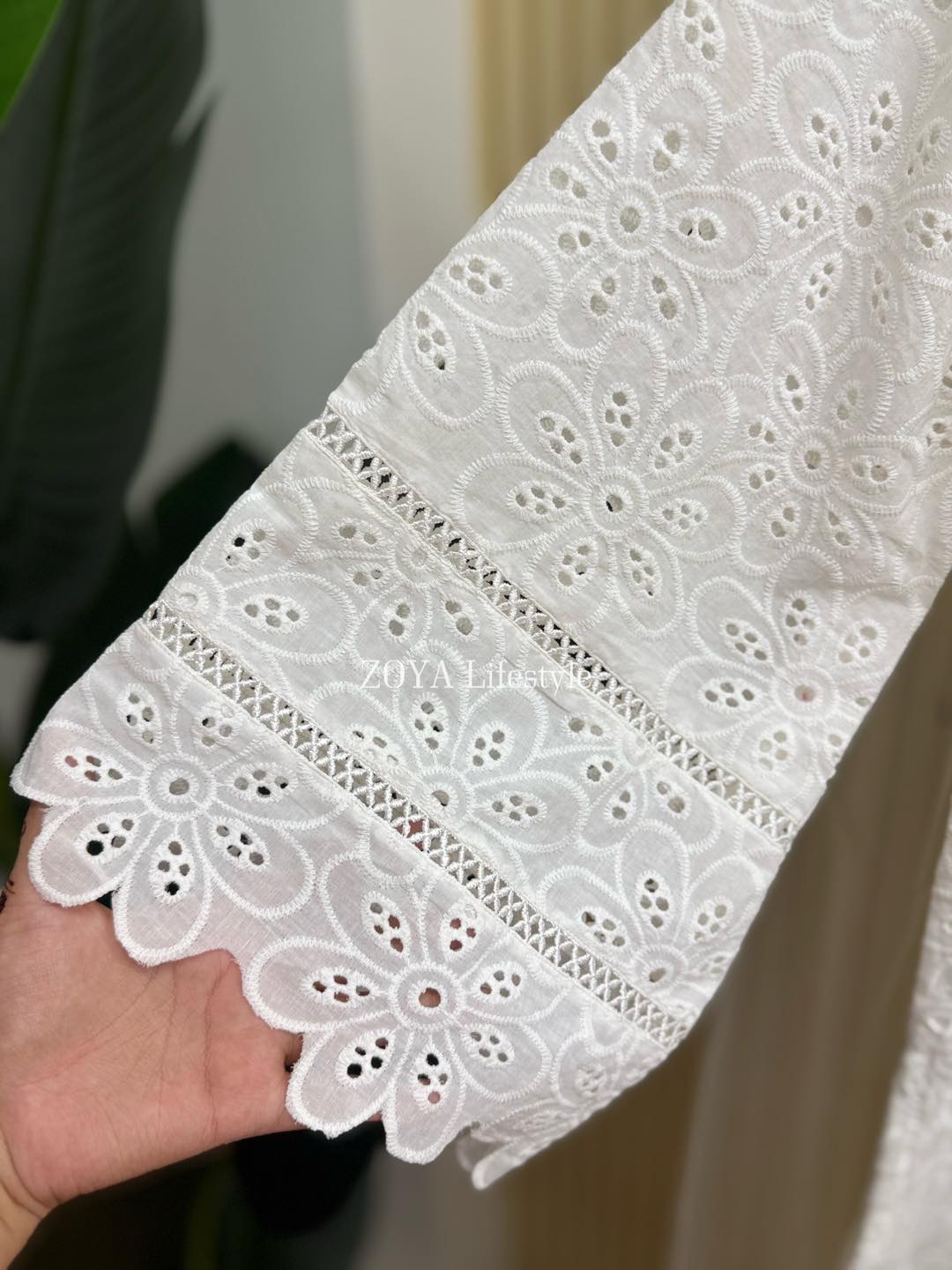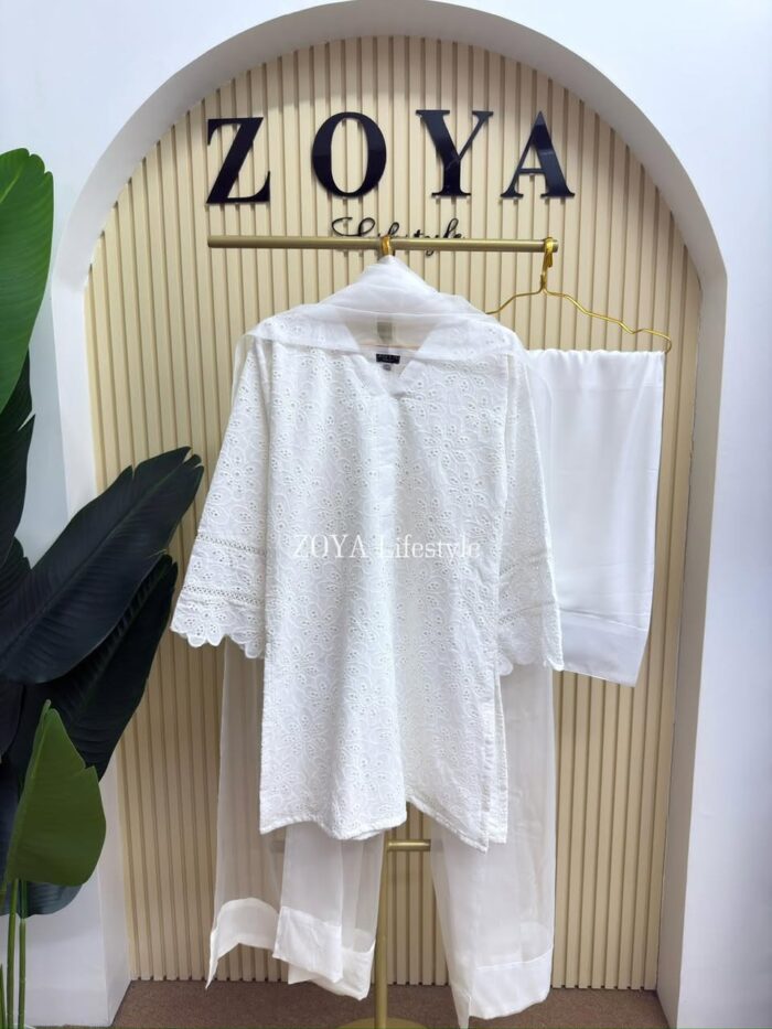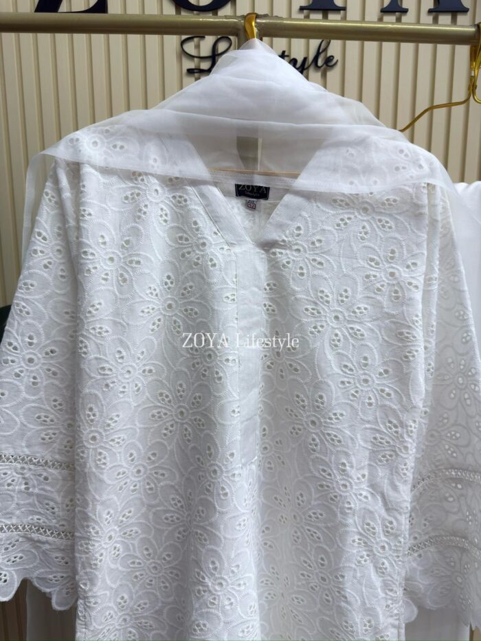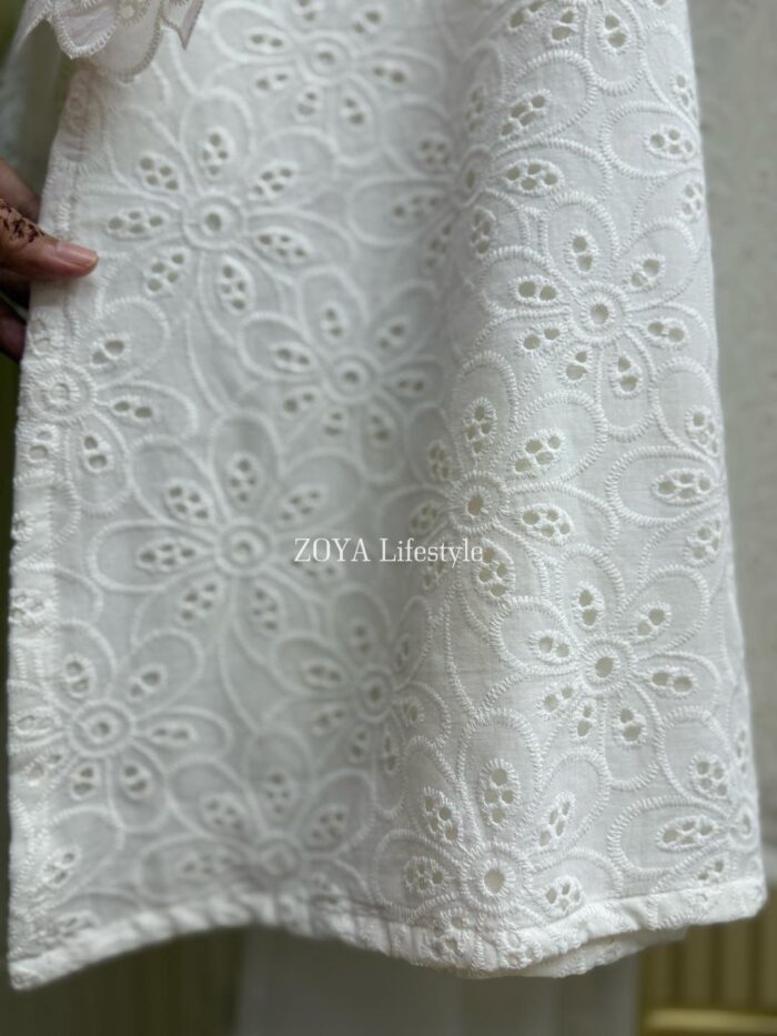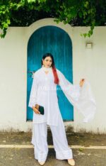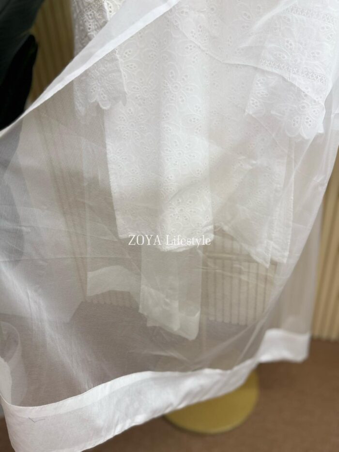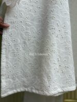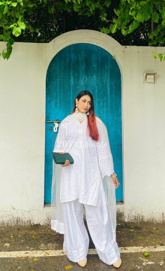 Material: Chikankari Cotton kamiz with lace work on sleeves. Full body front and back cotton inner attached. Maslin orna with panel border, Farshi pant Rayon Silk Cotton.
