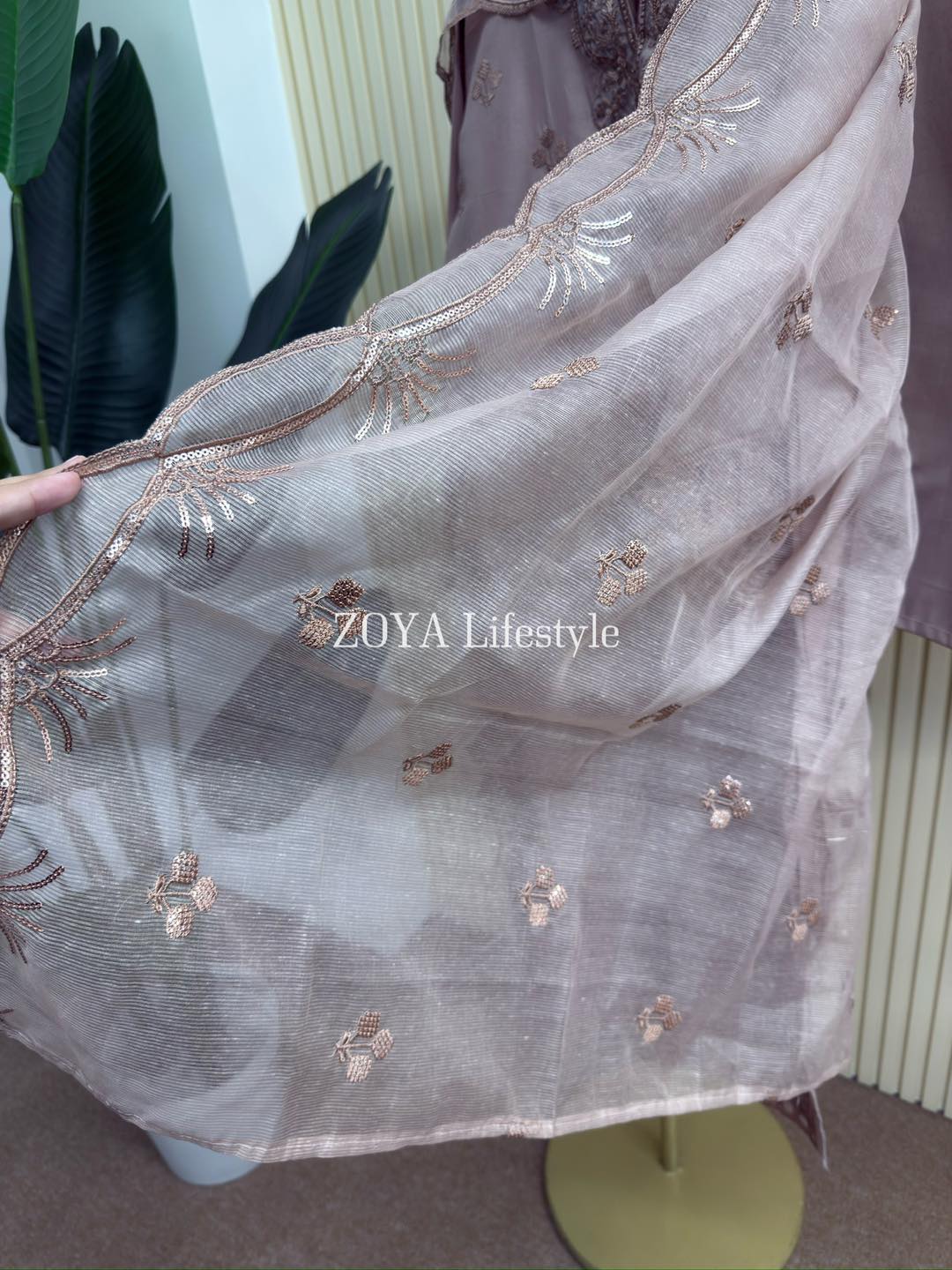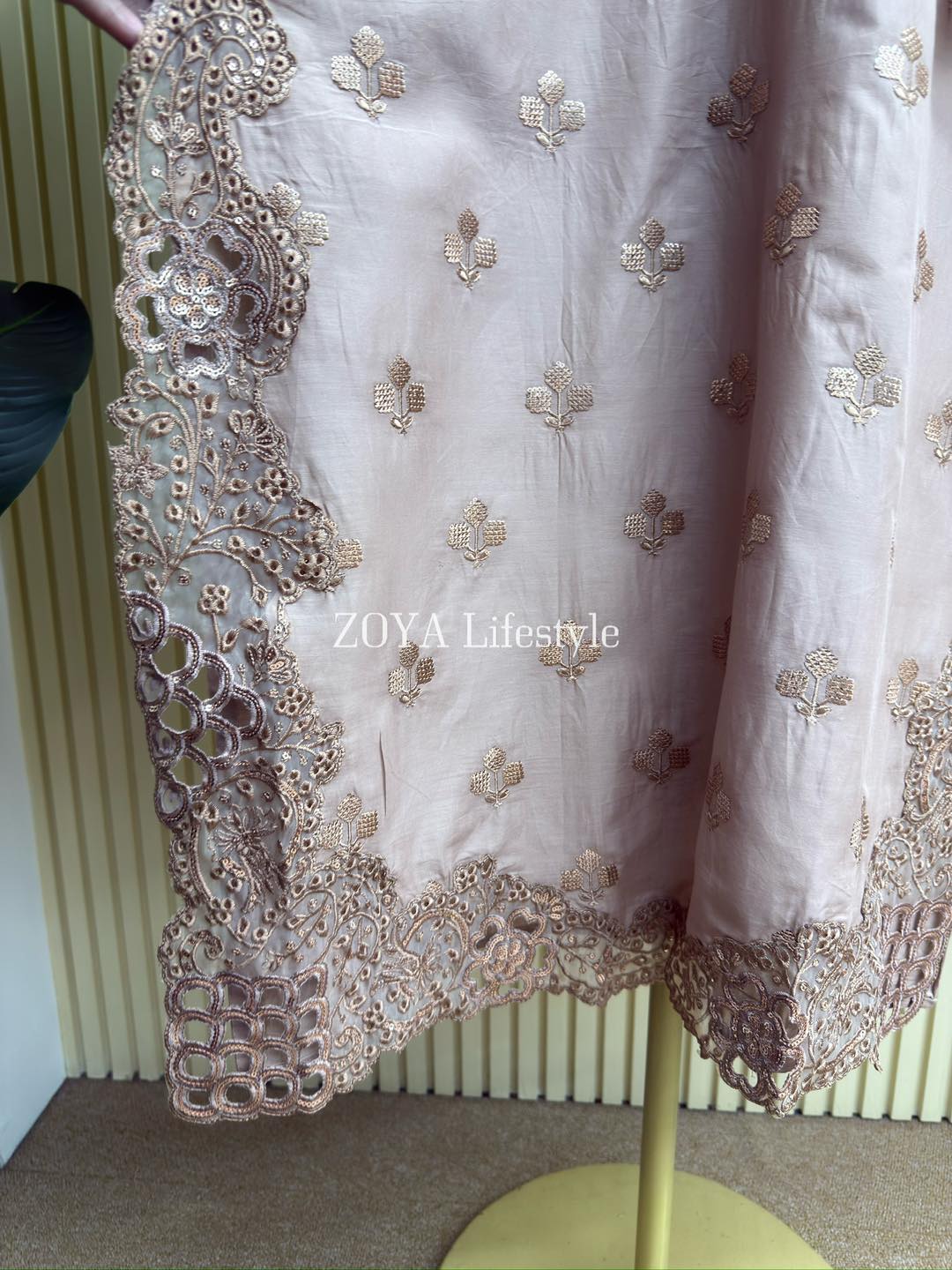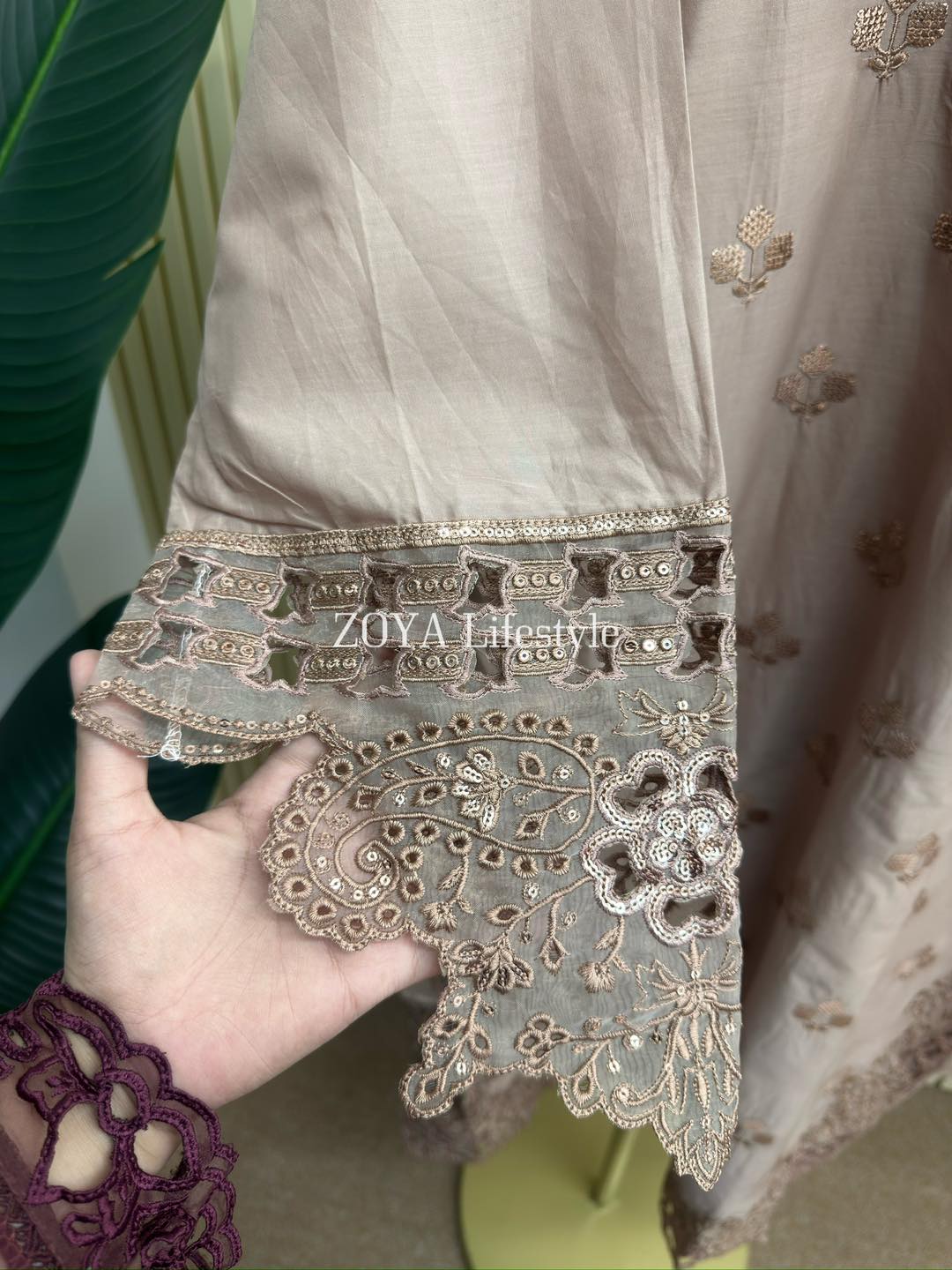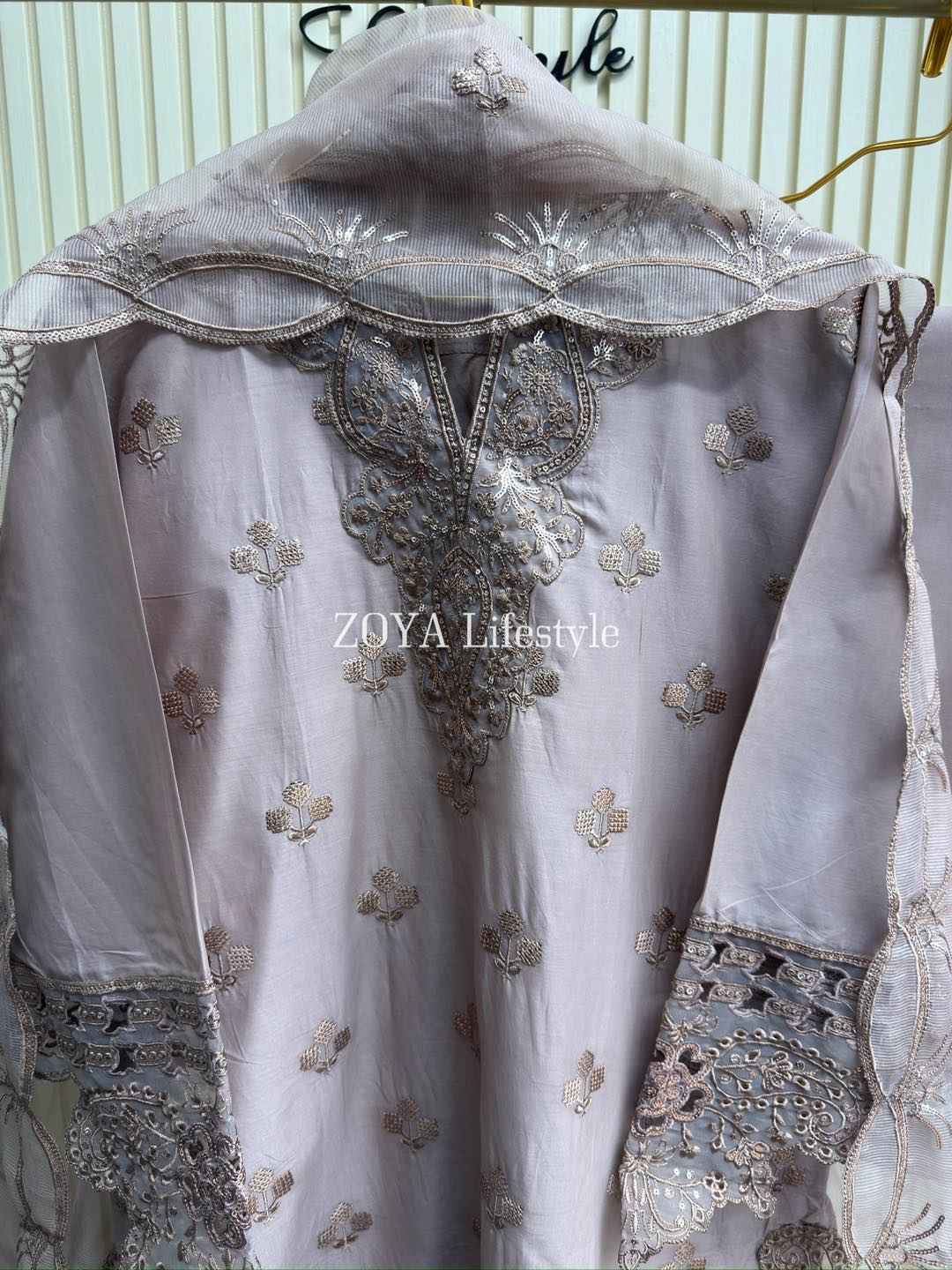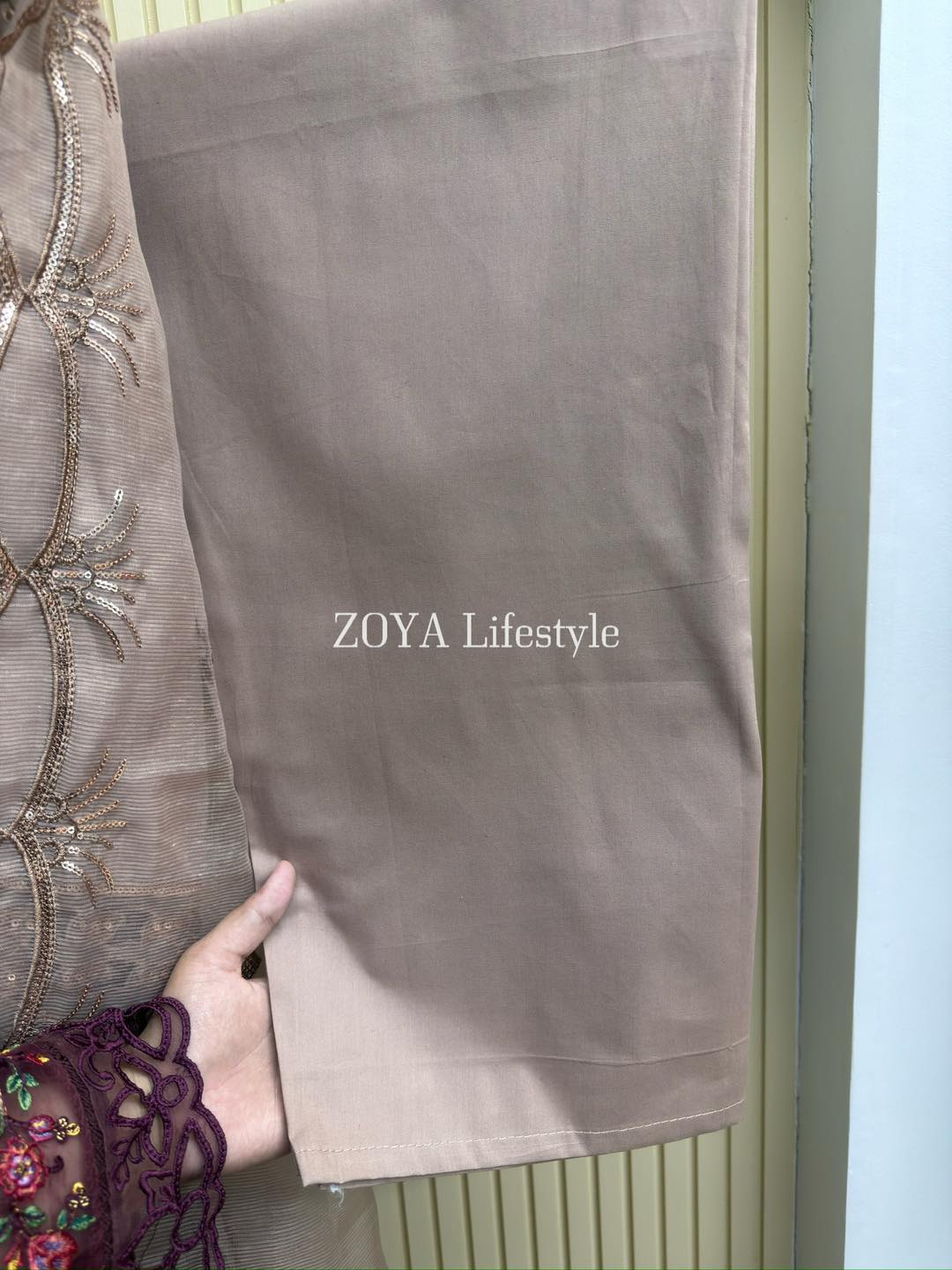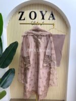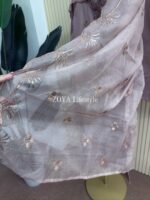 Material: Cotton with embroidery & sequins work on full kamiz. Maslin embroidered pannel on sleeves, side border and damaan. Kota orna with full of sequins embroidery. Cotton pant.