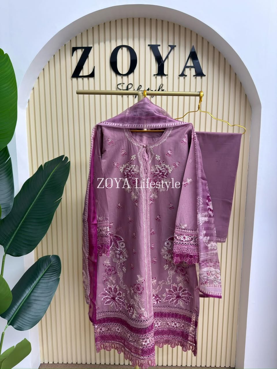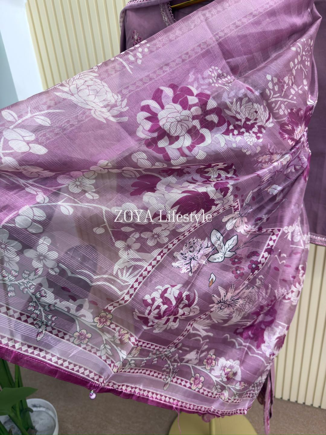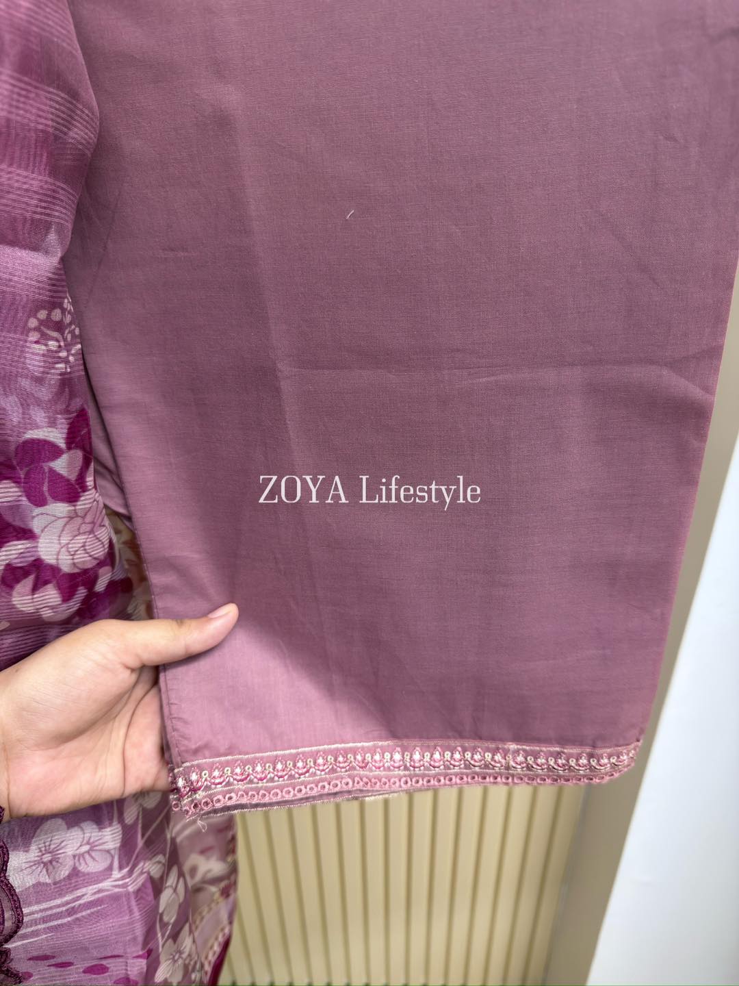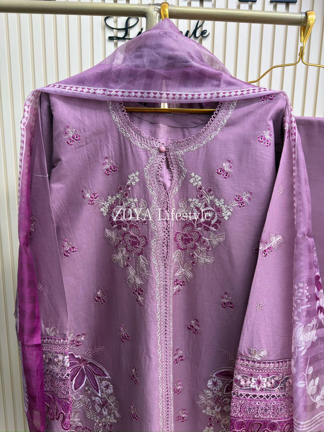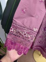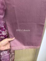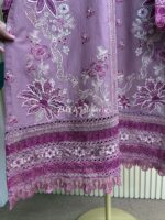 Material: Cotton with chikankari embroidery work on full dress. Maslin embroidered pannel on sleeves & front damaan. Half body front side inner attached. Kota silk printed orna. Pant cotton with embroidered border.