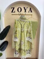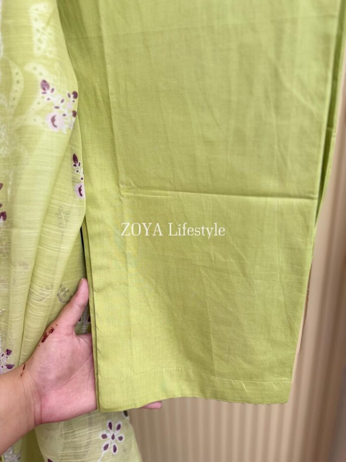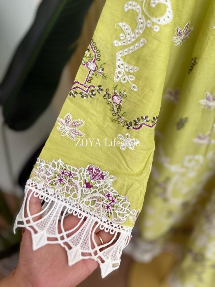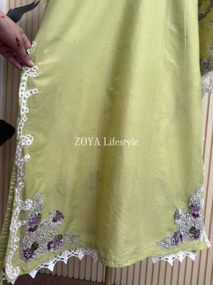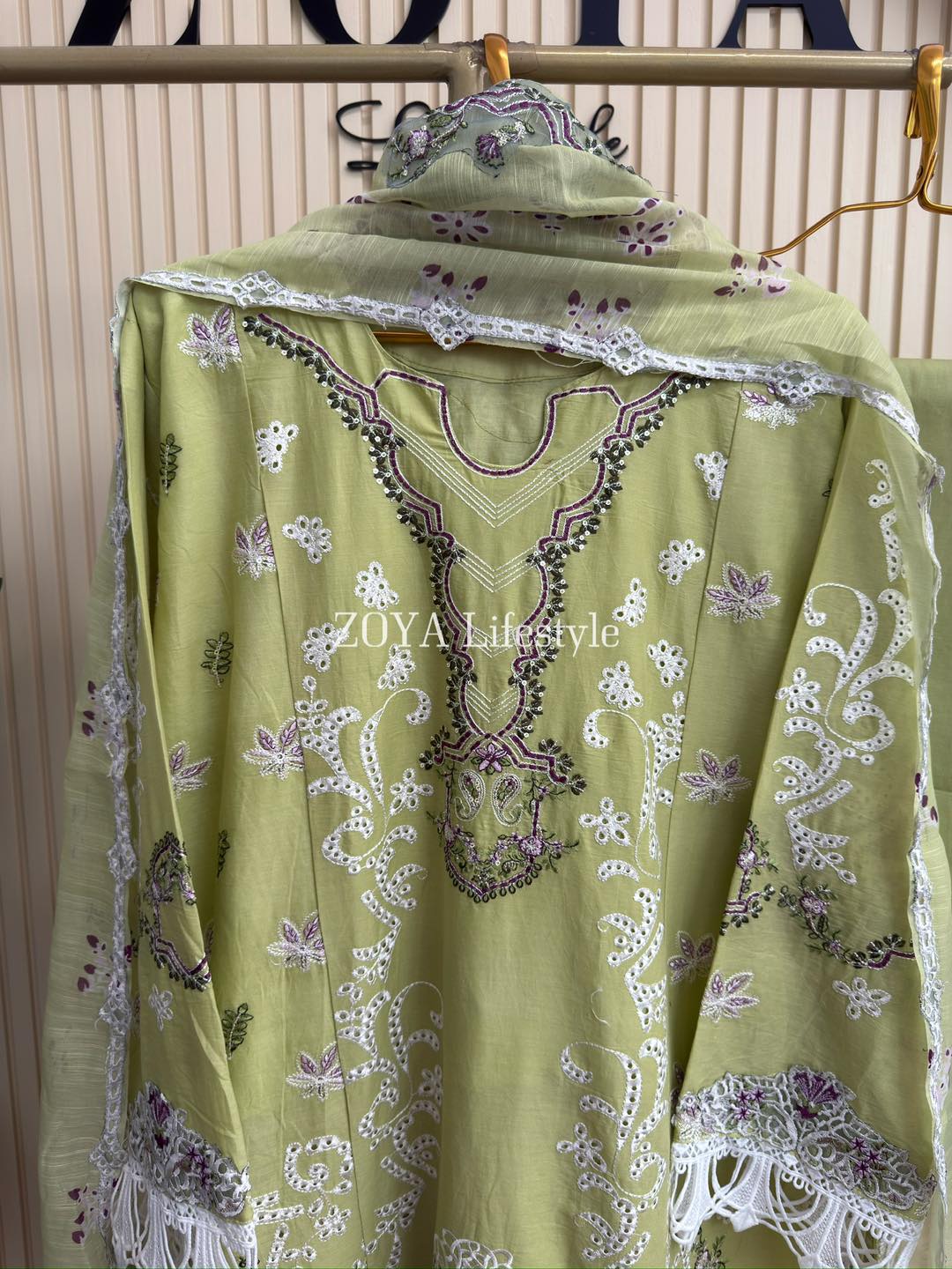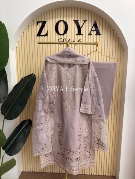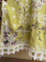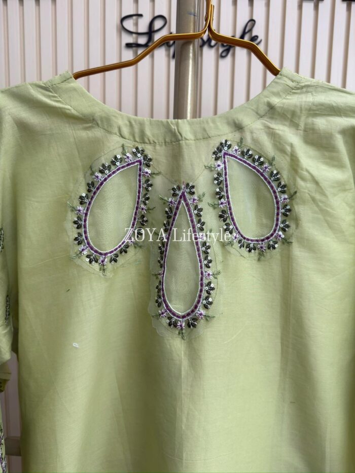 Material: Cotton with embroidery & sequins work on full kamiz front and back. Maisuri silk orna with full of embroidery. Cotton pant. Half body front side inner attached.