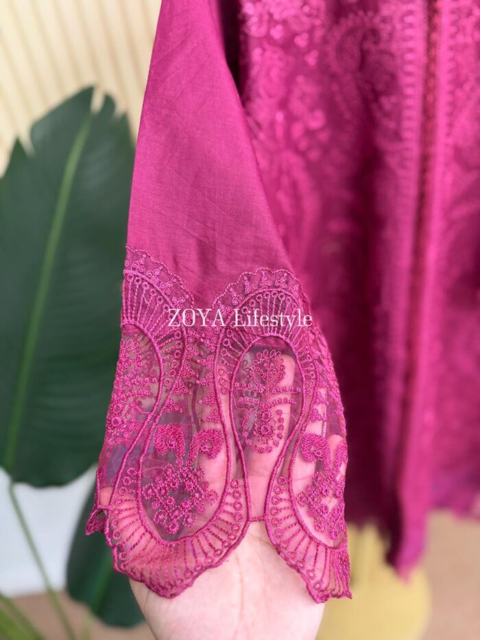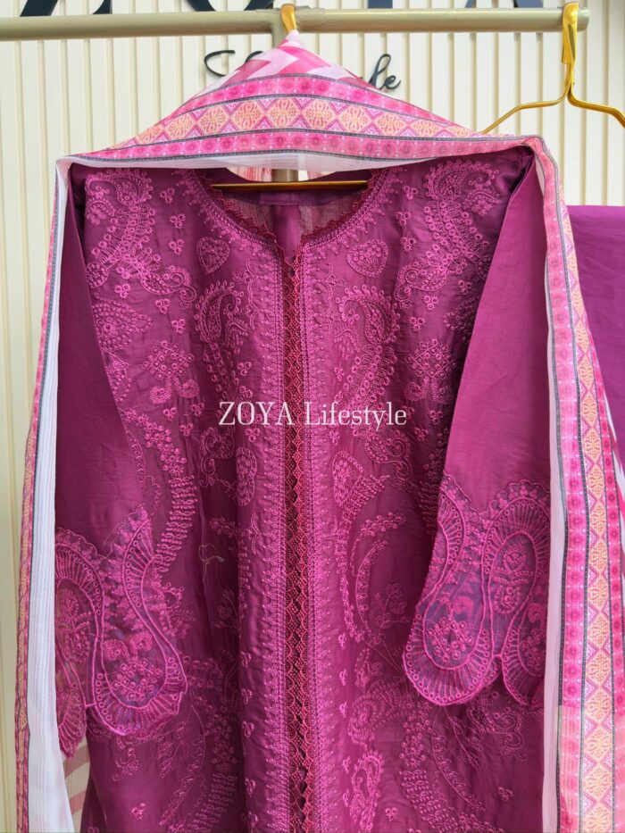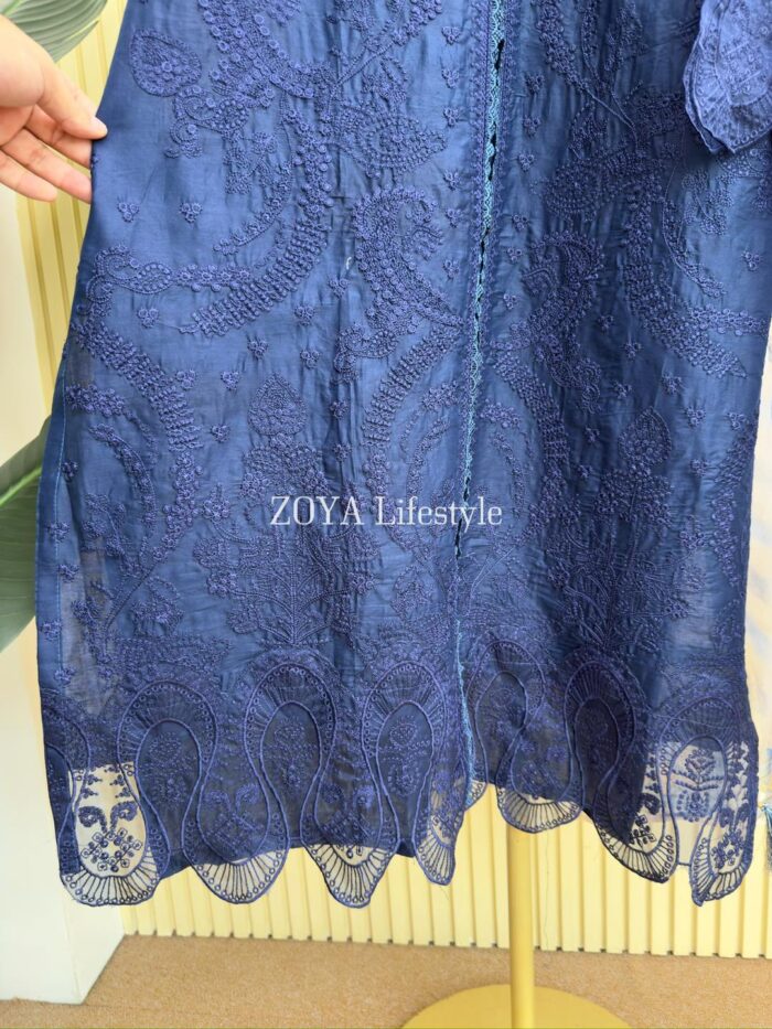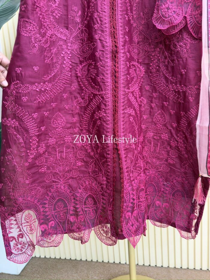 Material: Cotton with embroidery work on full body. Maslin embroidered pannel on sleeves and damaan. Maslin silk printed orna. Pant cotton.