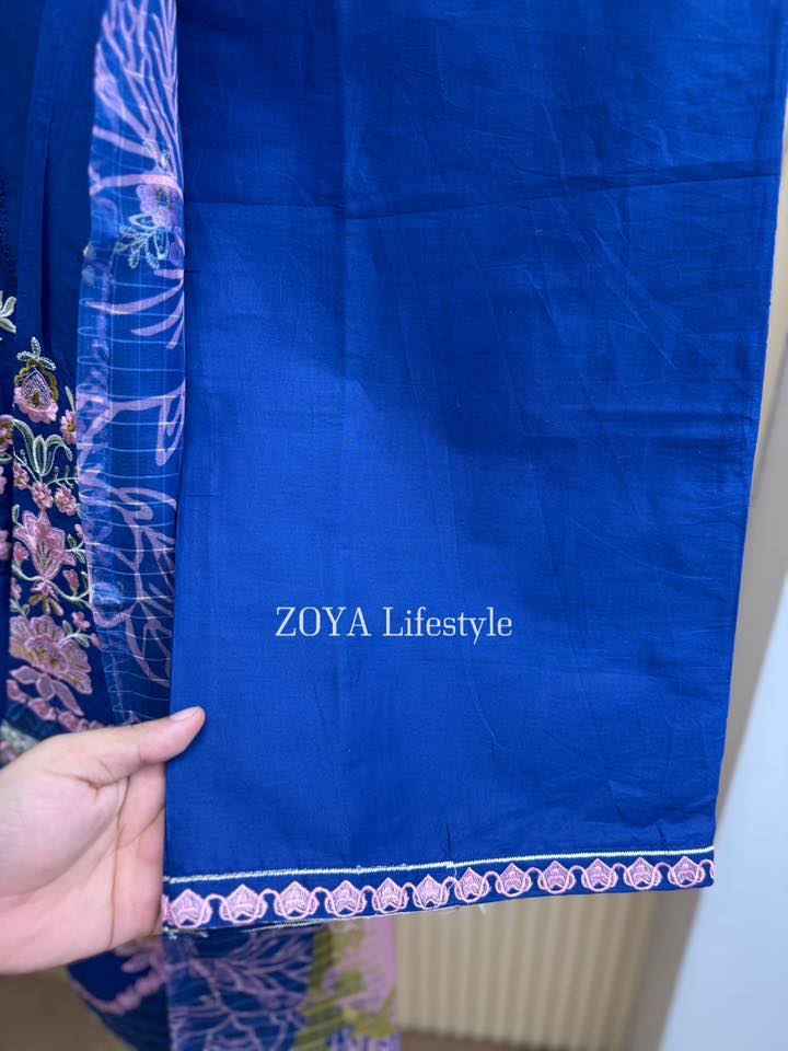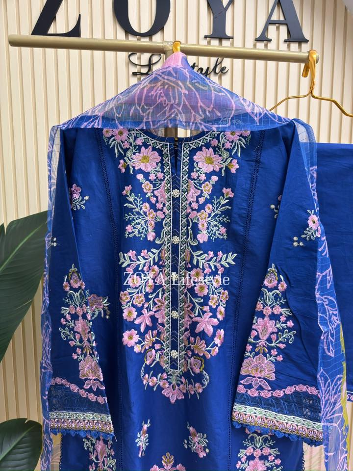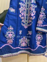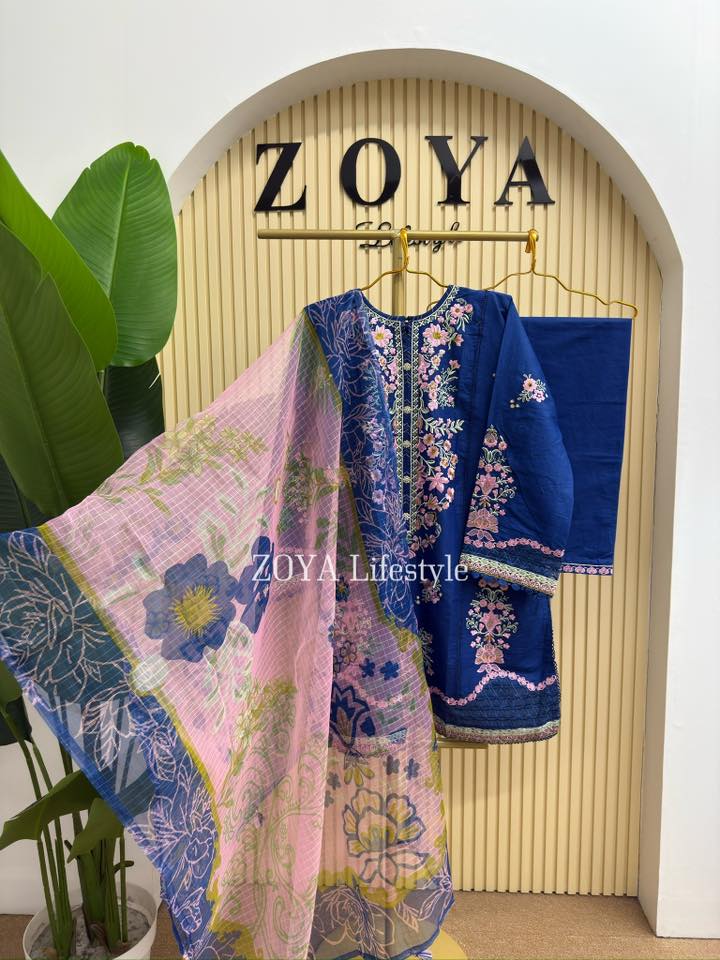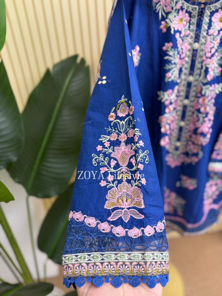 Material: Cotton kamiz with embroidery work on full front partn. Maslin embroidered sleeves & Daman. Cotton pant with embroidered border.