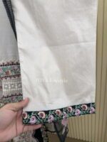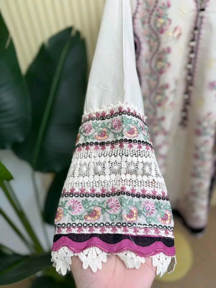 Material: Cotton kamiz with embroidery work & chikamkari on full body. Only front inner. Embroidered and lace in sleeves. Embroidered border Pant Cotton. Printed Kota silk orna.