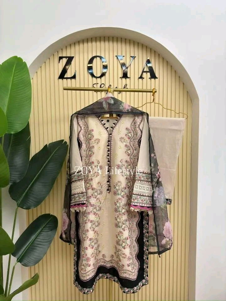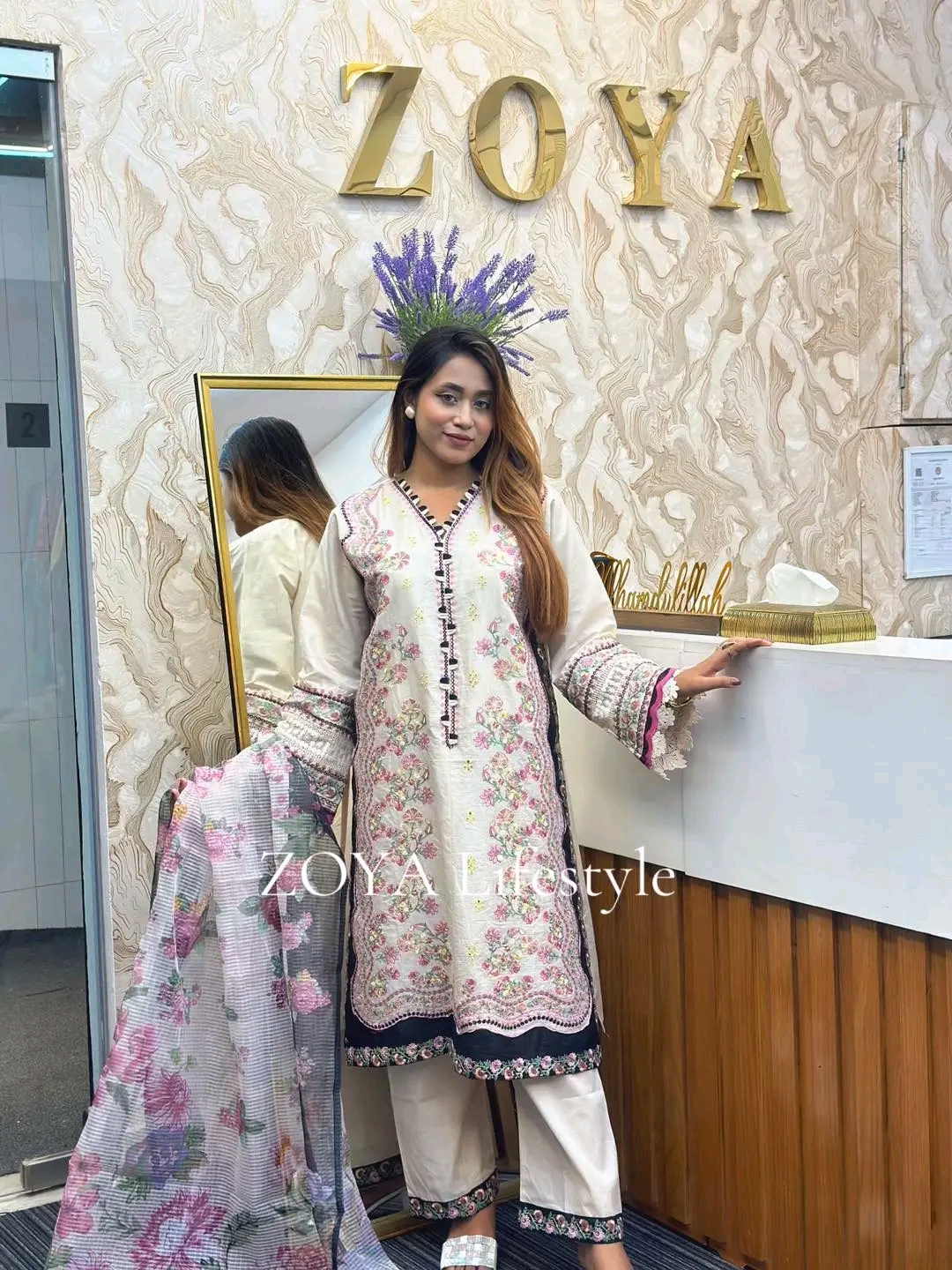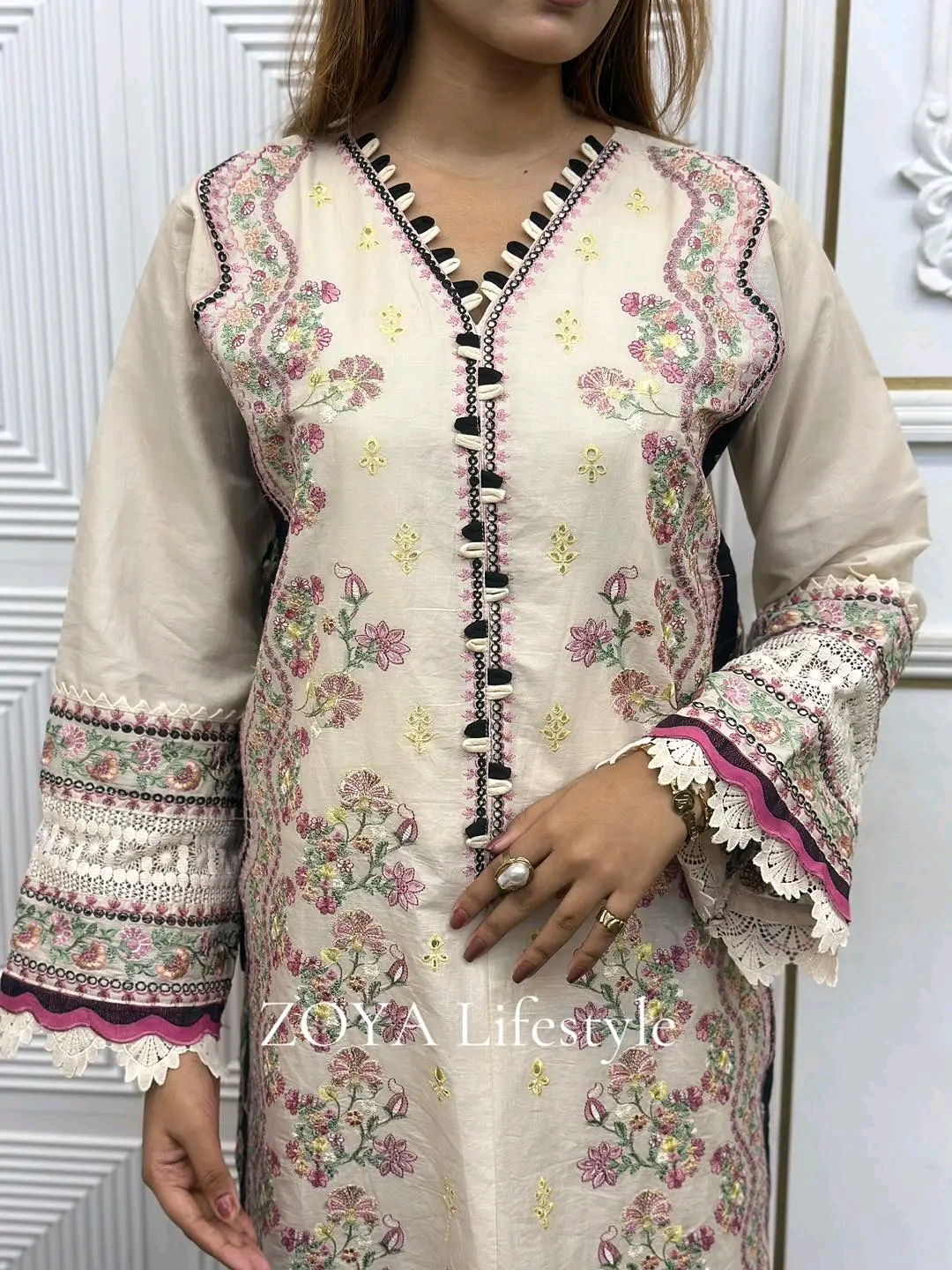 Material: Cotton kamiz with embroidery work & chikamkari on full body. Only front inner. Embroidered and lace in sleeves. Embroidered border Pant Cotton. Printed Kota silk orna.