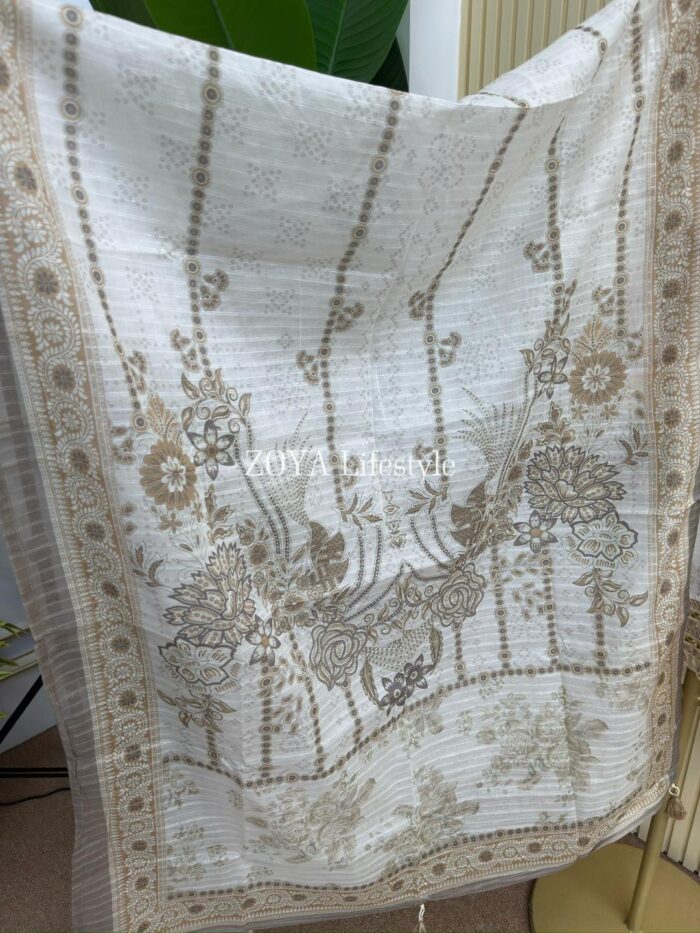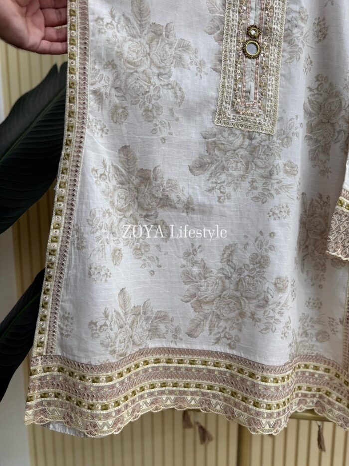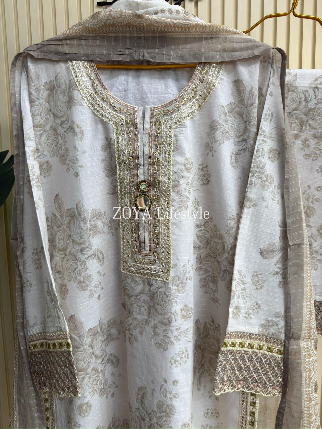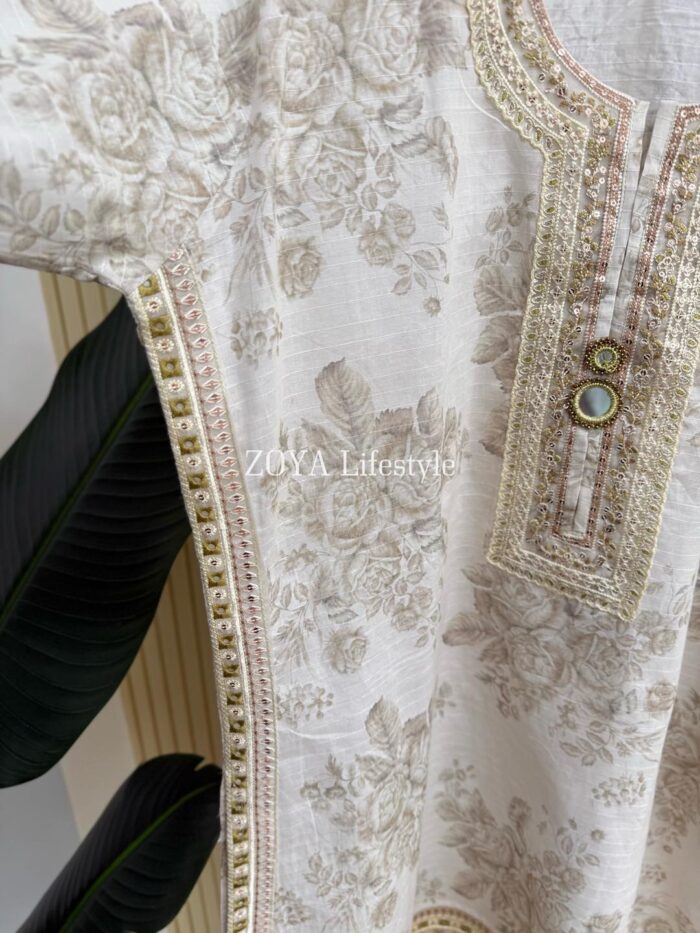 Material: Jaquard Cotton kamiz with jori embroidery & Foil mirror work on neck, sleeves, front side borders and front side Damaan. Kota cotton orna. Loose Pant Cotton with jori embroidered work.