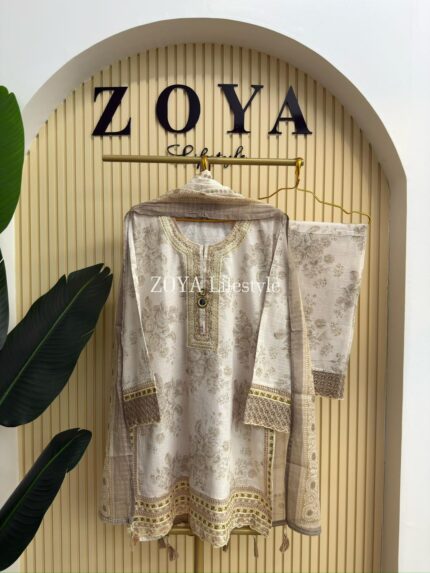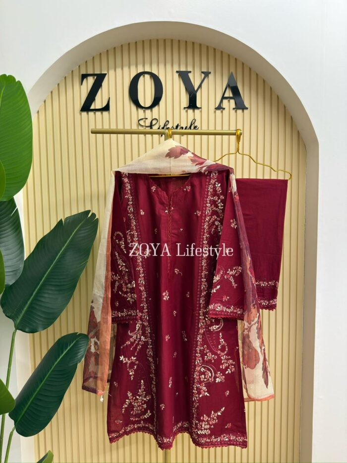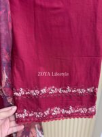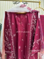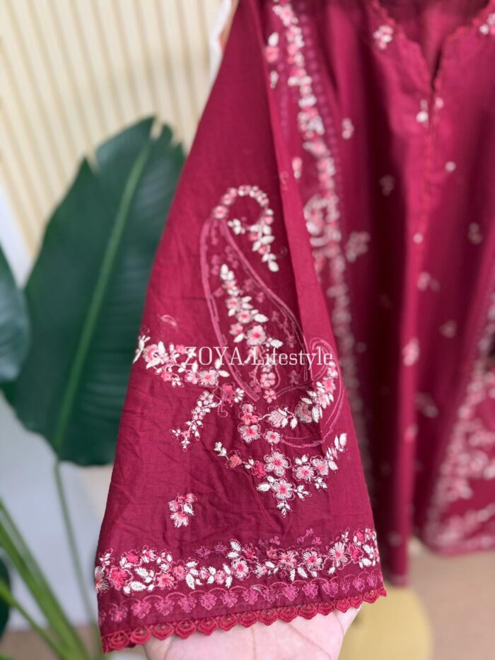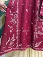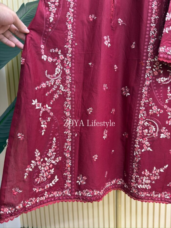 Material: Cotton kamiz with jori embroidery work on full body. Lace borders on sleeves, neck & damaan. Kota printed orna. Loose Pant Cotton with embroidered work.