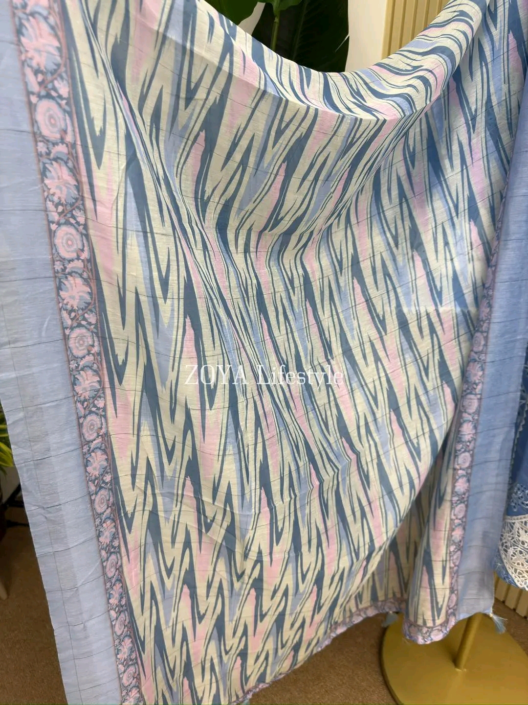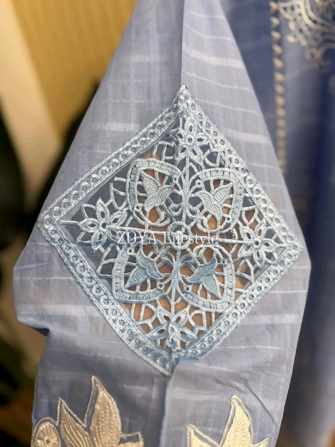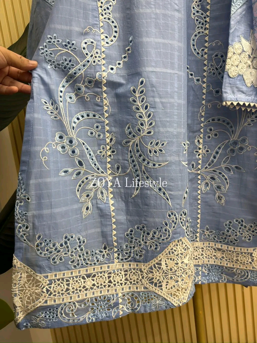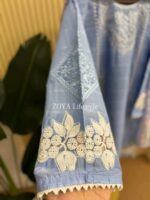 Material: stripe Cotton kamiz with chikankari embroidery work on full body. Maslin embroidered borders on sleeves & damaan. Half body inner attached on front part. Maisuri cotton printed orna. Pant Cotton with embroidered work.