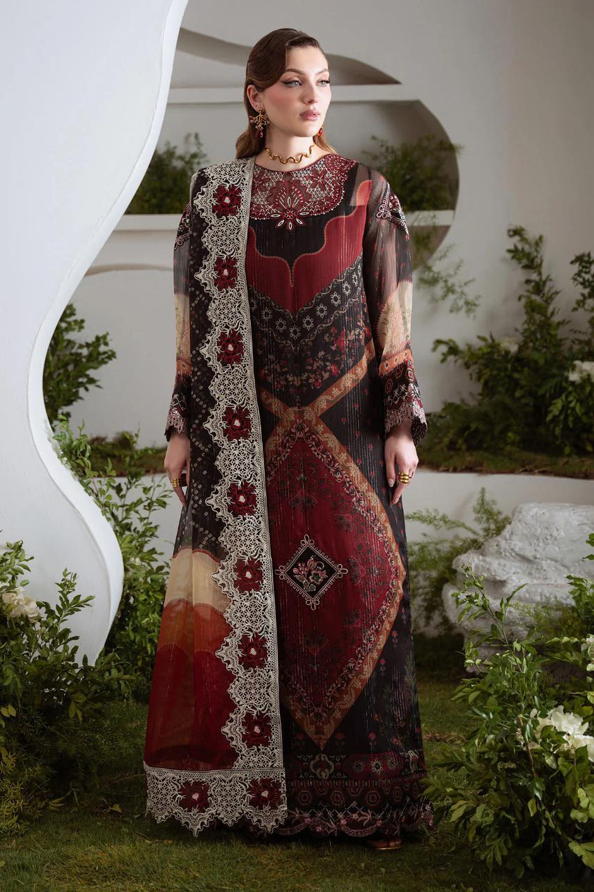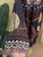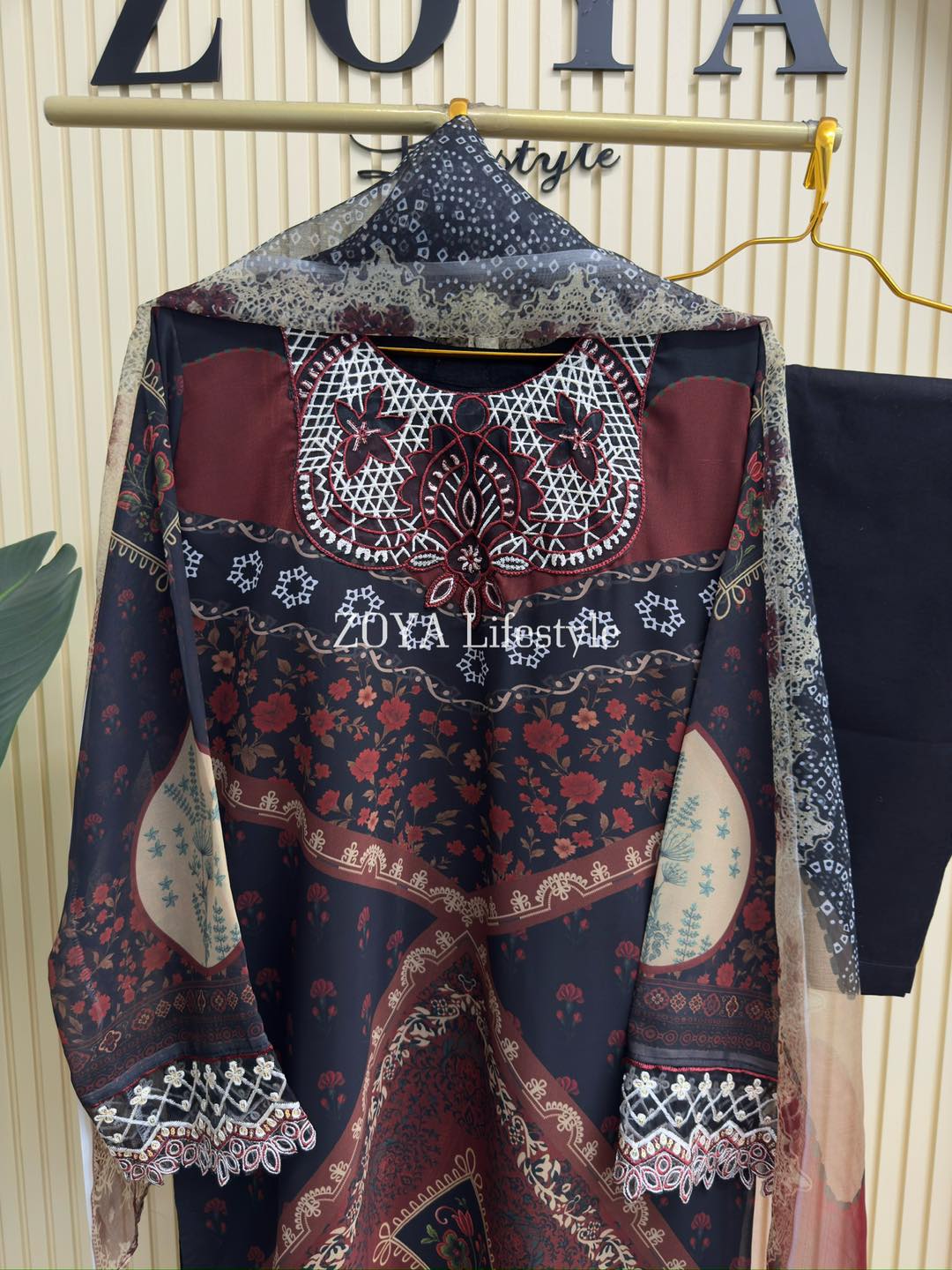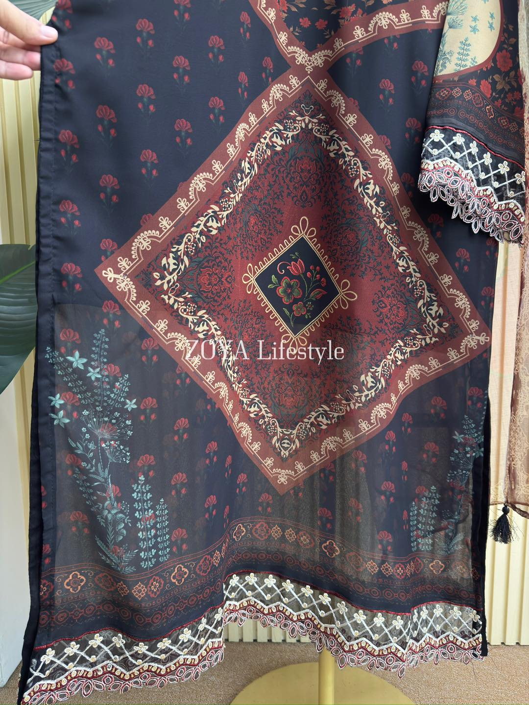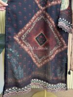 Material: Premium Georgette kamiz with embroidery work on neck, sleeves, front damaan. Full body inner attatched. Maslin orna with all over print. Pant Cotton.
