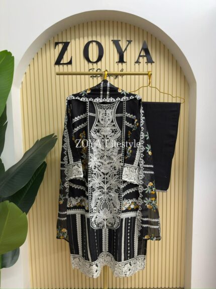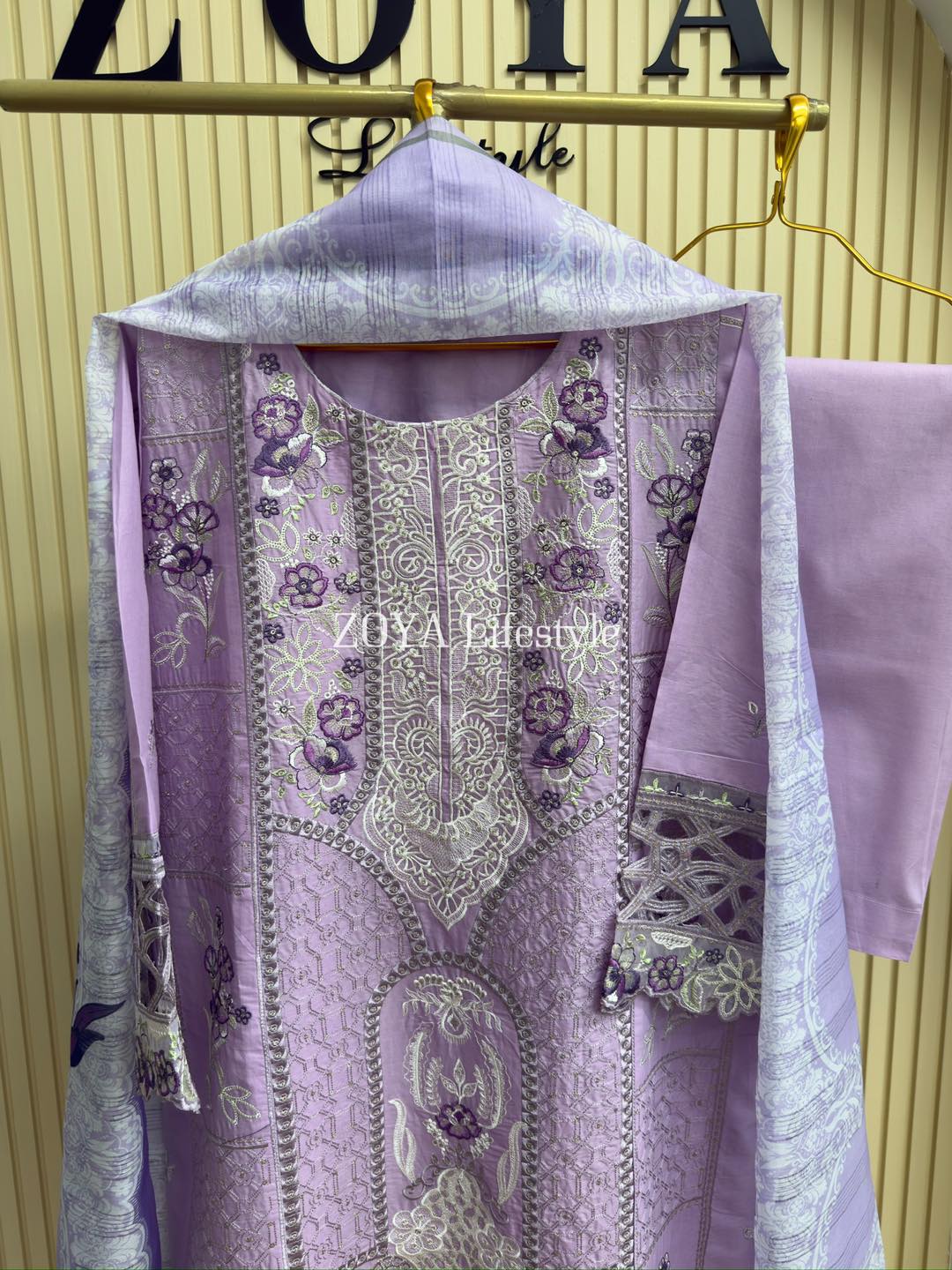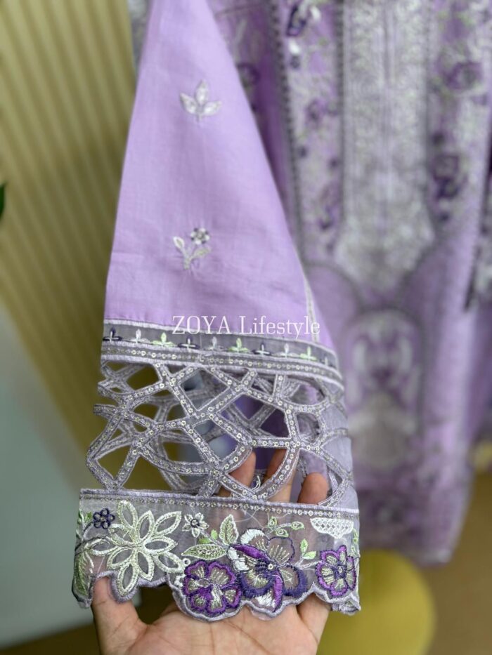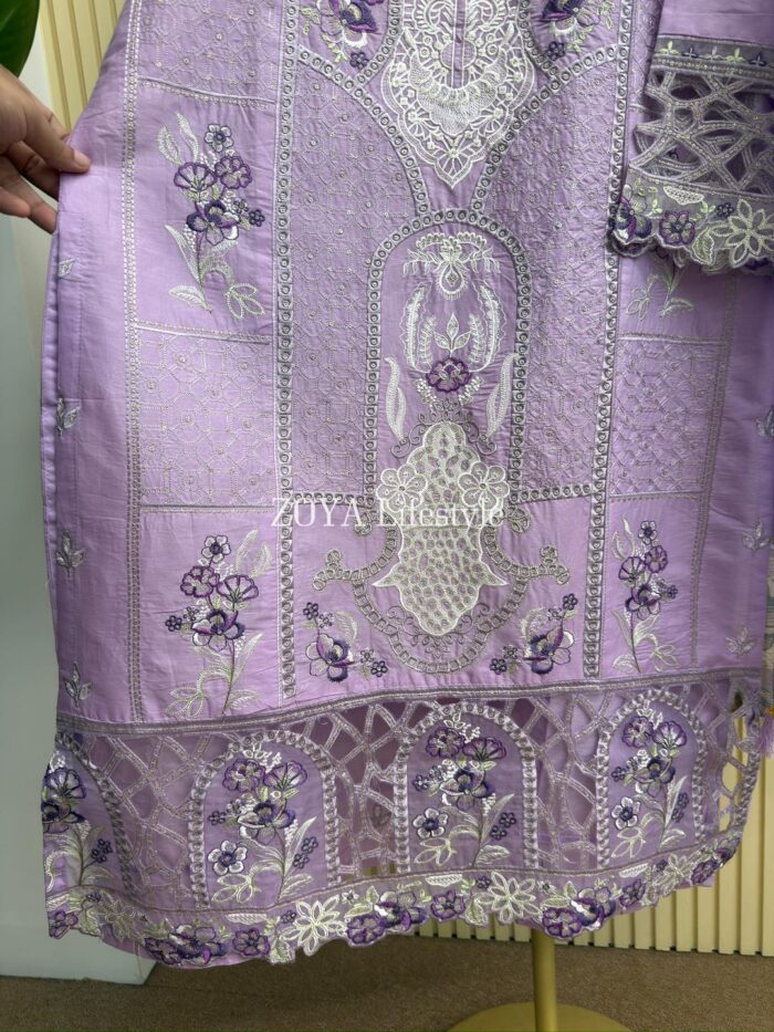 Material: cotton with embroidery work on full body. Maslin cutworked pannel on sleeves and damaan. kota cotton orna. Pant cotton.
