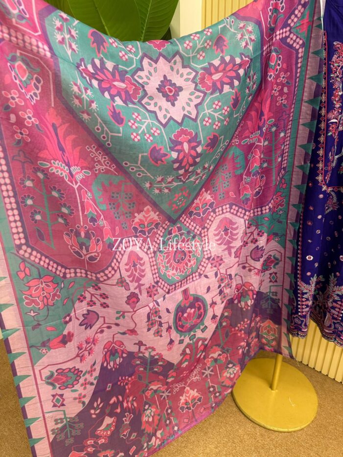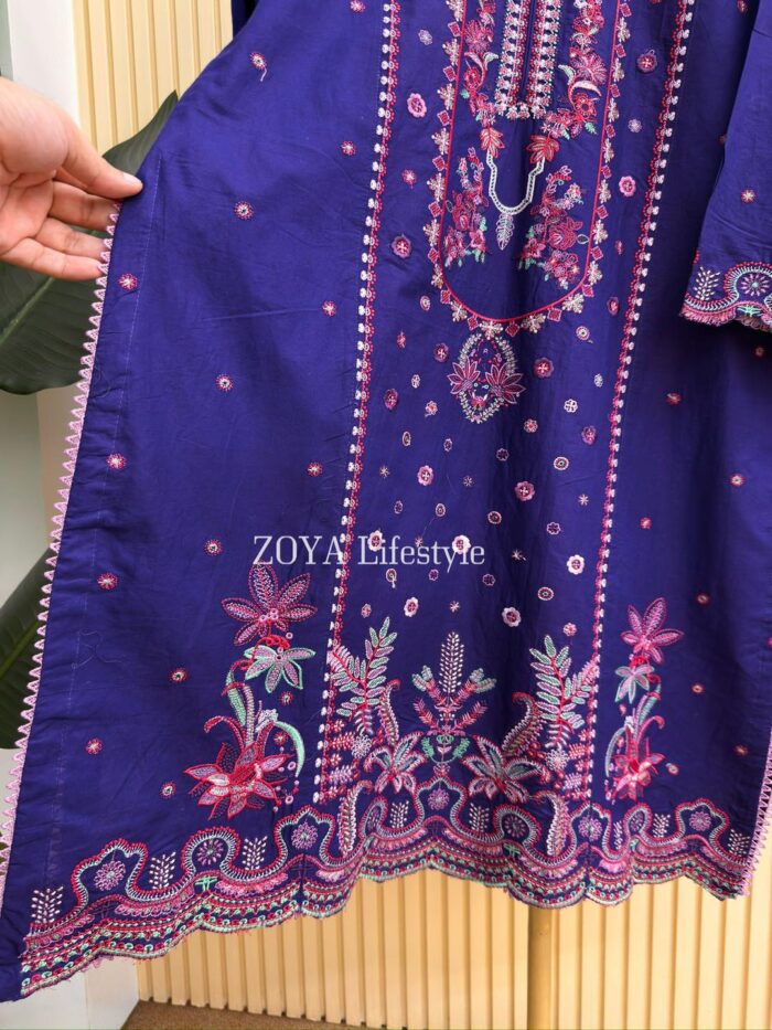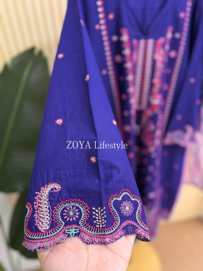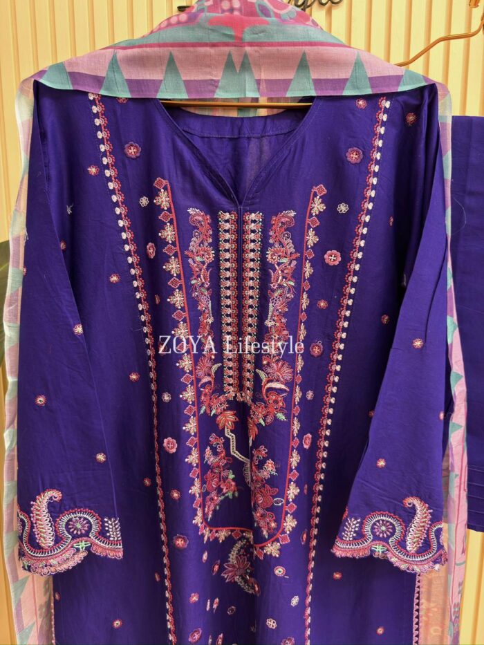 Material: cotton with embroidery work on full body. Cotton pant with design. Maisuri silk cotton printed dupatta.